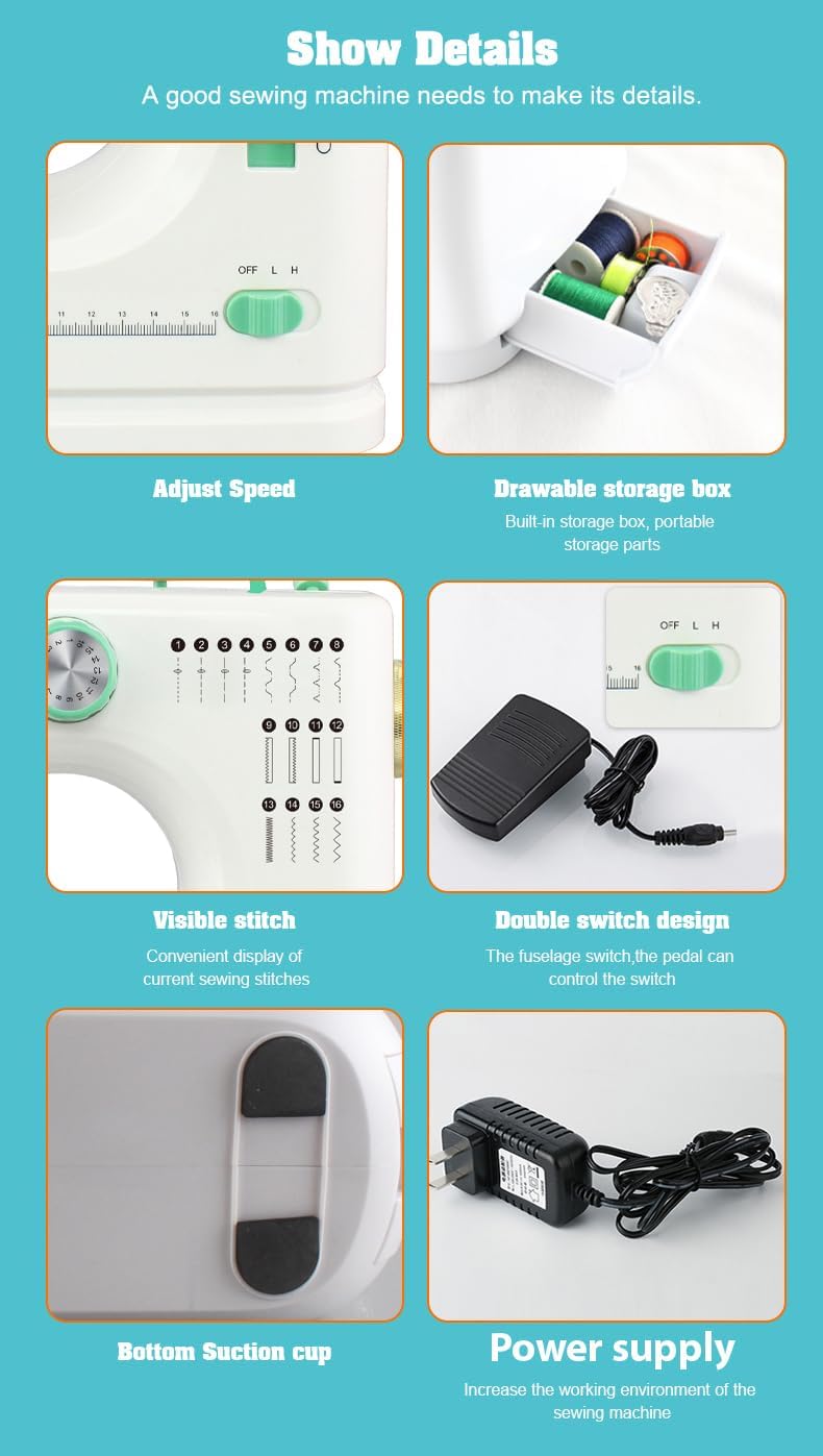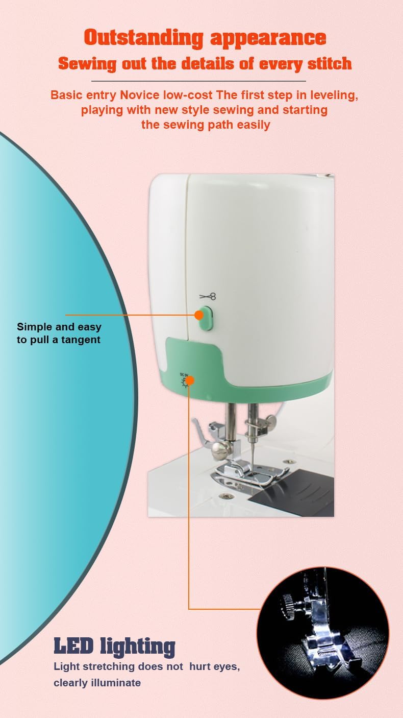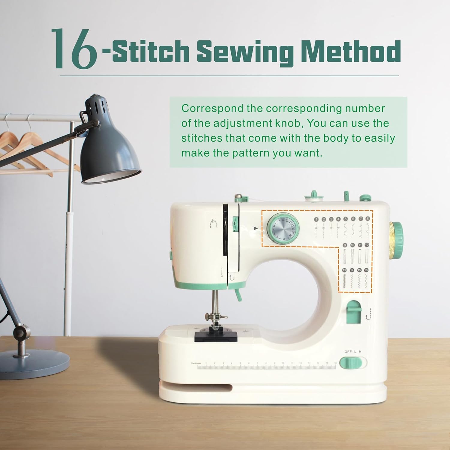 Sewing Machine for Beginners, Electric Portable Mini Sewing Machine with 50 Pcs Fabric and 32 Pcs Sewing Threads Kit, 16 Built-in Stitches 2 Speed with Foot Pedal (White and Mint)
