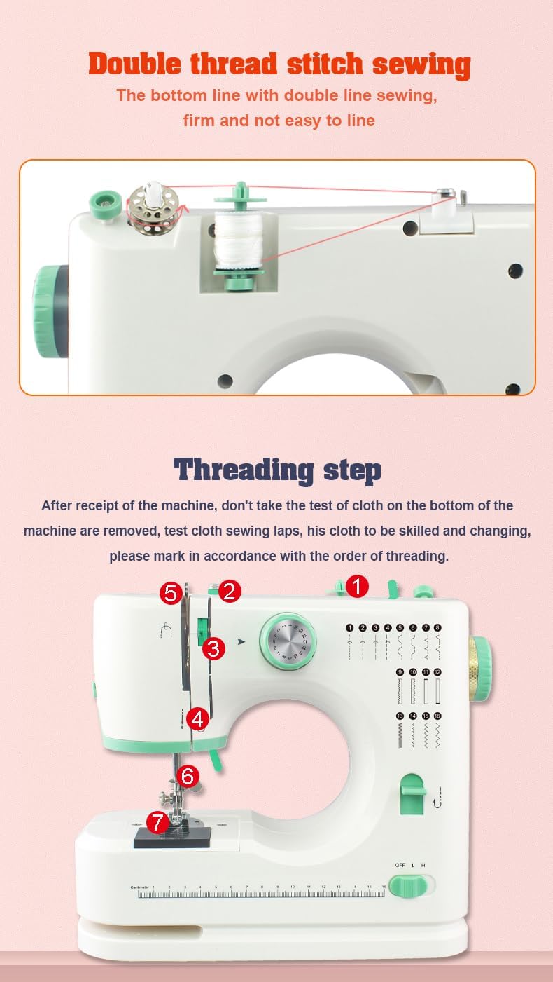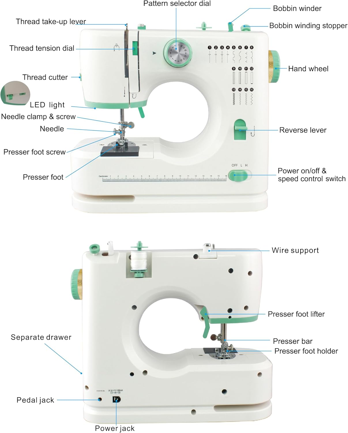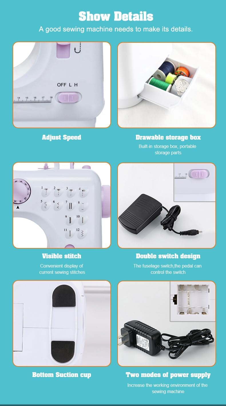 Sewing Machine for Beginners, Electric Portable Mini Sewing Machine with 50 Pcs Fabric and 32 Pcs Sewing Threads Kit, 16 Built-in Stitches 2 Speed with Foot Pedal (White and Mint)