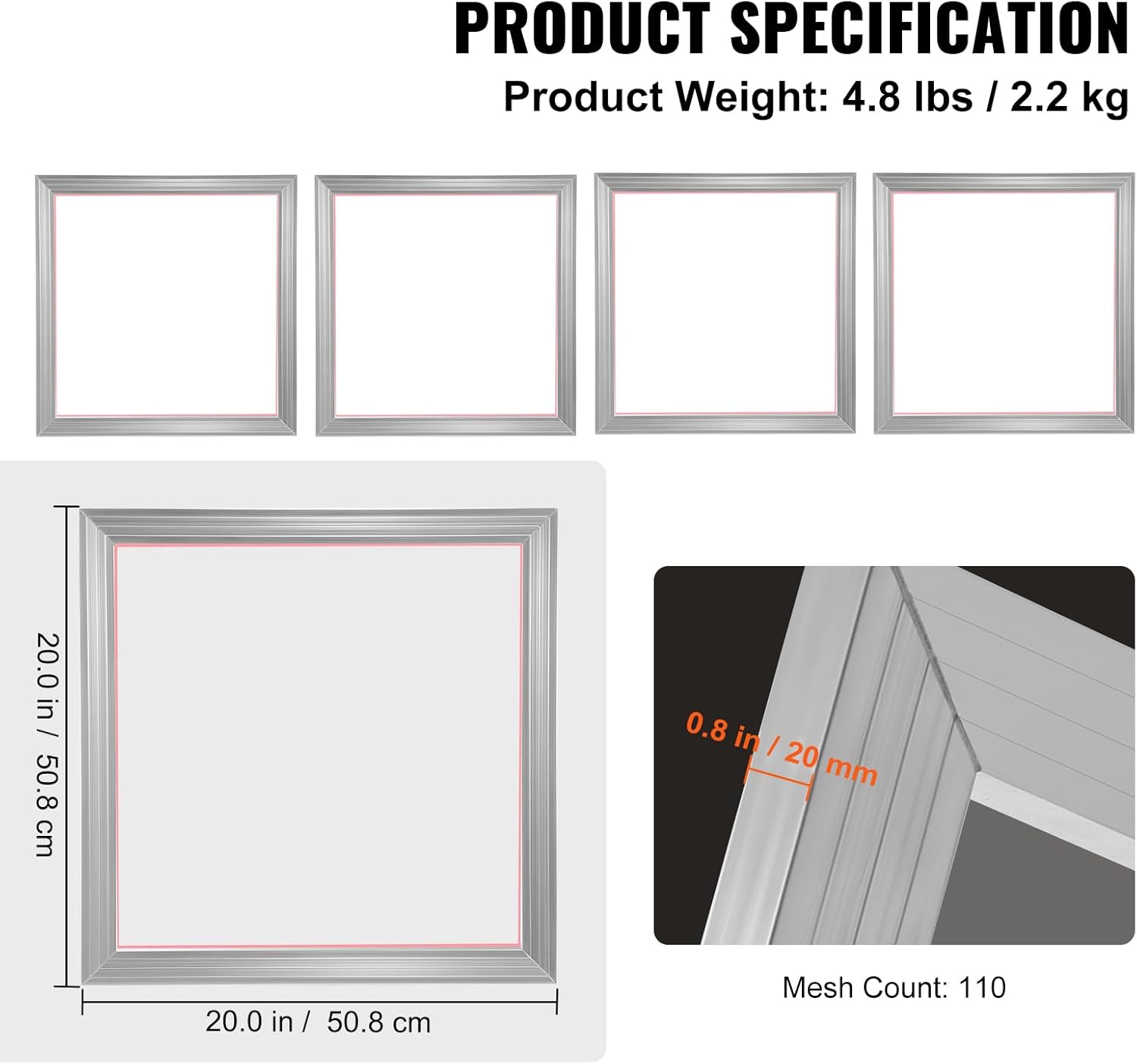 VEVOR 6 Pieces Aluminum, 20x24inch Silk Screen Frame with 110 Count High Tension Nylon Mesh and Sealing Tape for T-Shirts DIY Printing, Silver