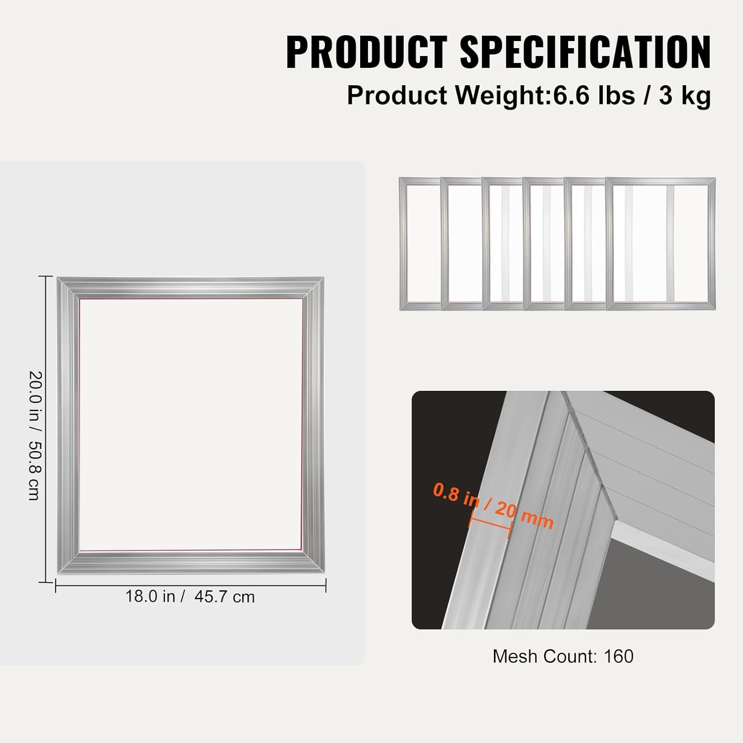 VEVOR Screen Printing Kit, 6 Pieces Aluminum Silk Screen Printing Frames, 18x20inch Silk Screen Printing Frame with 160 Count Mesh, High Tension Nylon Mesh and Sealing Tape for T-Shirts DIY Printing