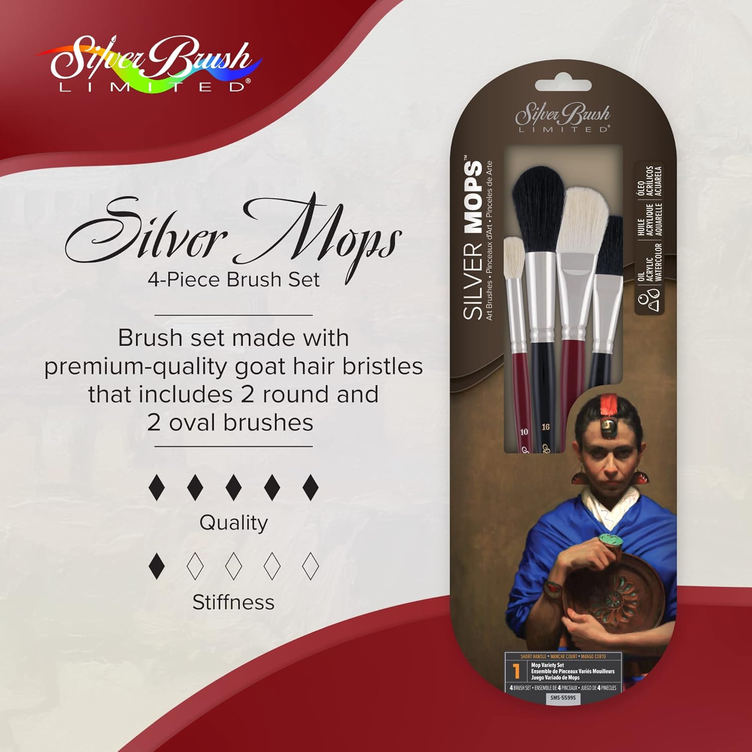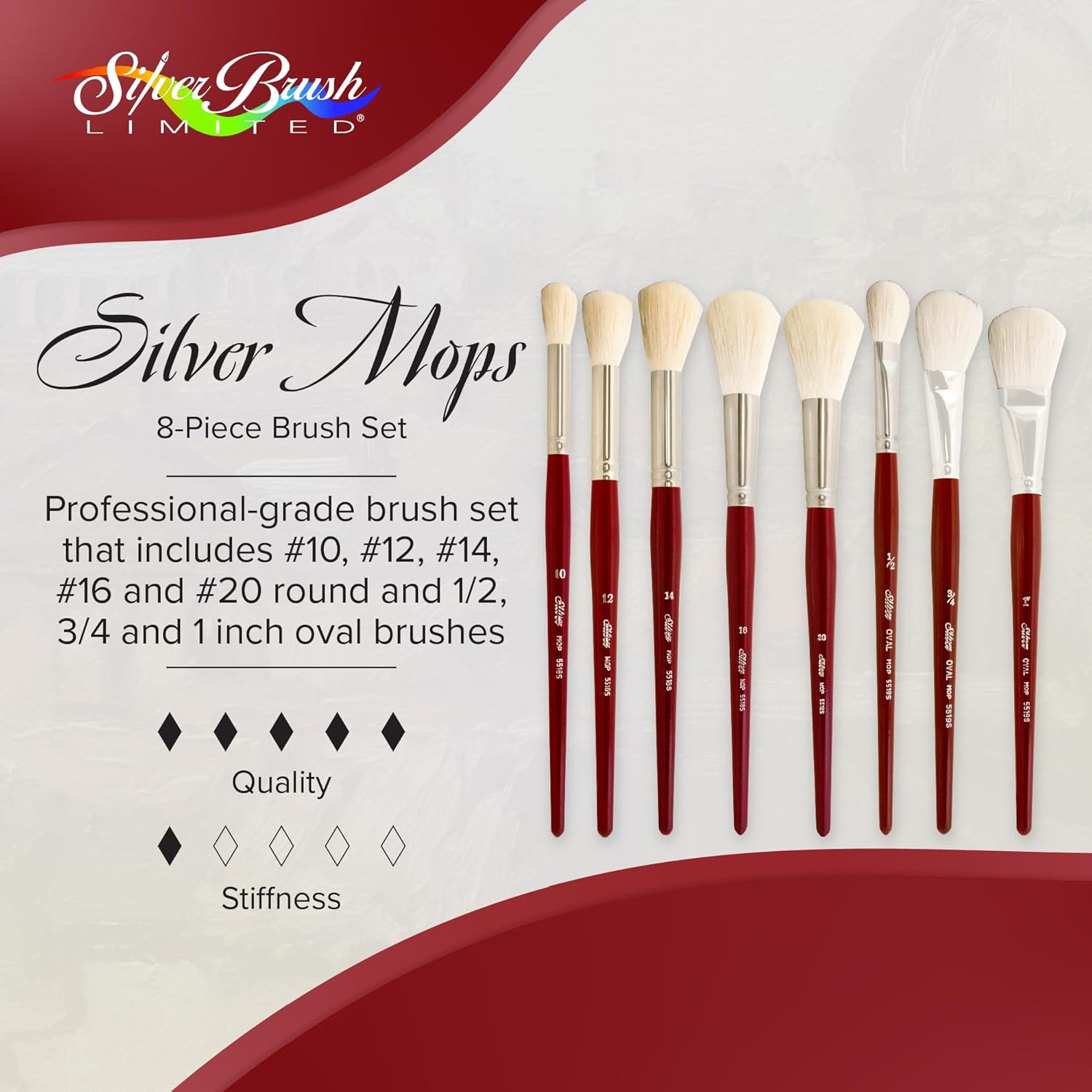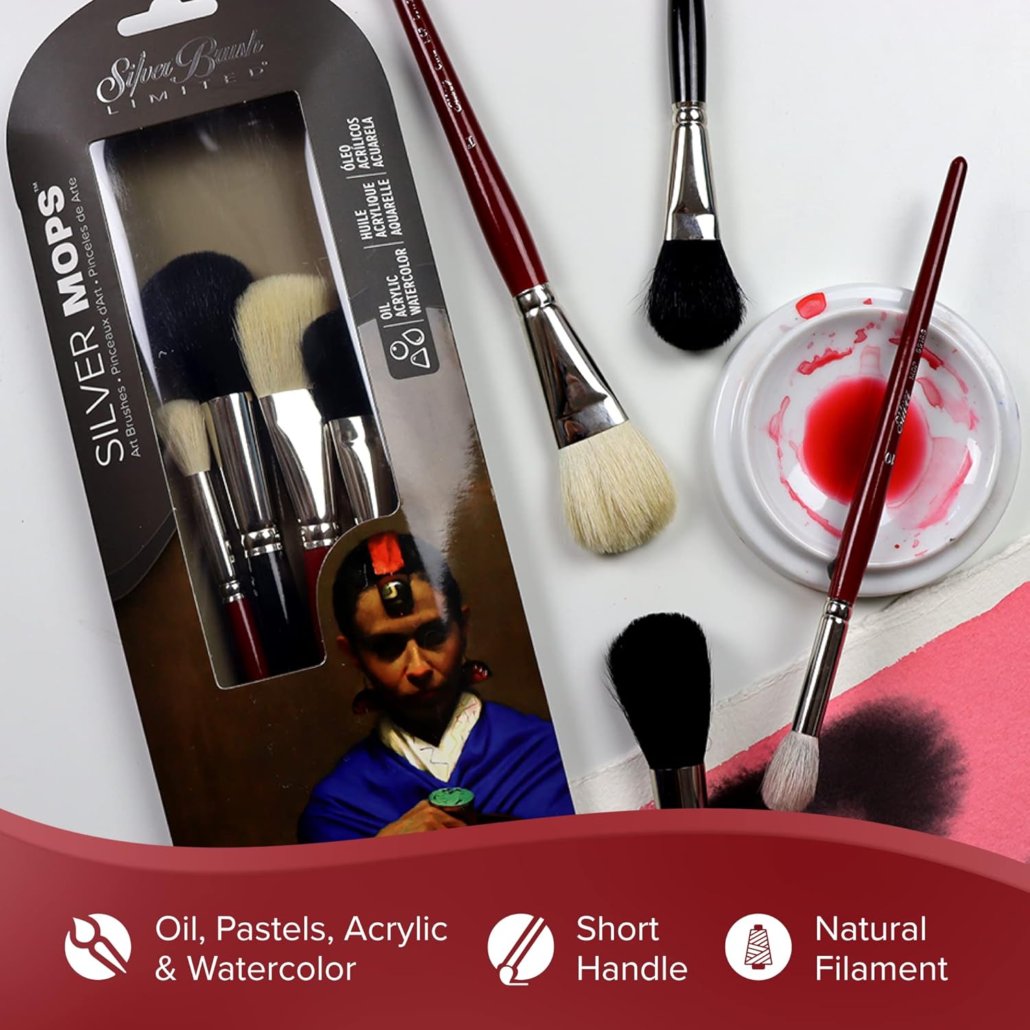 Silver Brush Limited MP-5662S Silver Mops Short Handle Round White Mops Brushes with Super-Soft Organic Hair, 5pc Professional Artist Painting Bundle for Oil, Acrylic, Watercolor, Pastels, & Charcoal