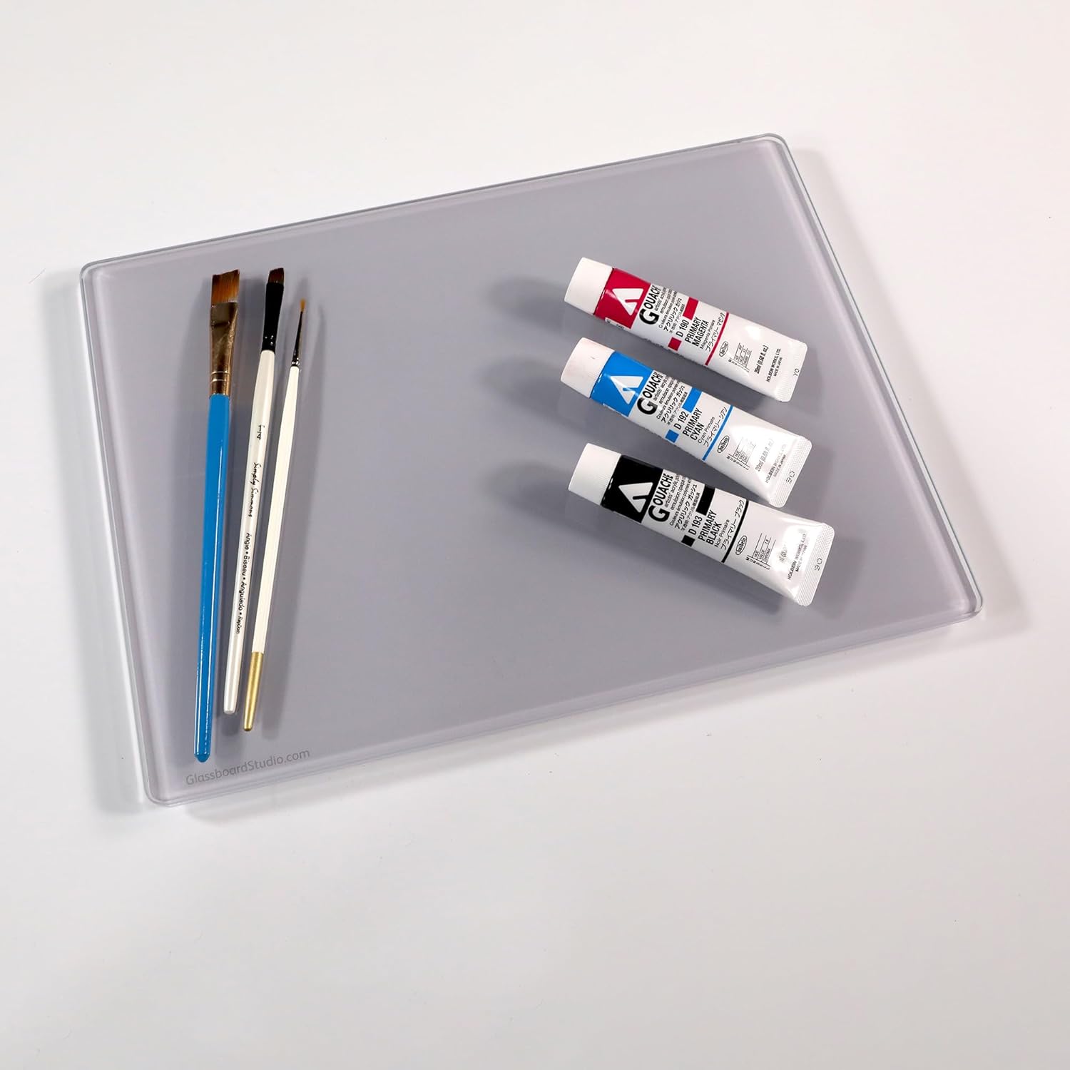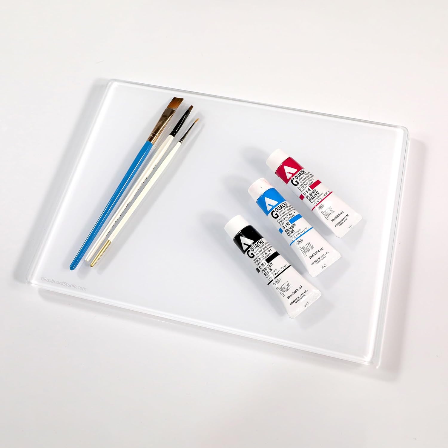 GLASSBOARD STUDIO Ultra-Clear Tempered Glass Paint Palette for Acrylic & Oil Painting - 1/4" Thick, Low-Iron, Non-Slip Feet, and Metal Backing for Magnet Use (White, 13.5in x 18in)