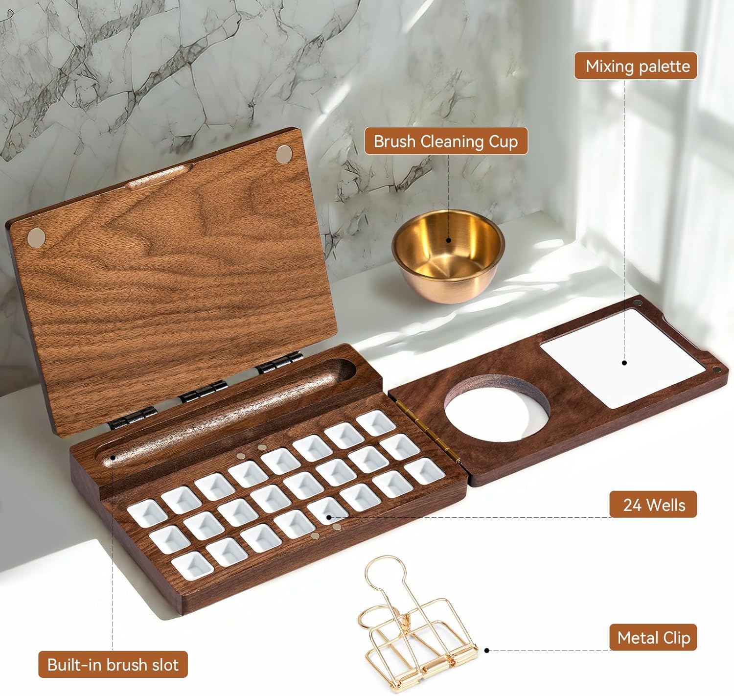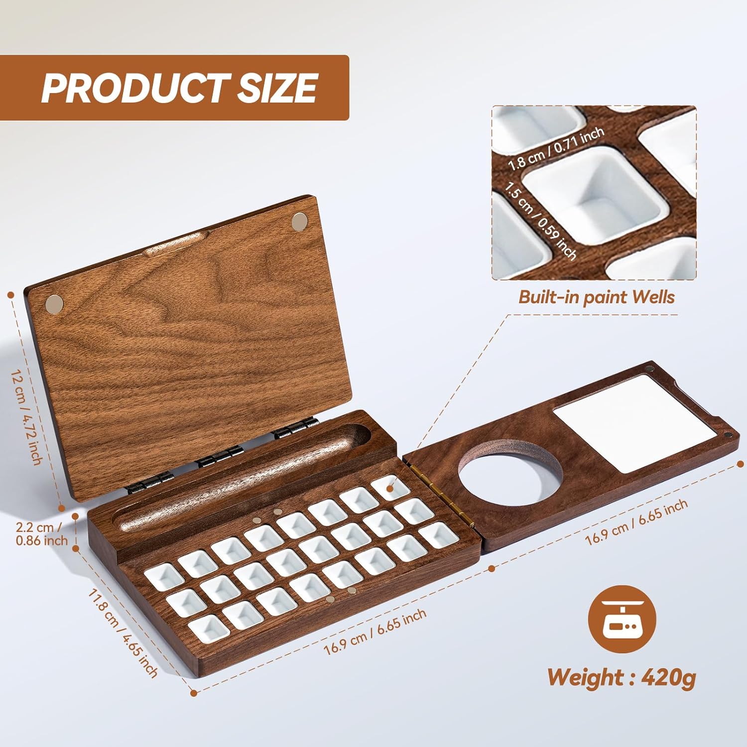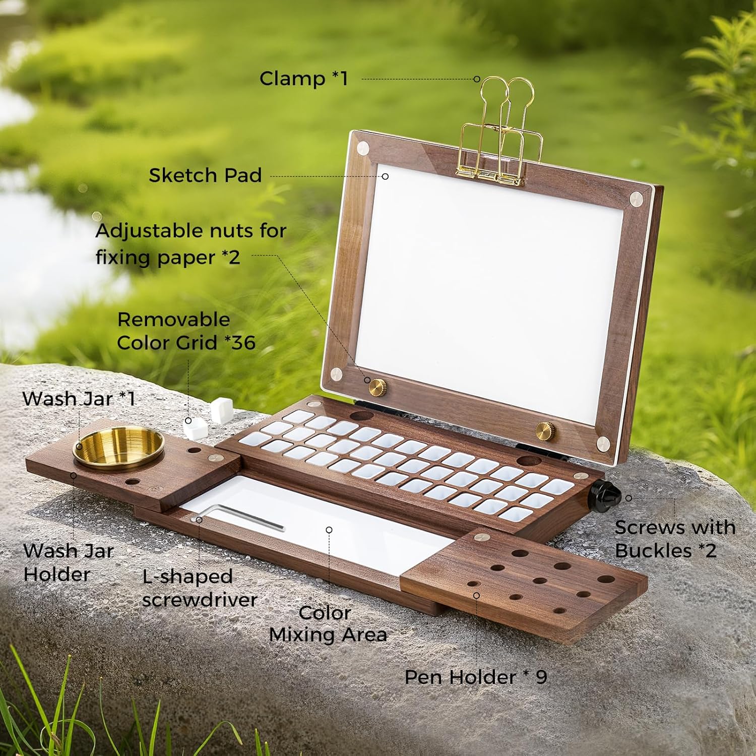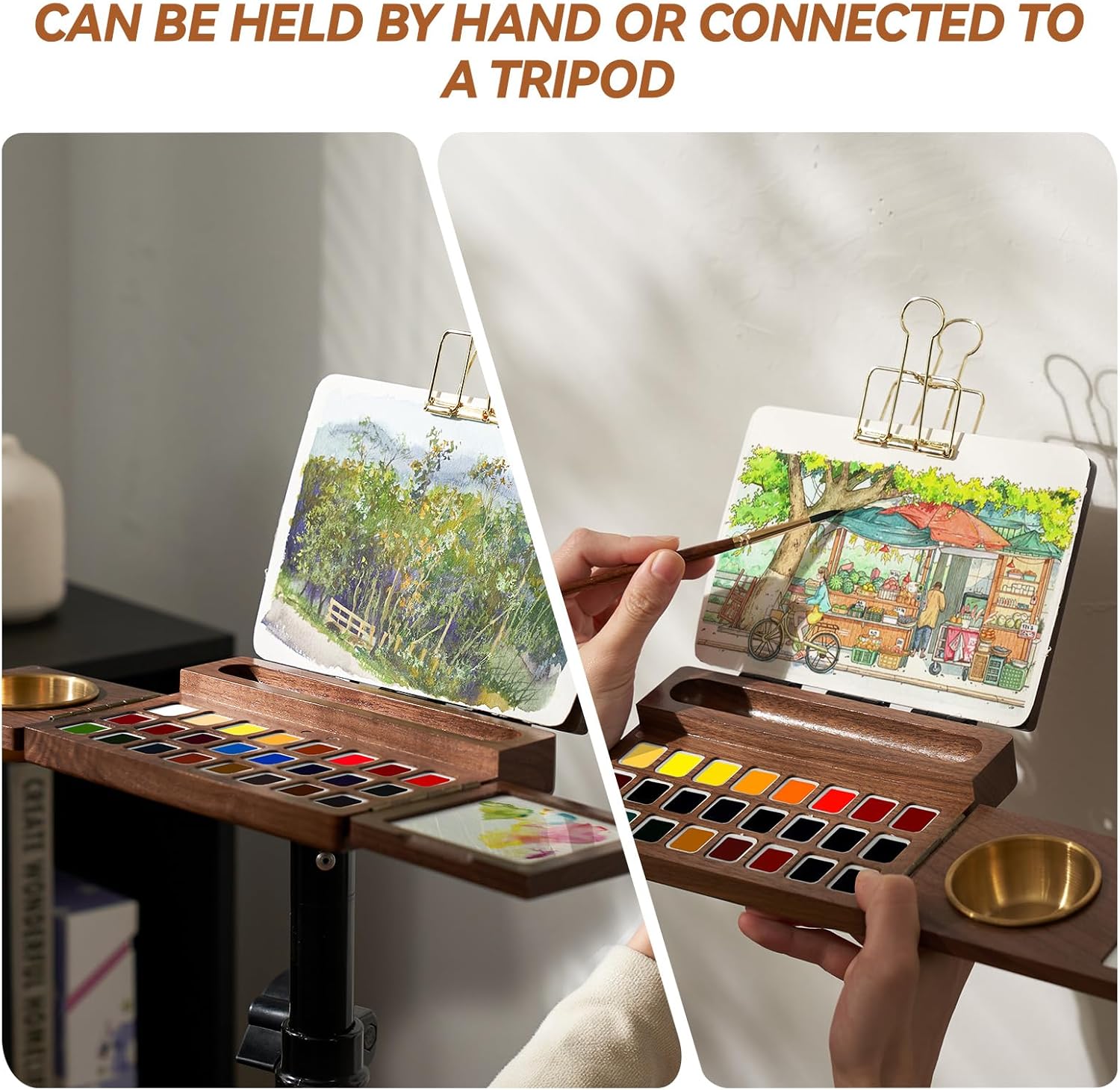 36-Grid Empty Watercolor Palette Box for Travel, Walnut Wood Artist Palette Tray Kit with Wash Jar, 9 Pen Holders, for Acrylic Gouache Water Color Painting