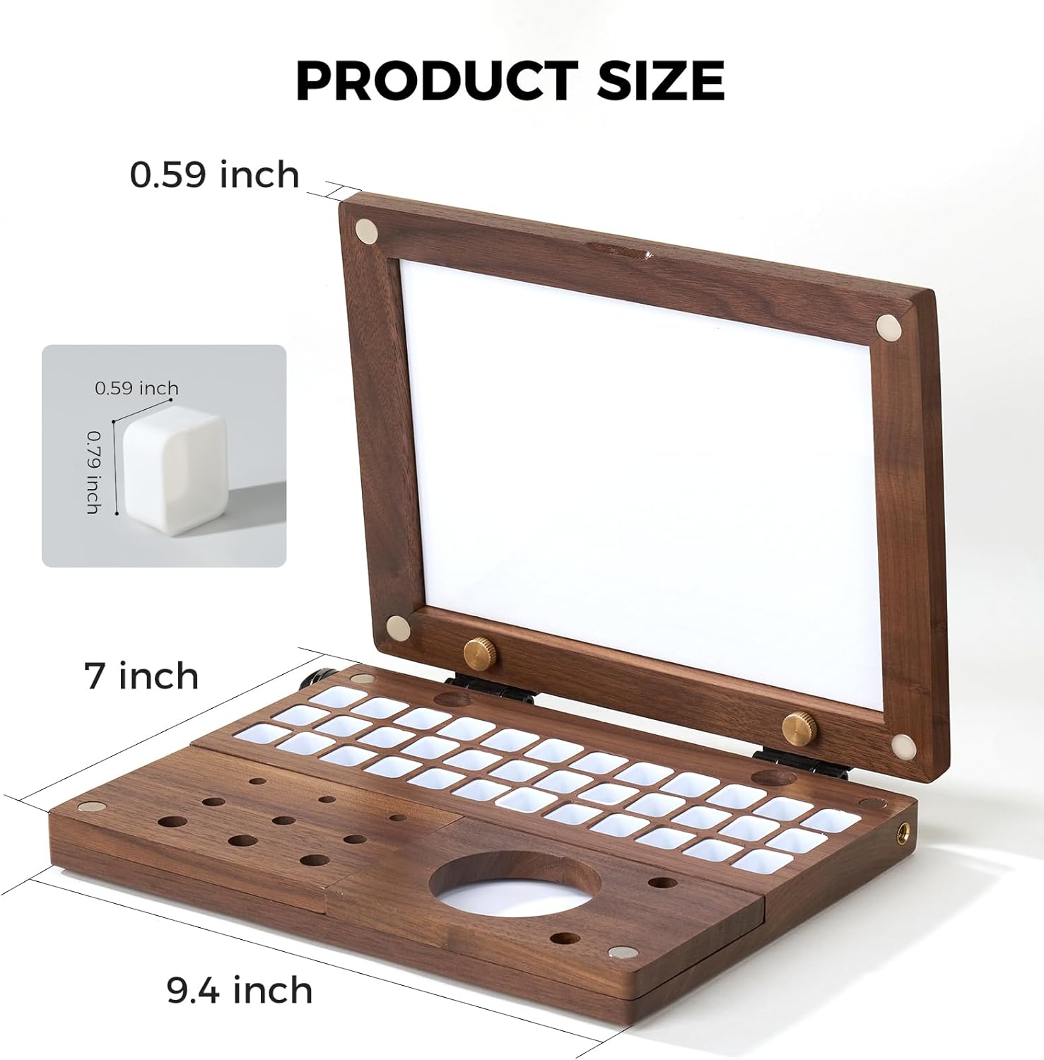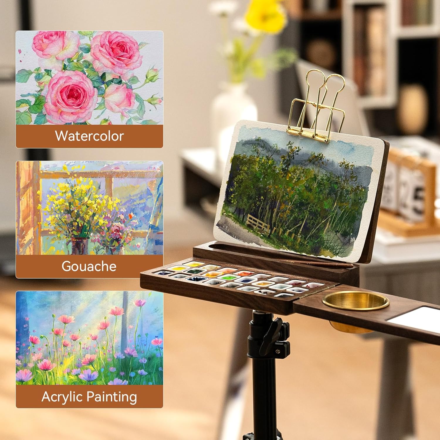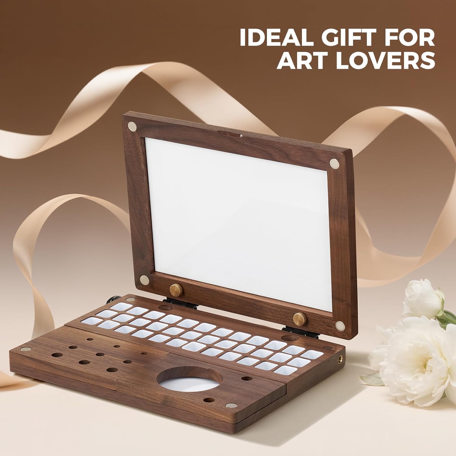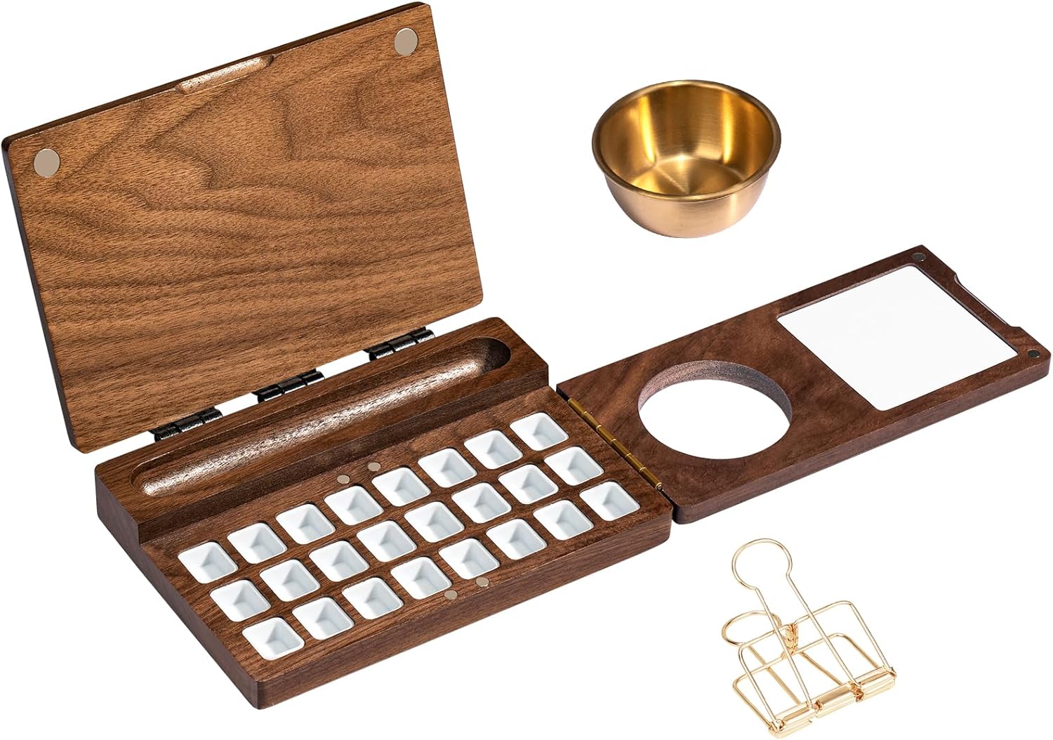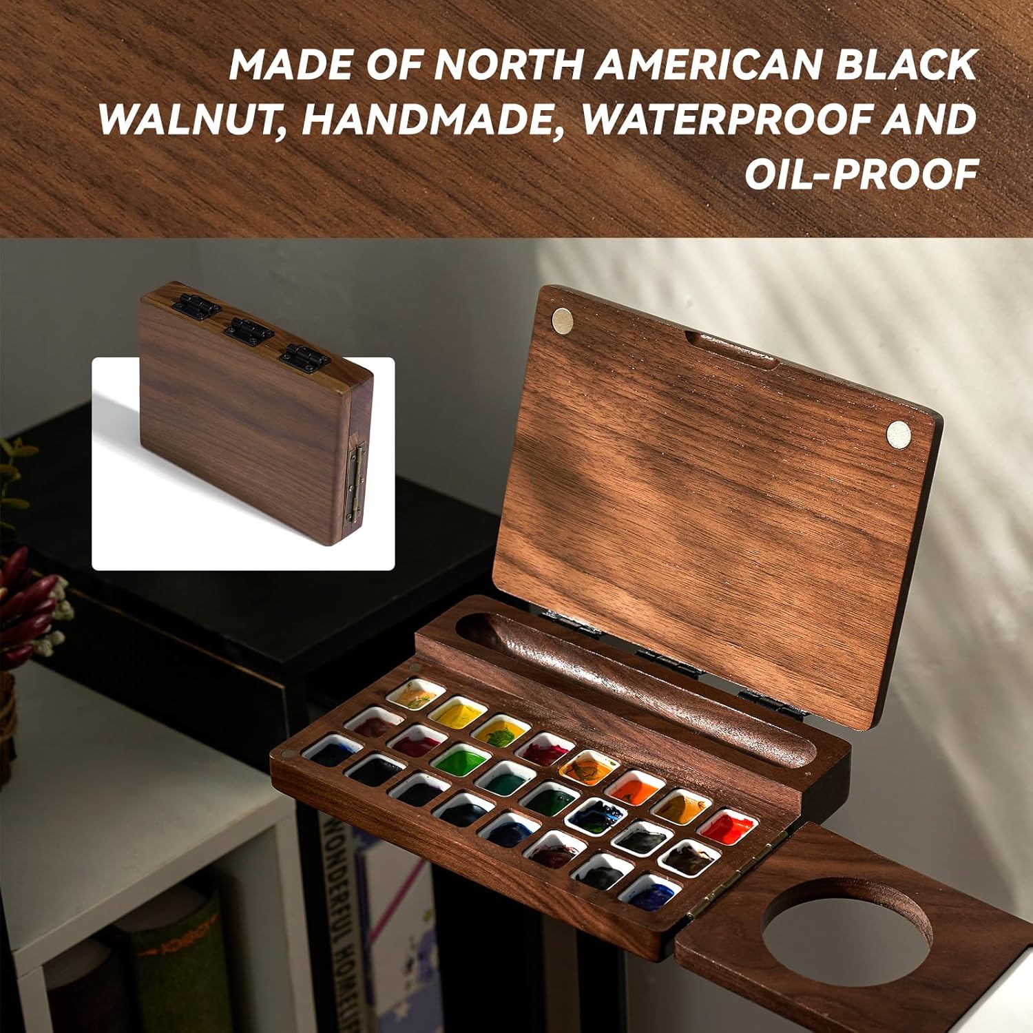 36-Grid Empty Watercolor Palette Box for Travel, Walnut Wood Artist Palette Tray Kit with Wash Jar, 9 Pen Holders, for Acrylic Gouache Water Color Painting