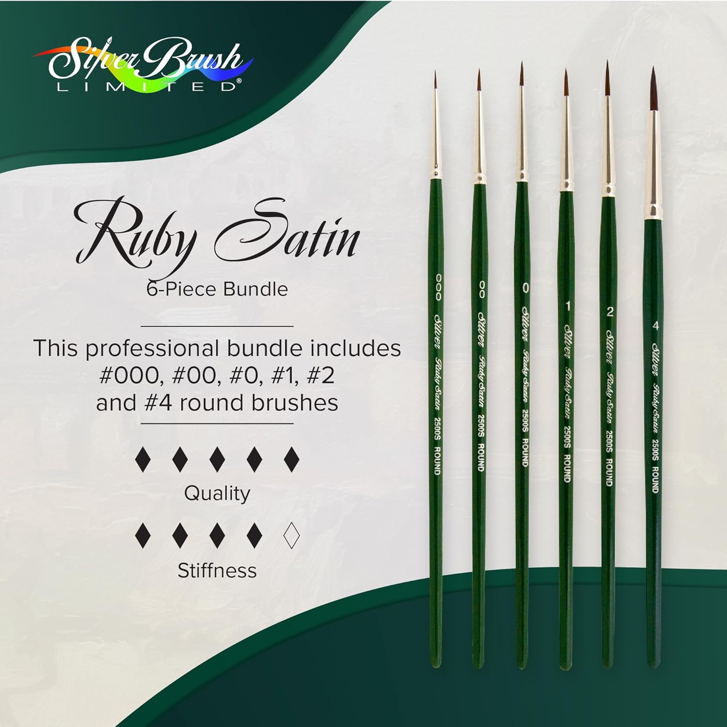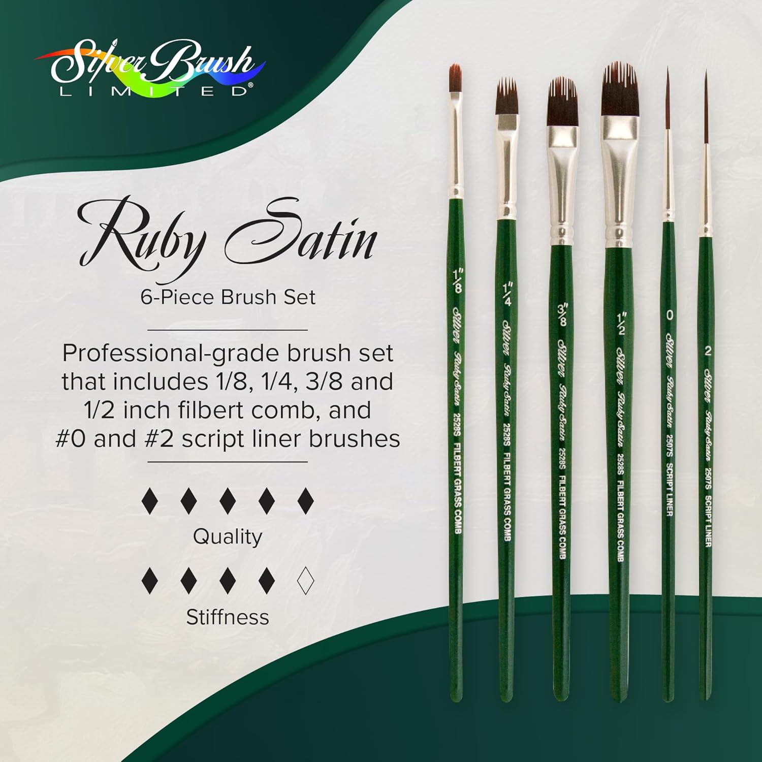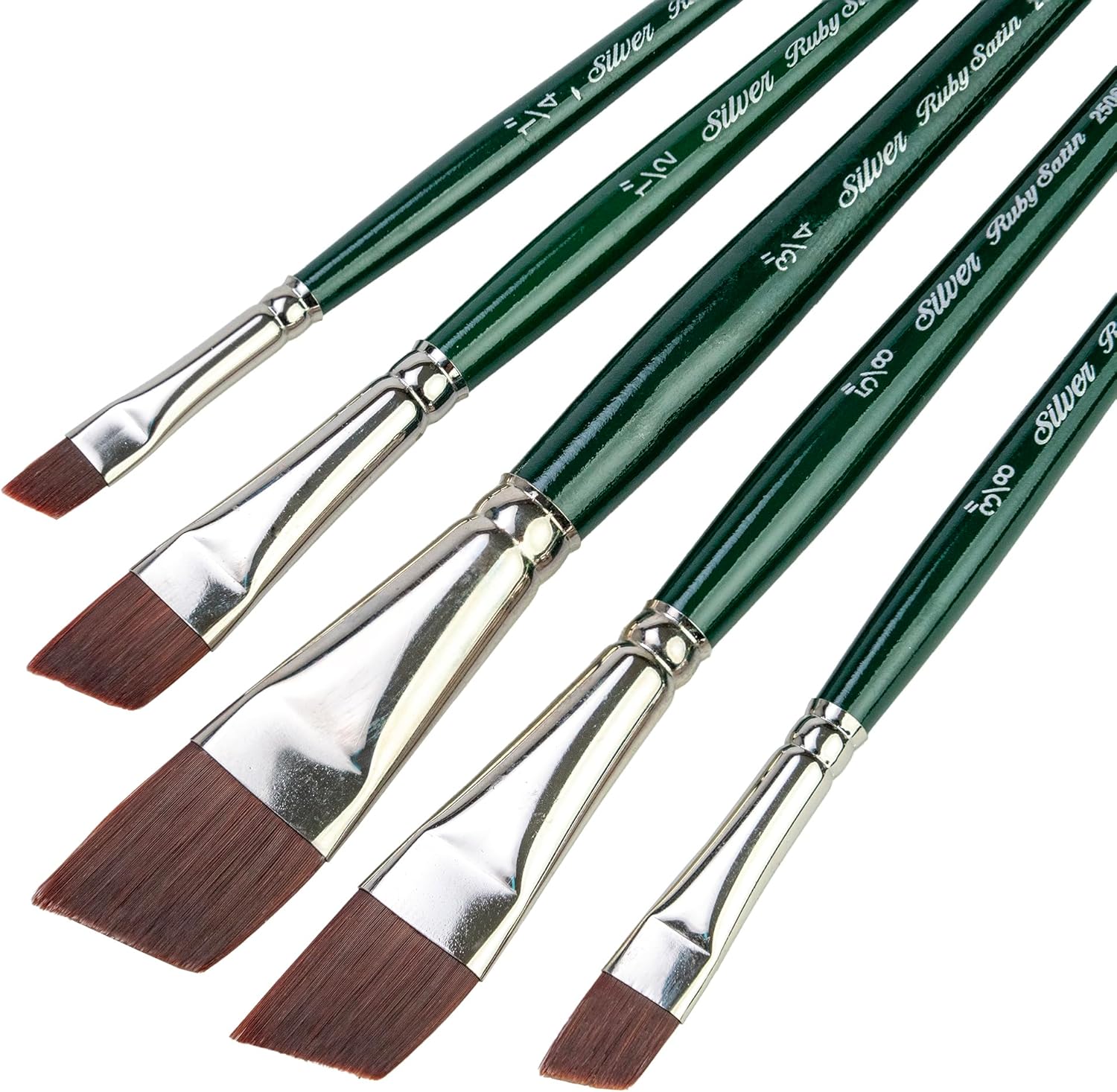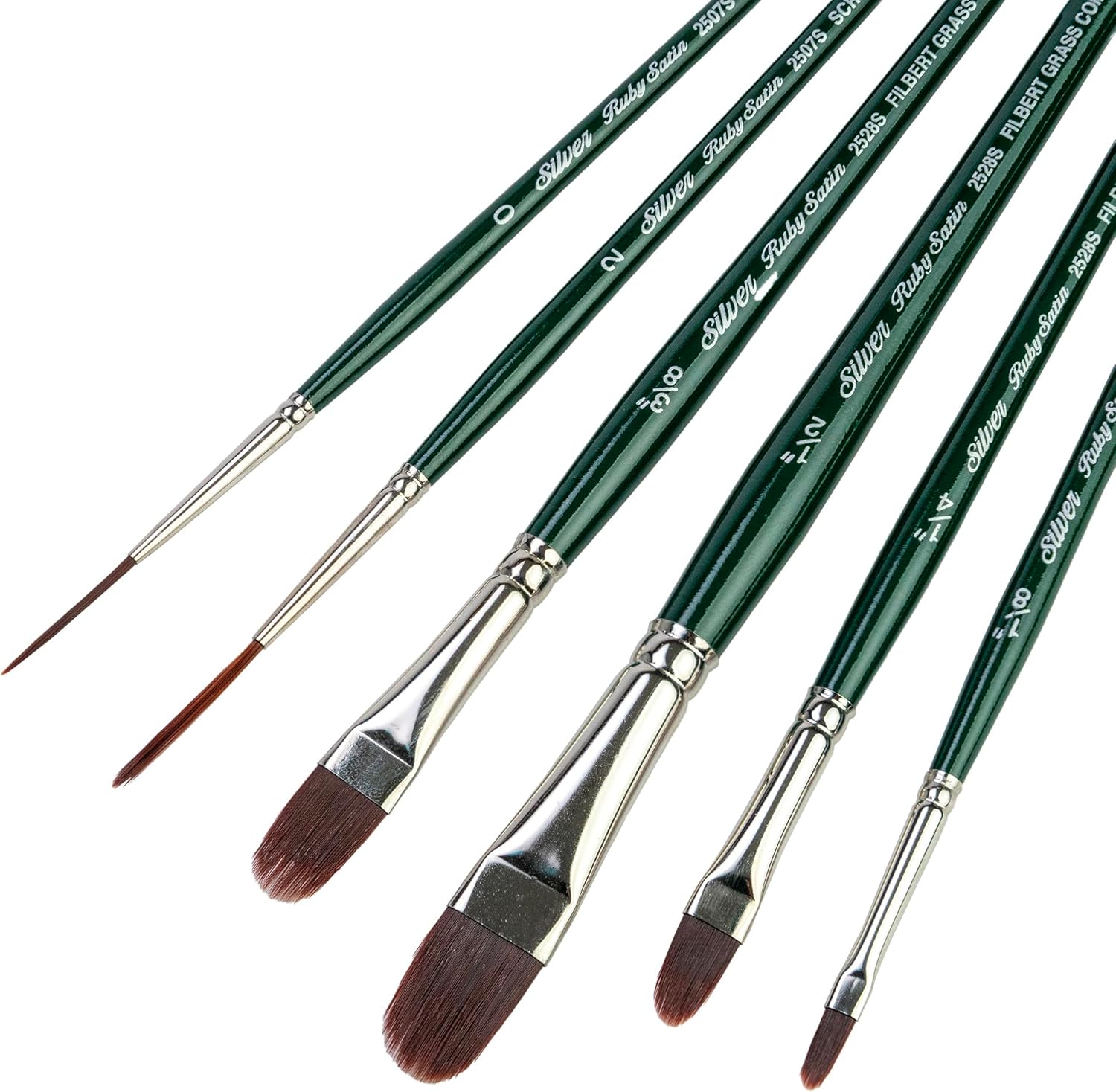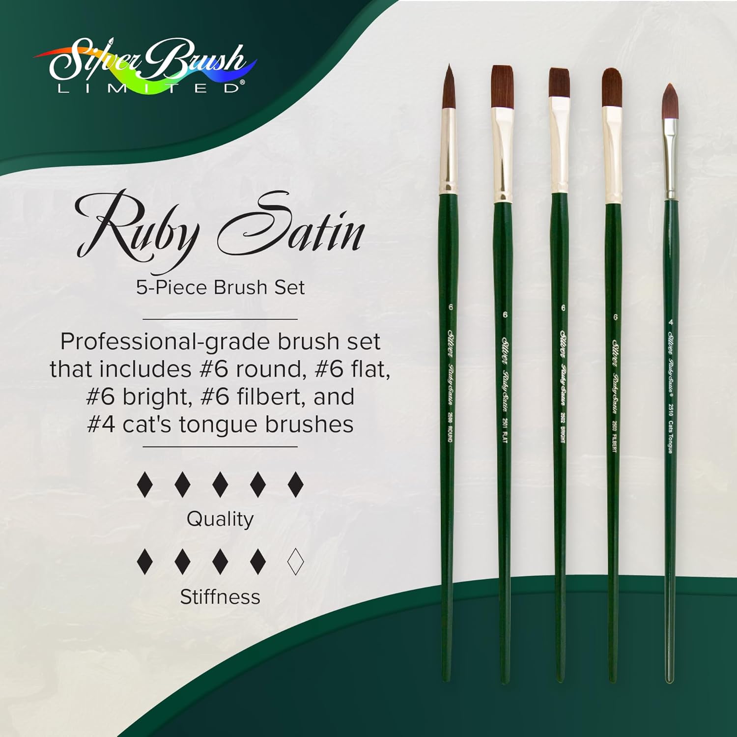 Silver Brush Limited RS-2596 Ruby Satin Size 6 Variety Set, 5pc Premium Long Handle Brushes with Stiff and Flexible Synthetic Bristles, Round, Flat, Bright, Filbert & Cat's Tongue for Oil and Acrylic
