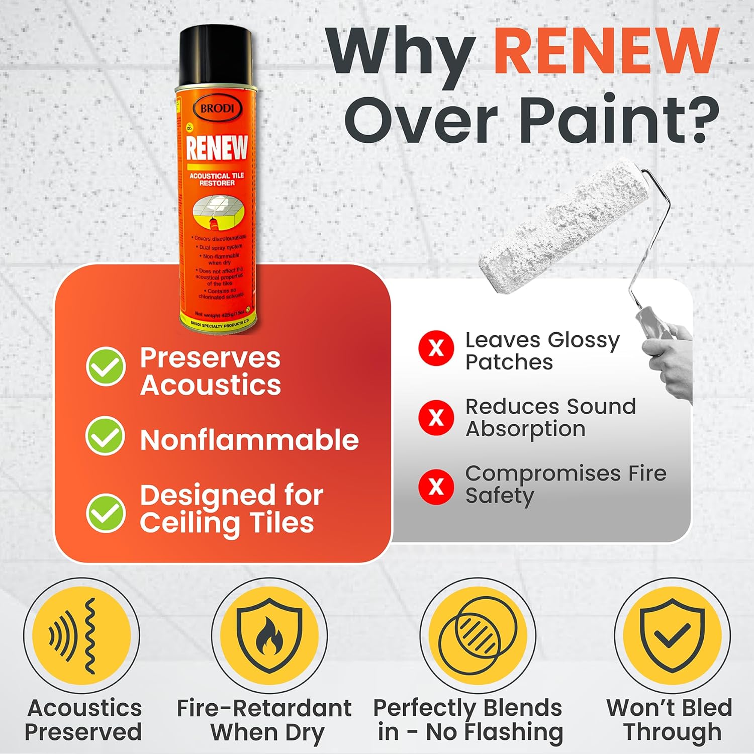 Renew Ceiling Tile Spray Paint, Commercial-Grade, Conceals Water & Smoke Stains, Fire-Retardant, Preserves Acoustics (Pack of 3)