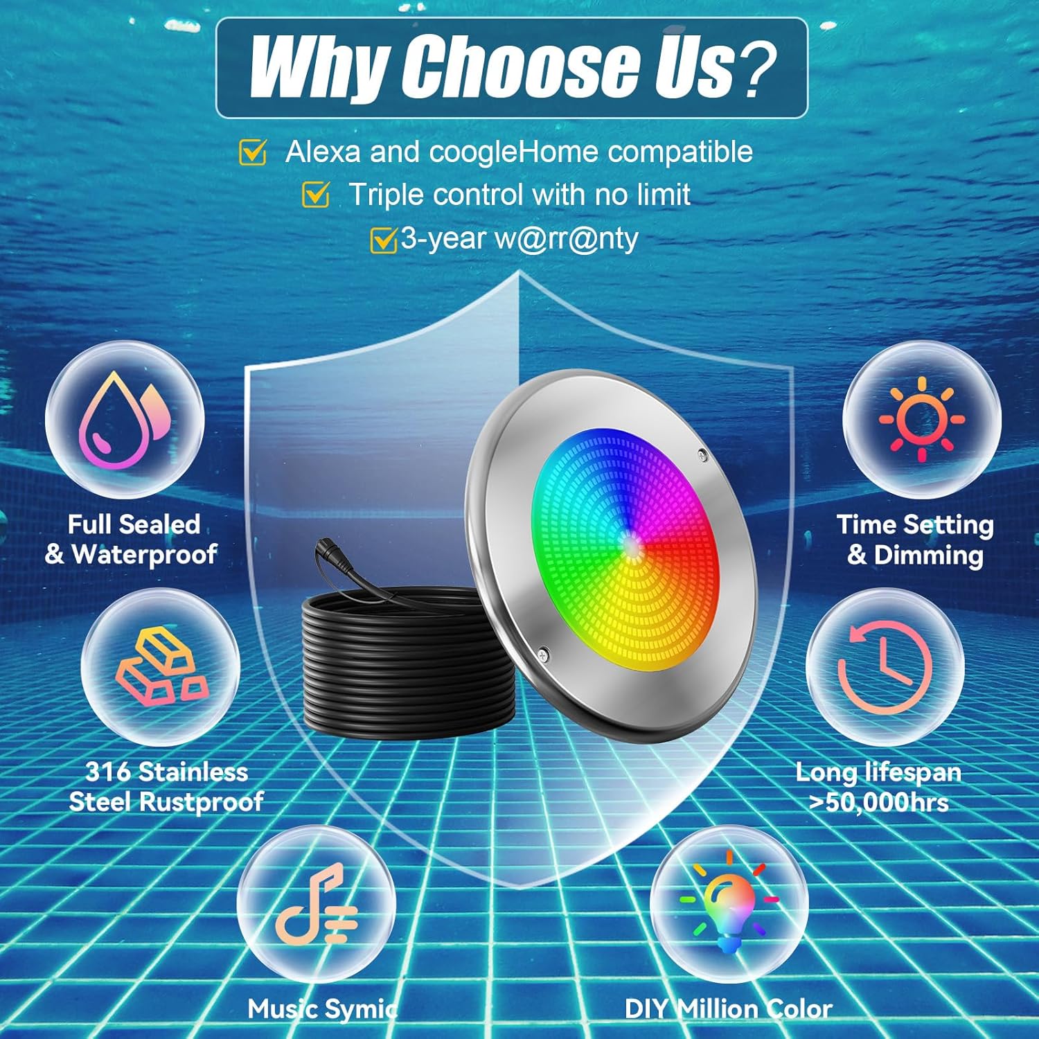 60W 10" Smart Pool Lights for Inground Pool with Triple Control (WiFi Bluetooth APP/Remote/Controller), Led Color Changing Underwater Swimming Pool Light for 10" Large Wet Niches - 120Ft