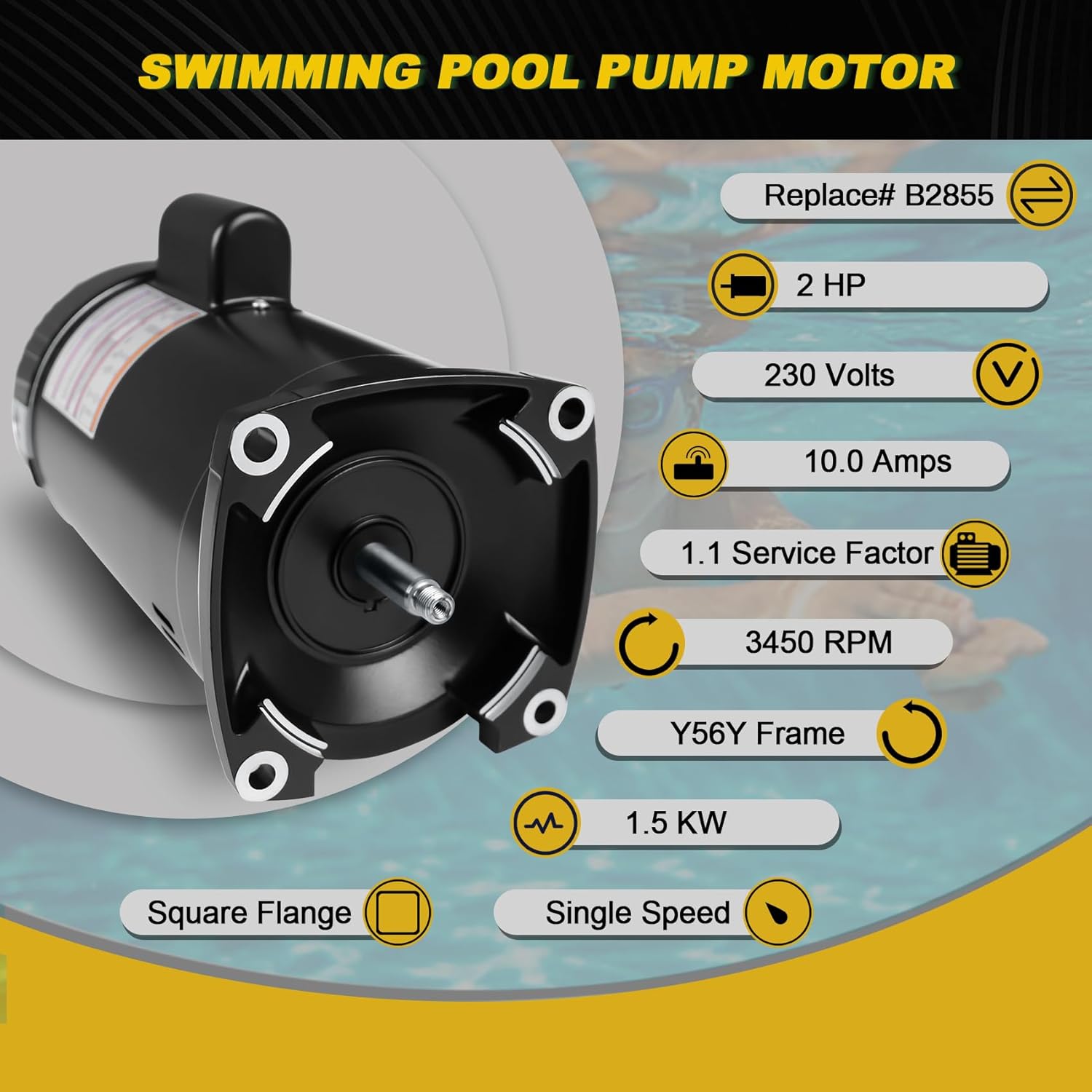 2 HP Pool Pump Motor Compatible with A.O. Smith Century B2855 B855, for Pentair Sta-Rite Whisperflo Challenger Pinnacle Anthony AR2 Series Pumps, 2HP Single Speed Square Pool Motor, 230 V, 1.5 KW