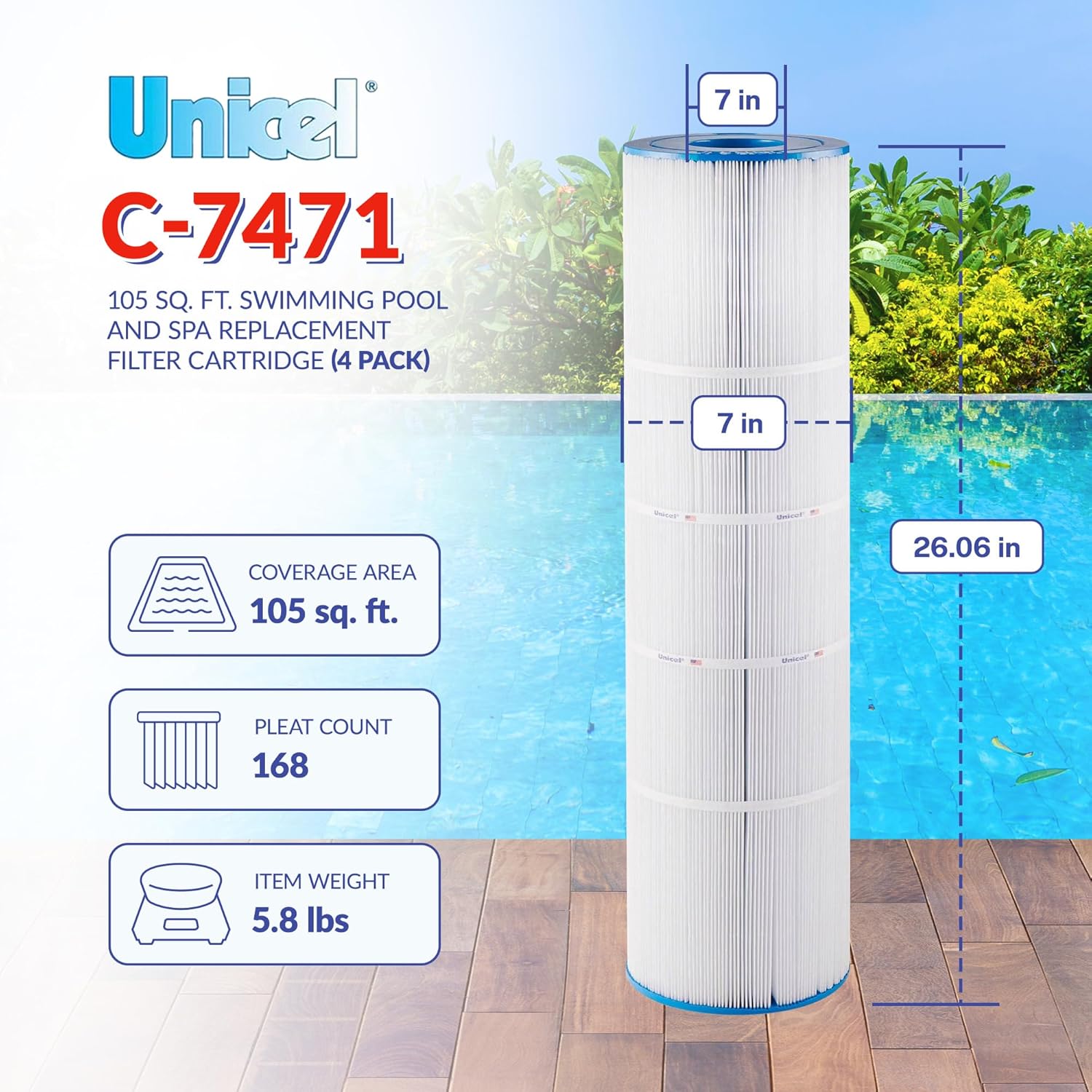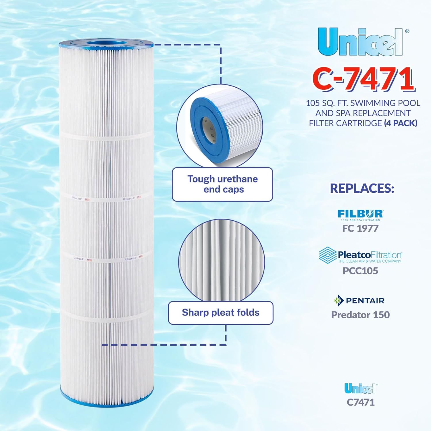 Unicel C-7471 105 Sq Ft Media Replacement Pool Filter Cartridge with 168 Pleats, Compatible with Pentair Pool Products, Pac Fab, & Waterway (4 Pack)