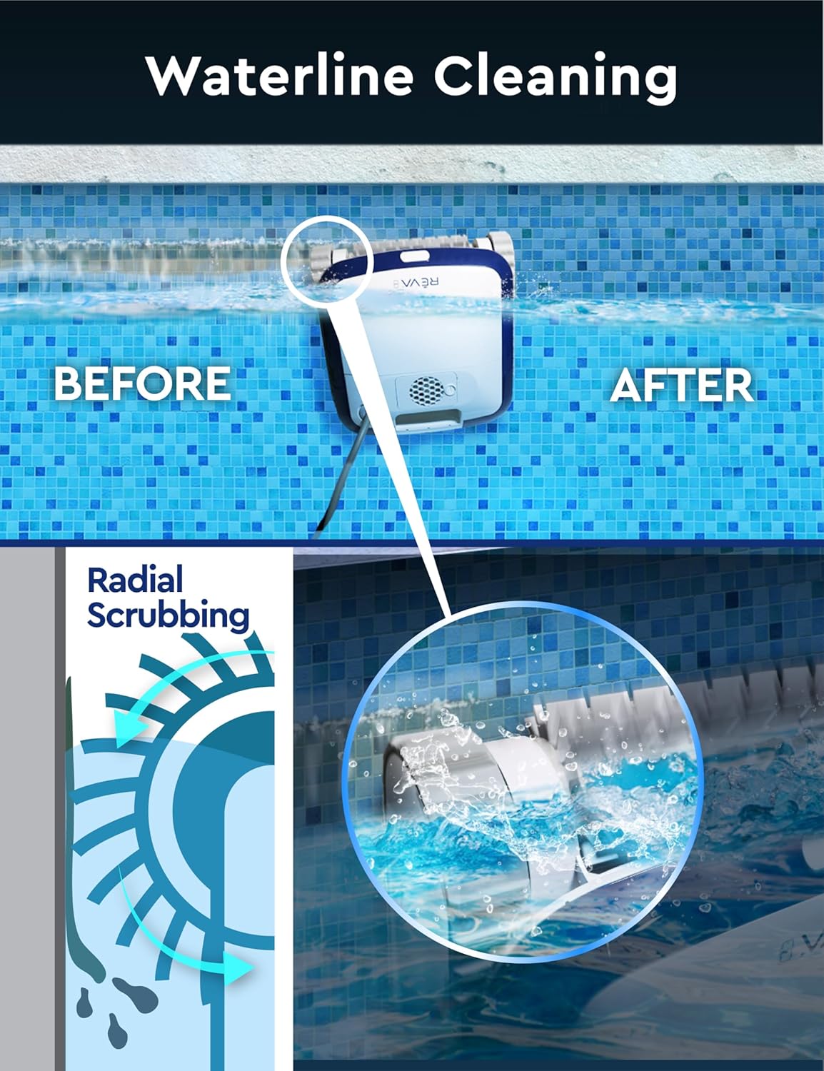 REVA AI Gyroscopic Robotic Pool Vacuum Cleaner, Smartphone APP Control, Horizontal Waterline/Wall/Floor Deep Cleaning, Upgraded 2024 Auto Navigation, 2-Layers Fine Filtration, for Pools up to 35ft