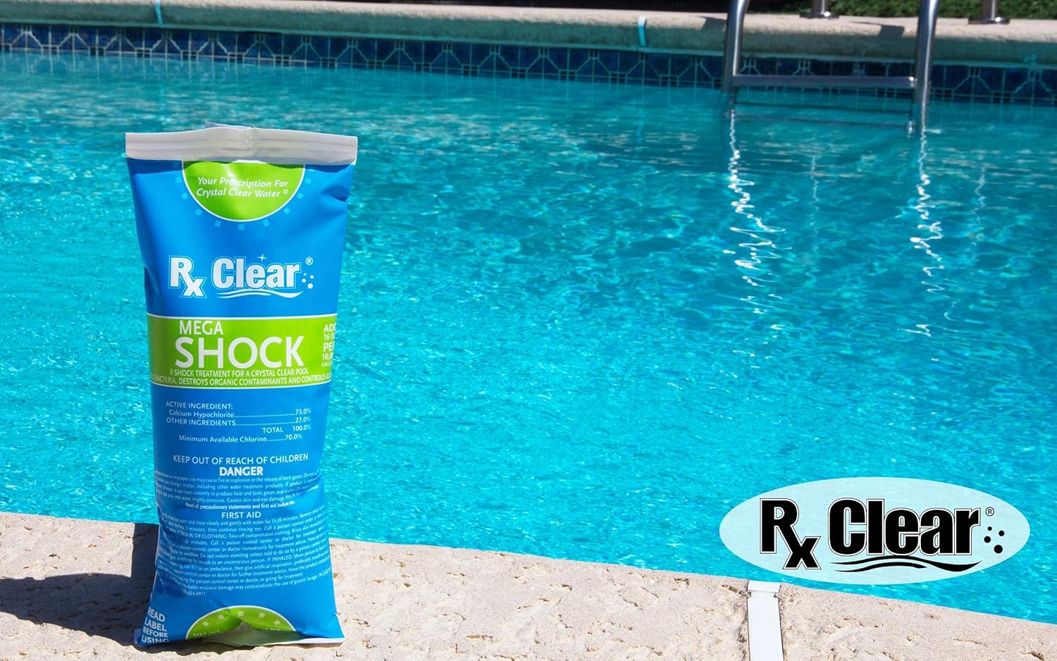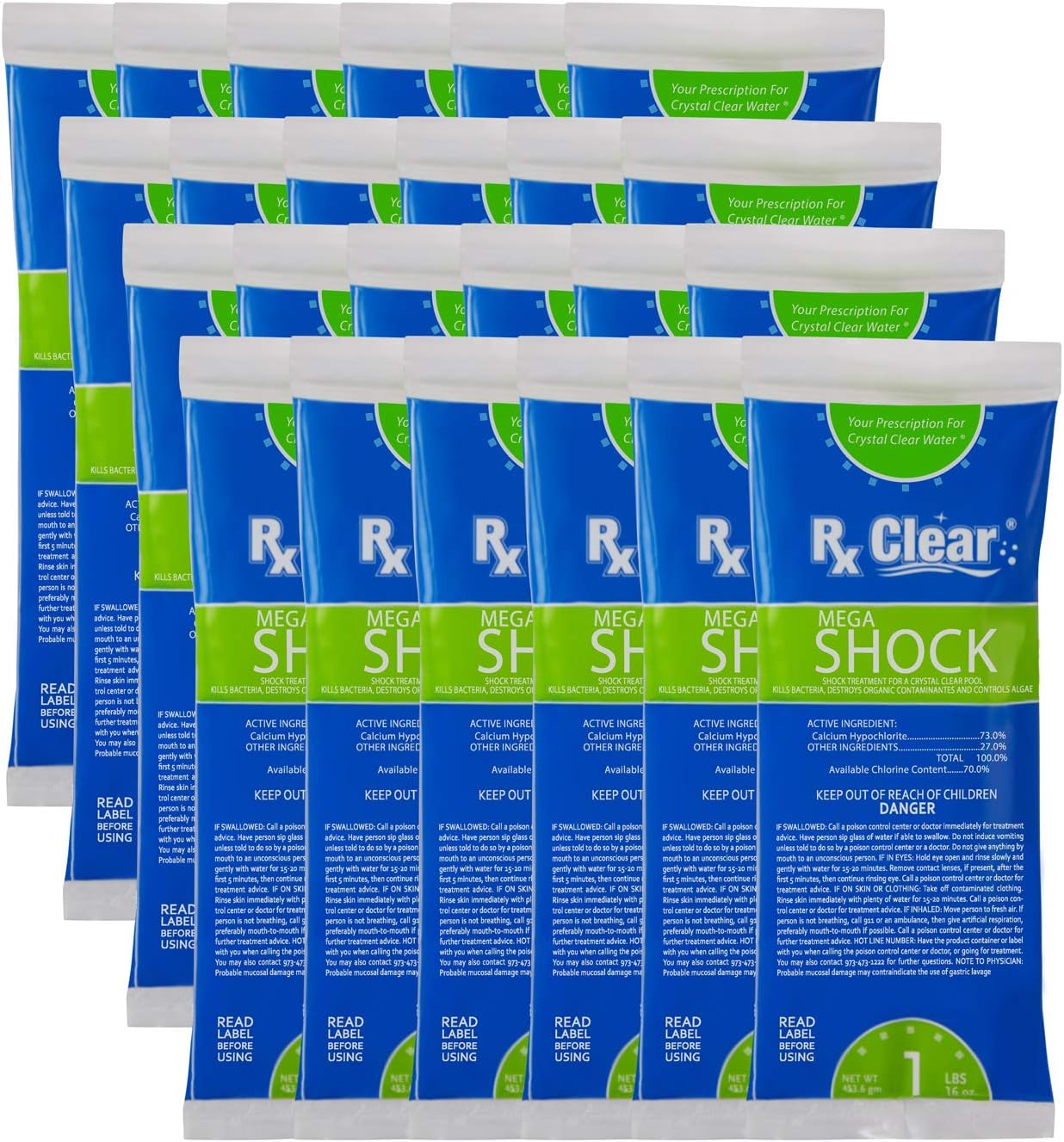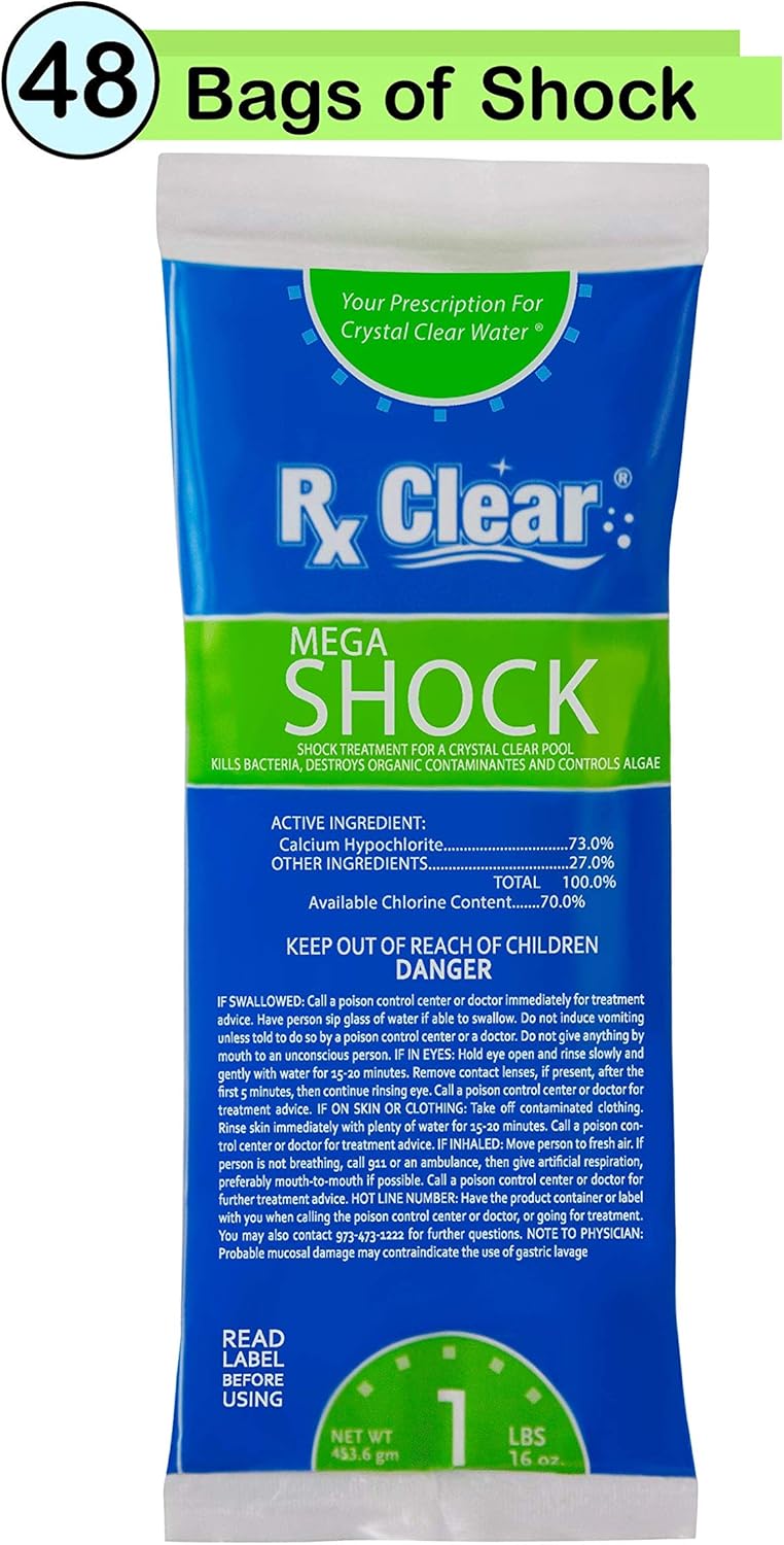 Rx Clear Mega Shock | 73% Calcium Hypochlorite | Kills Algae in Swimming Pools | Works As Pool Sanitizer Clarifier and Algicide | One Pound Bags | 48 Pack