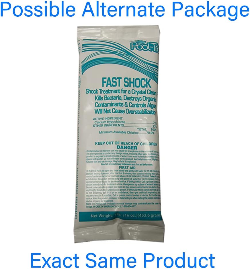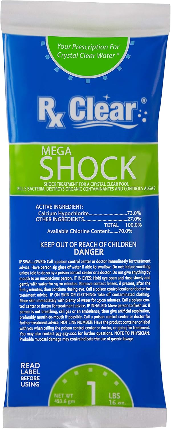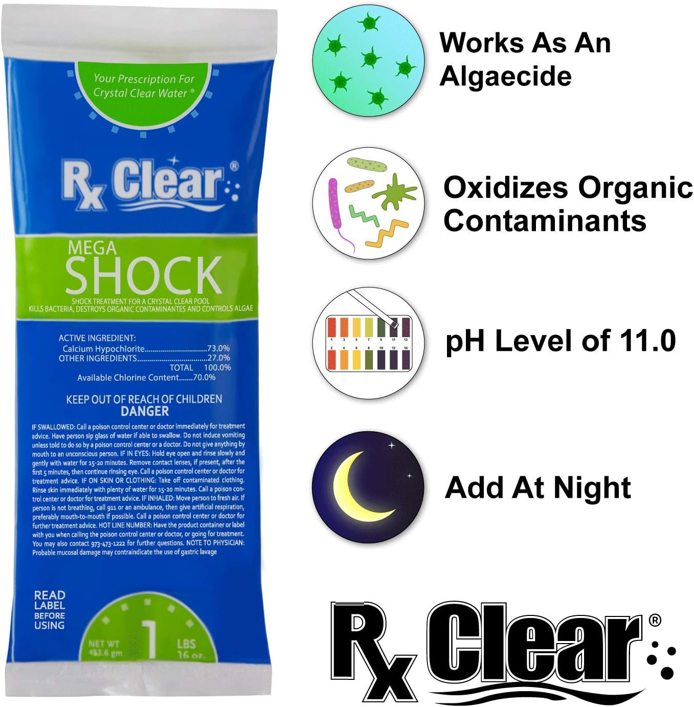 Rx Clear Mega Shock | 73% Calcium Hypochlorite | Kills Algae in Swimming Pools | Works As Pool Sanitizer Clarifier and Algicide | One Pound Bags | 48 Pack