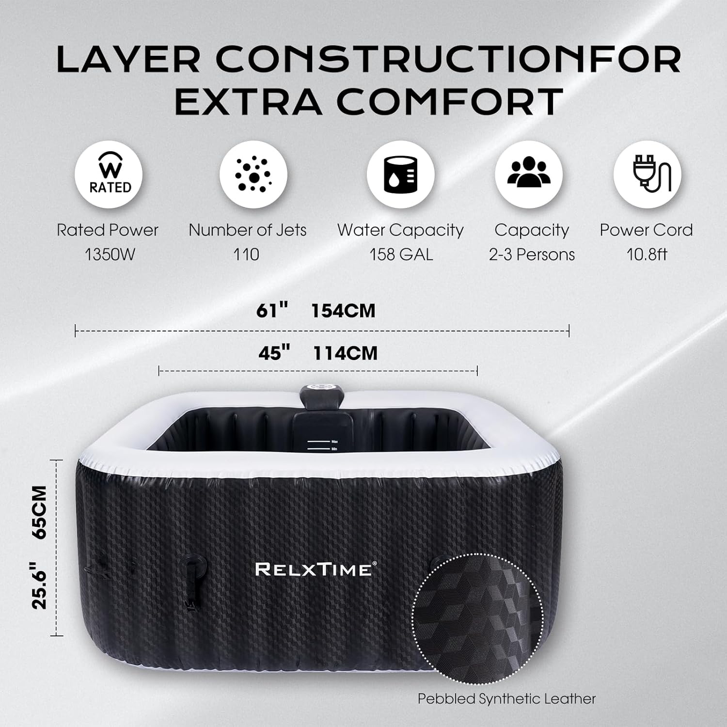 Inflatable Hot Tub 2-3 Person 110 Air Jets, Portable Blow Up Hottub with Cover, Built in Heater Pump, Square Outdoor Spa, Cup Holder, 2 Filters, Black