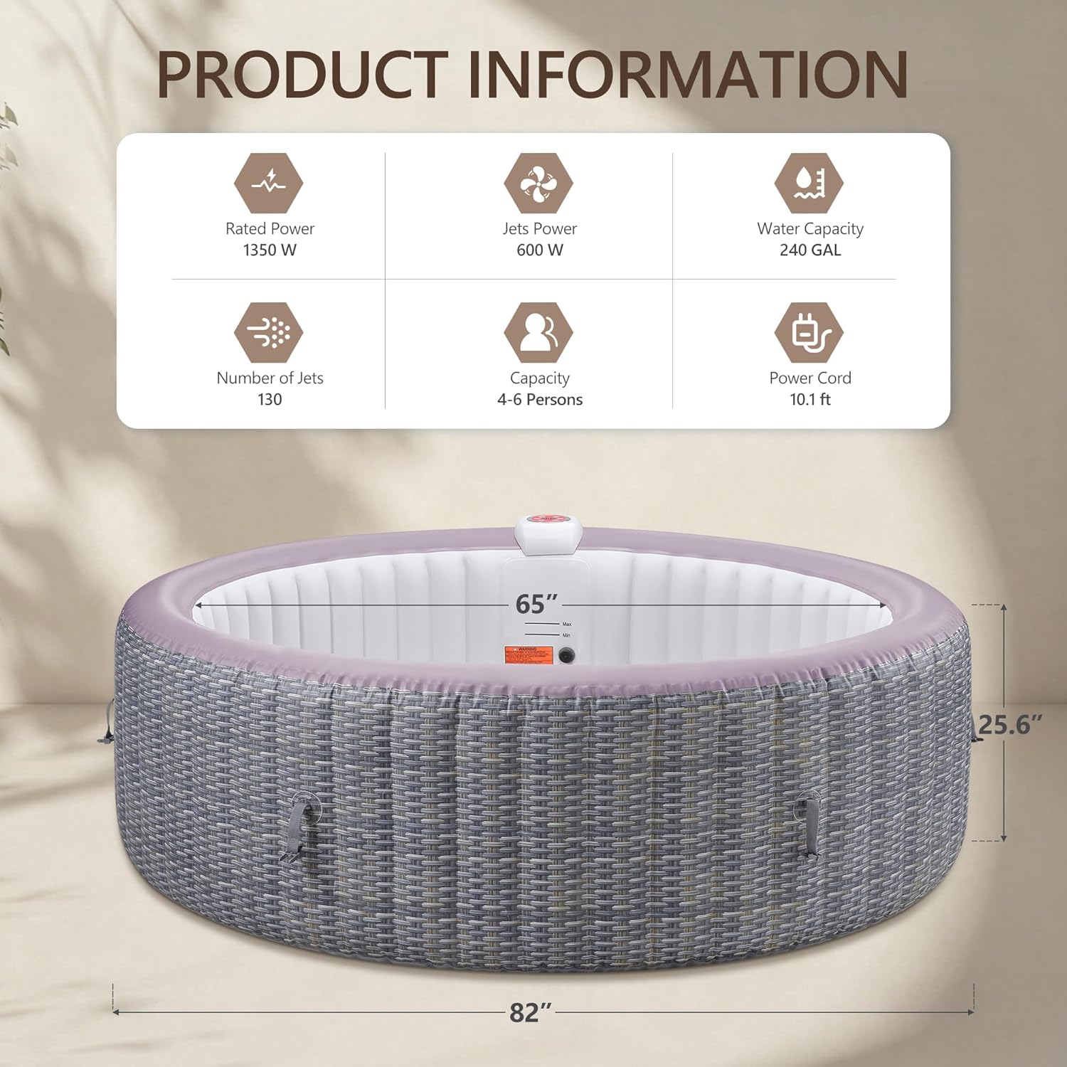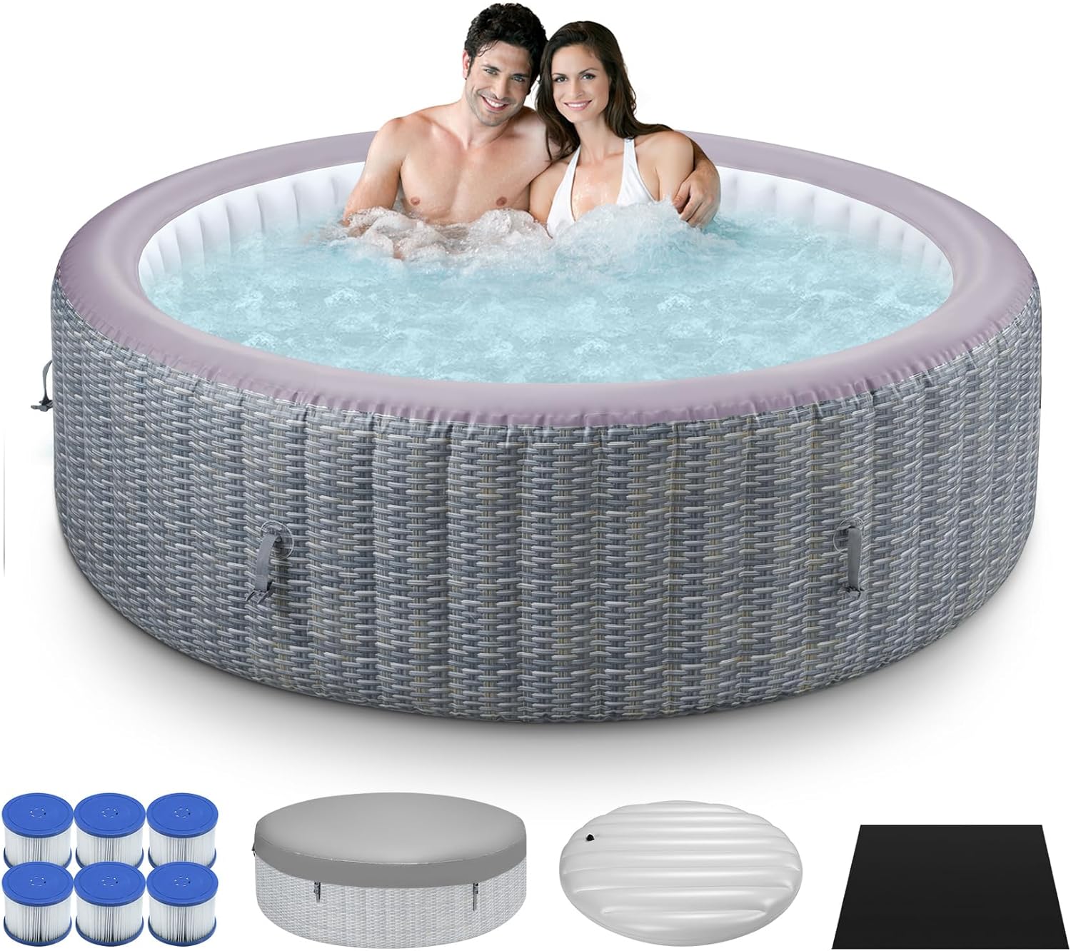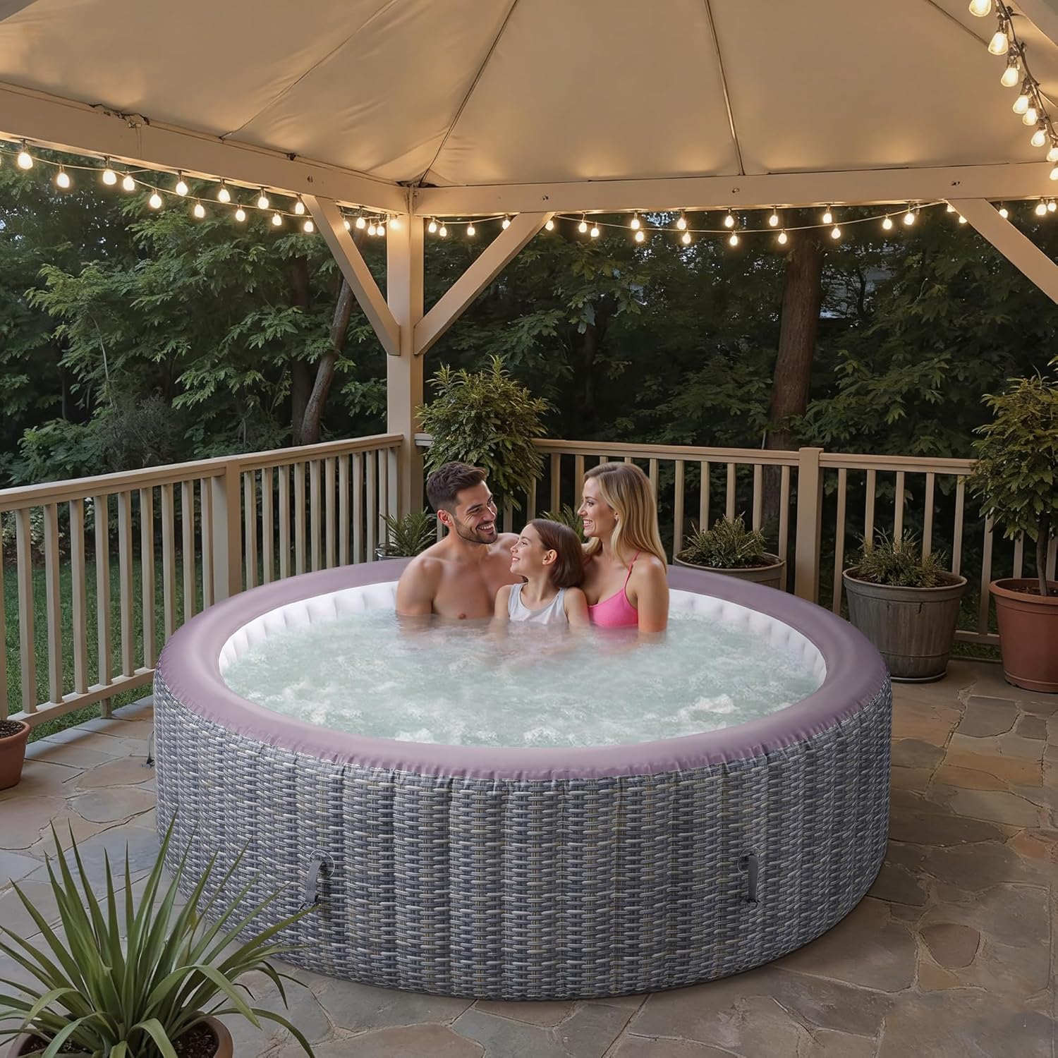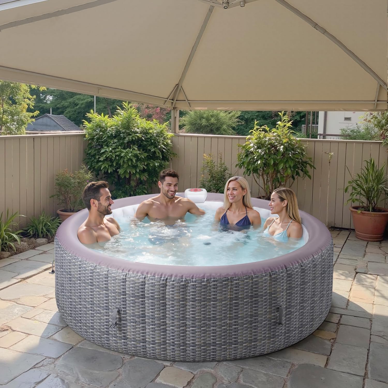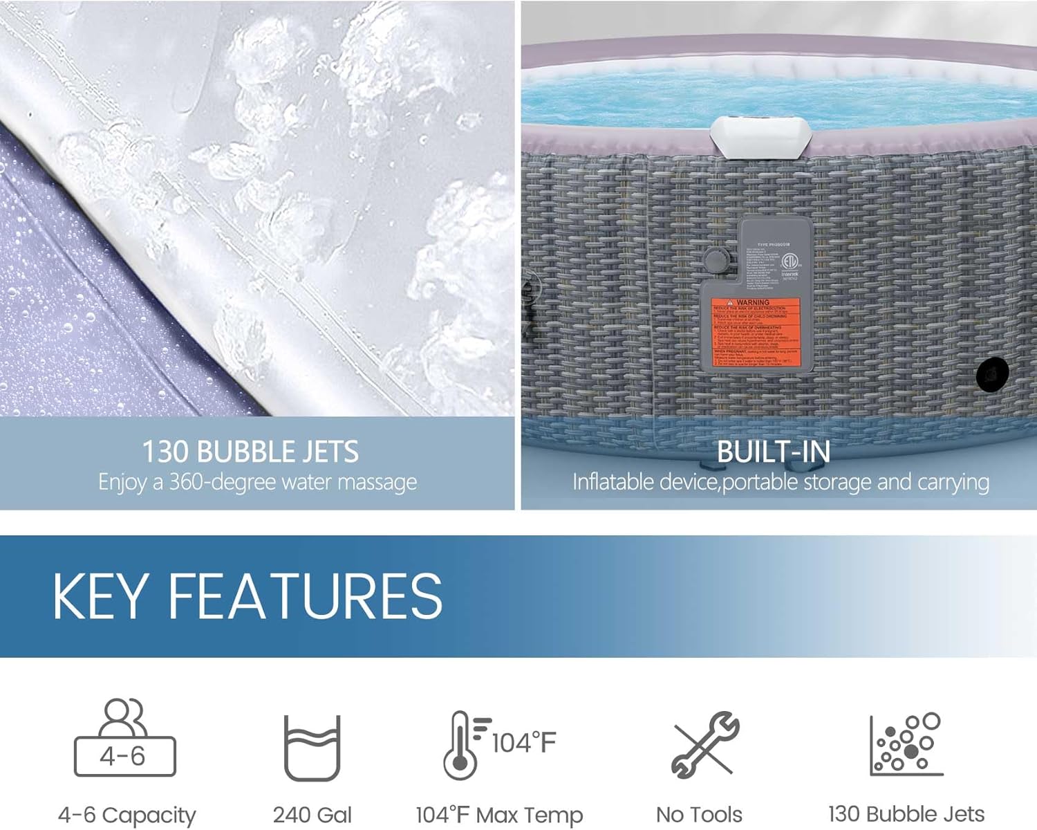 Portable Hot Tub 4-6 Person, Inflatable Hottub with Energy Efficient Spa Cover, 130 Air Jets with Heater Pump, Outdoor Spa for Relaxation, Cup Holder, 2 Filters, 1 Hand Pump, Round