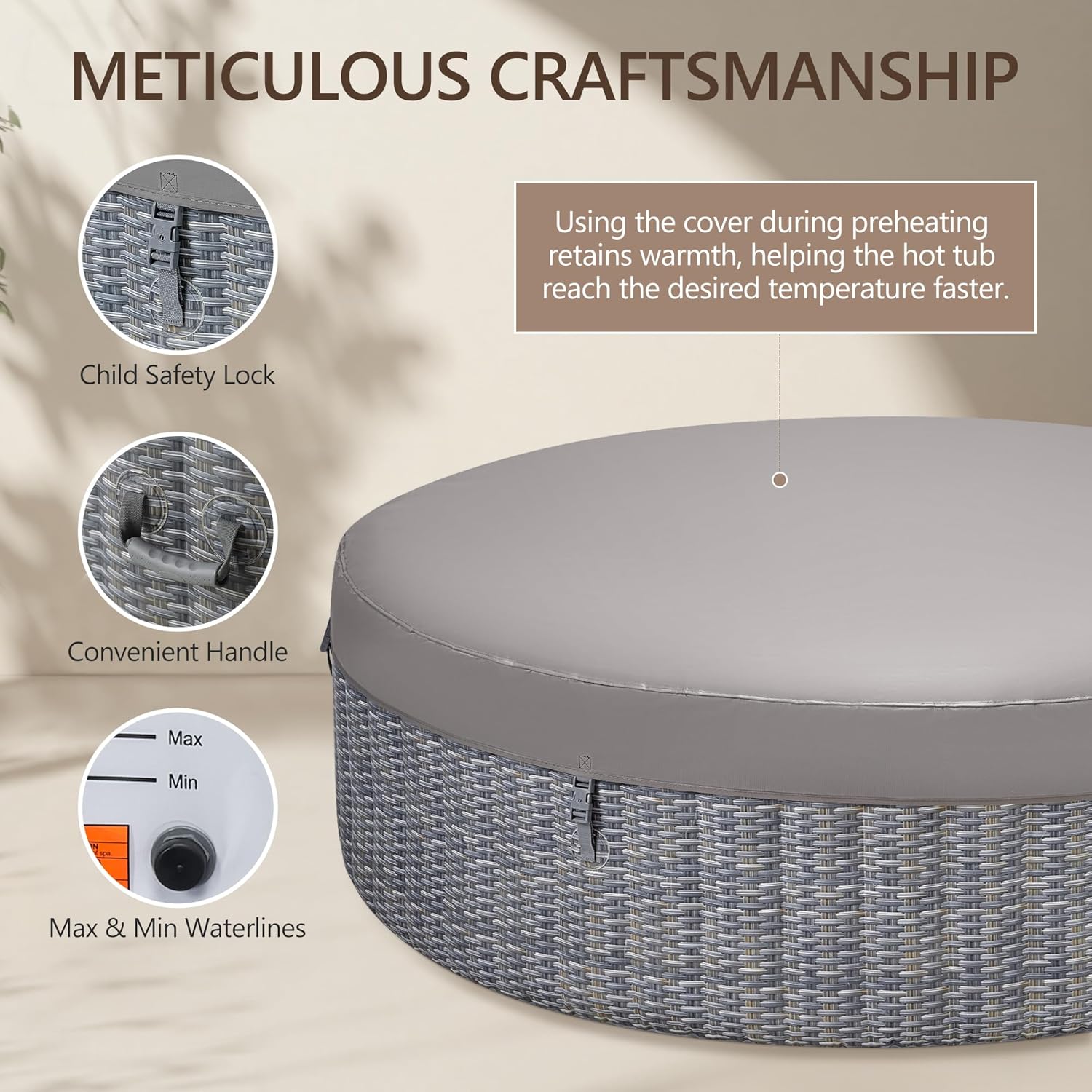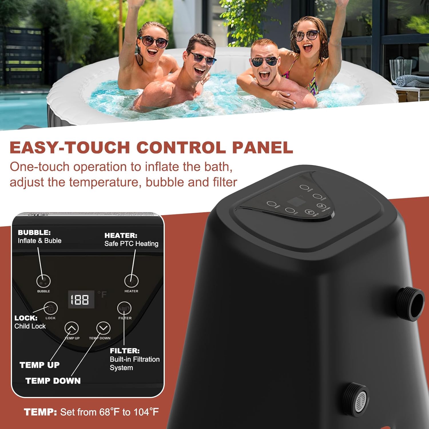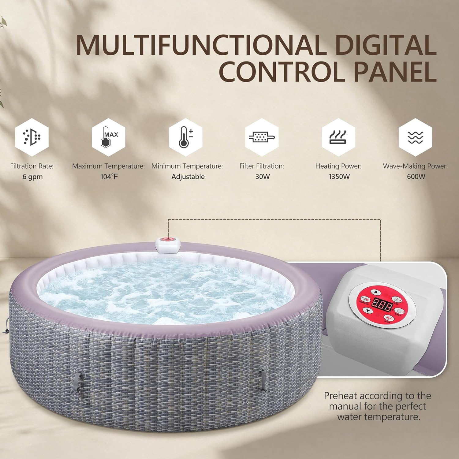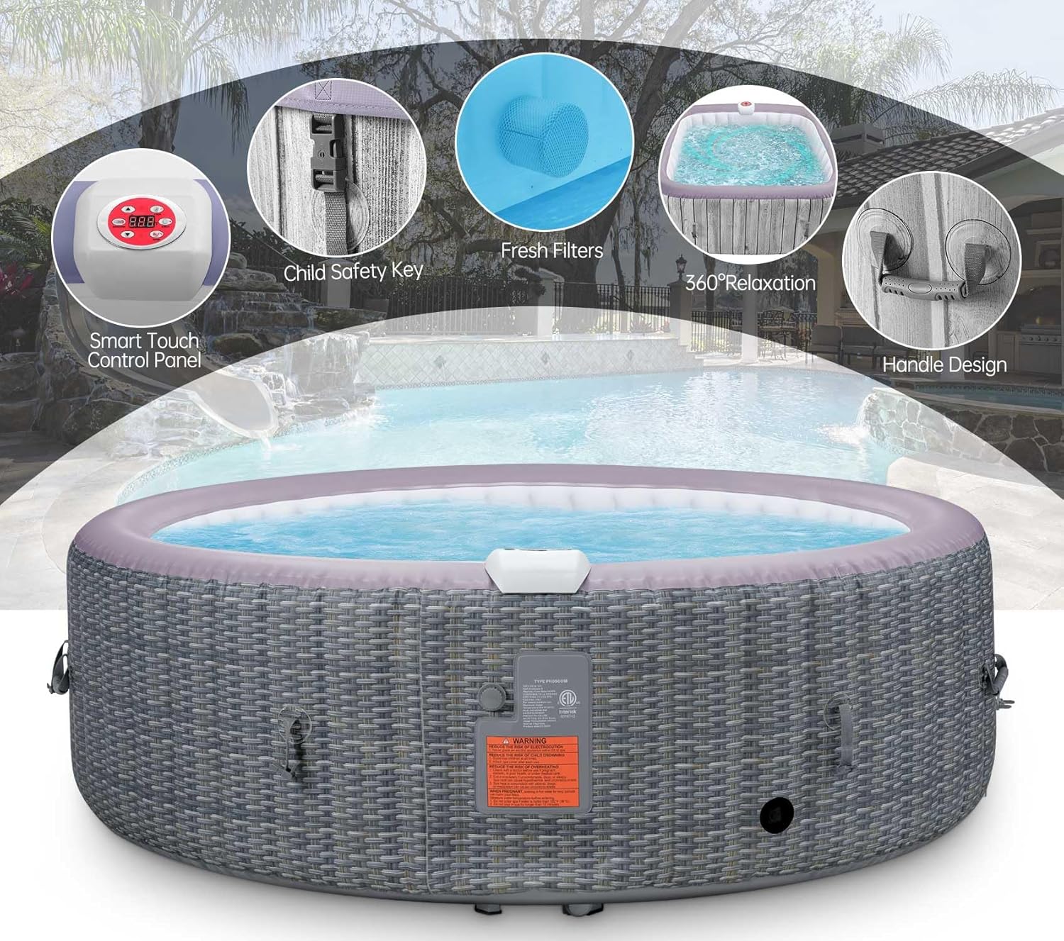 Portable Hot Tub 4-6 Person, Inflatable Hottub with Energy Efficient Spa Cover, 130 Air Jets with Heater Pump, Outdoor Spa for Relaxation, Cup Holder, 2 Filters, 1 Hand Pump, Round