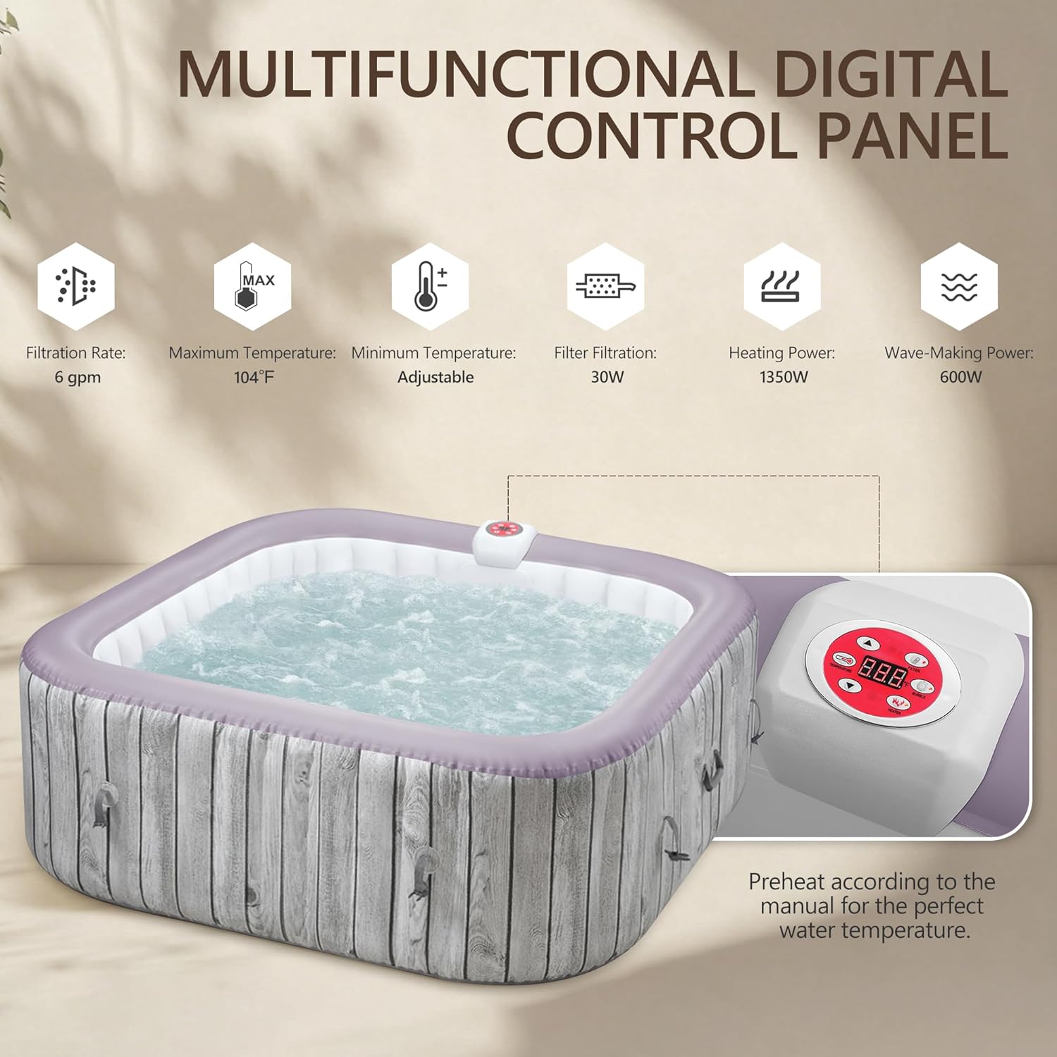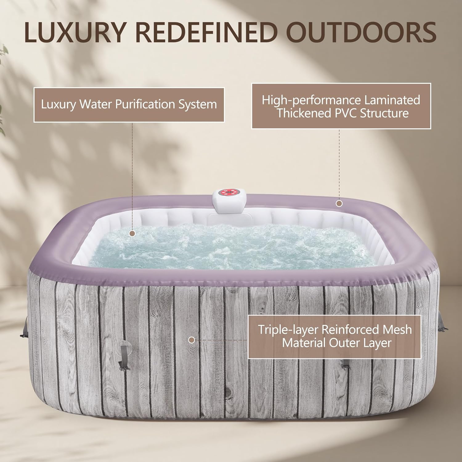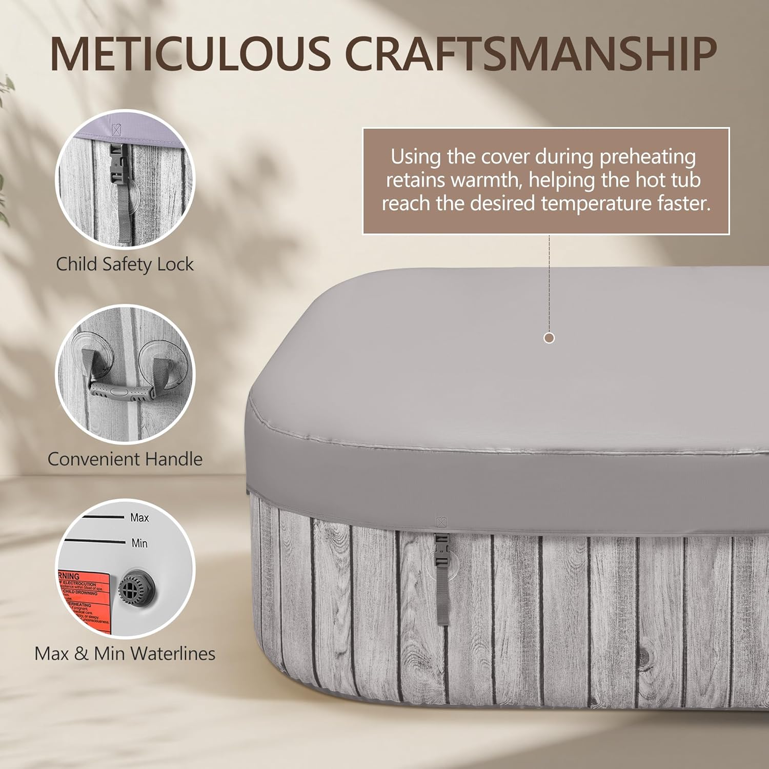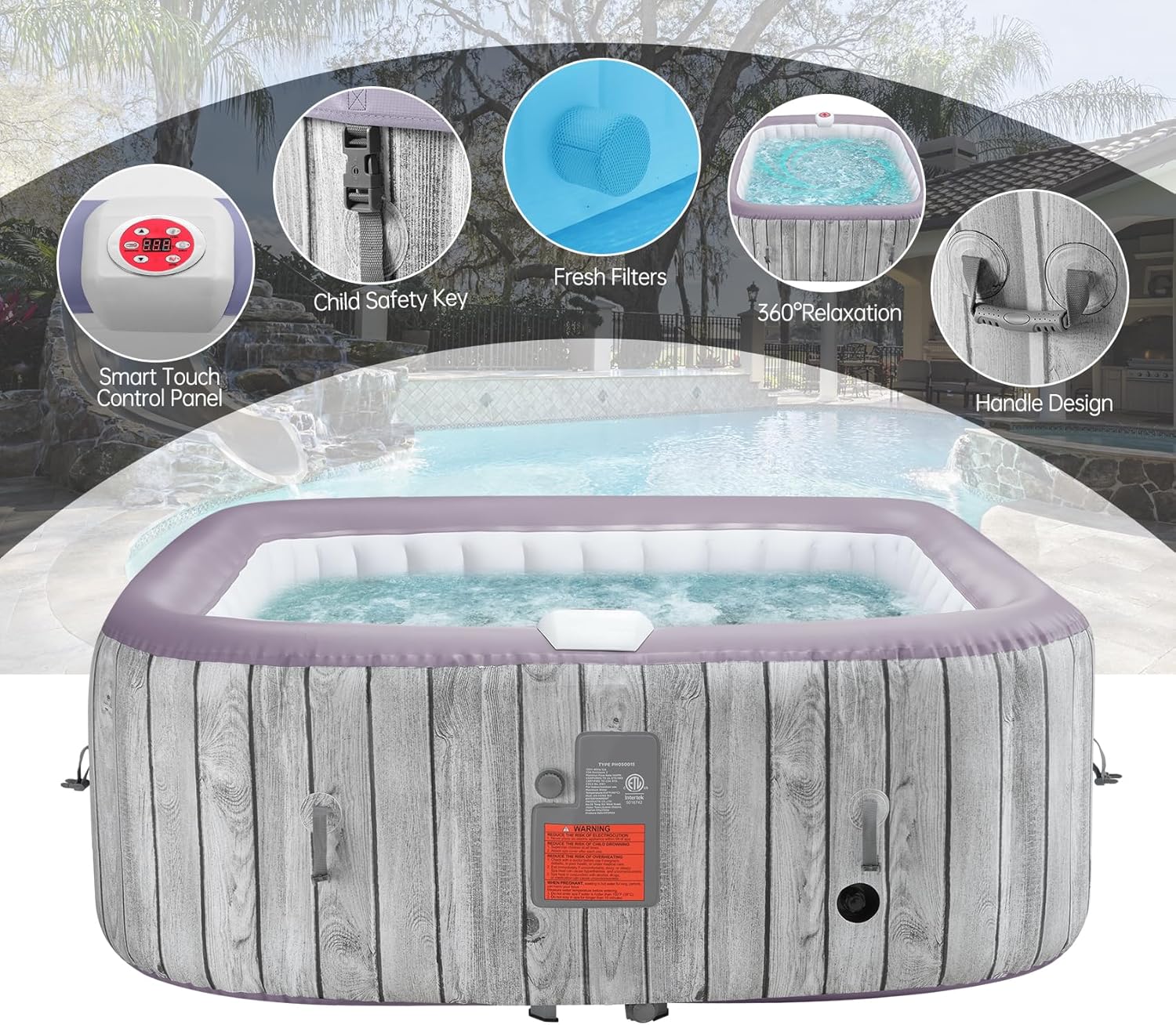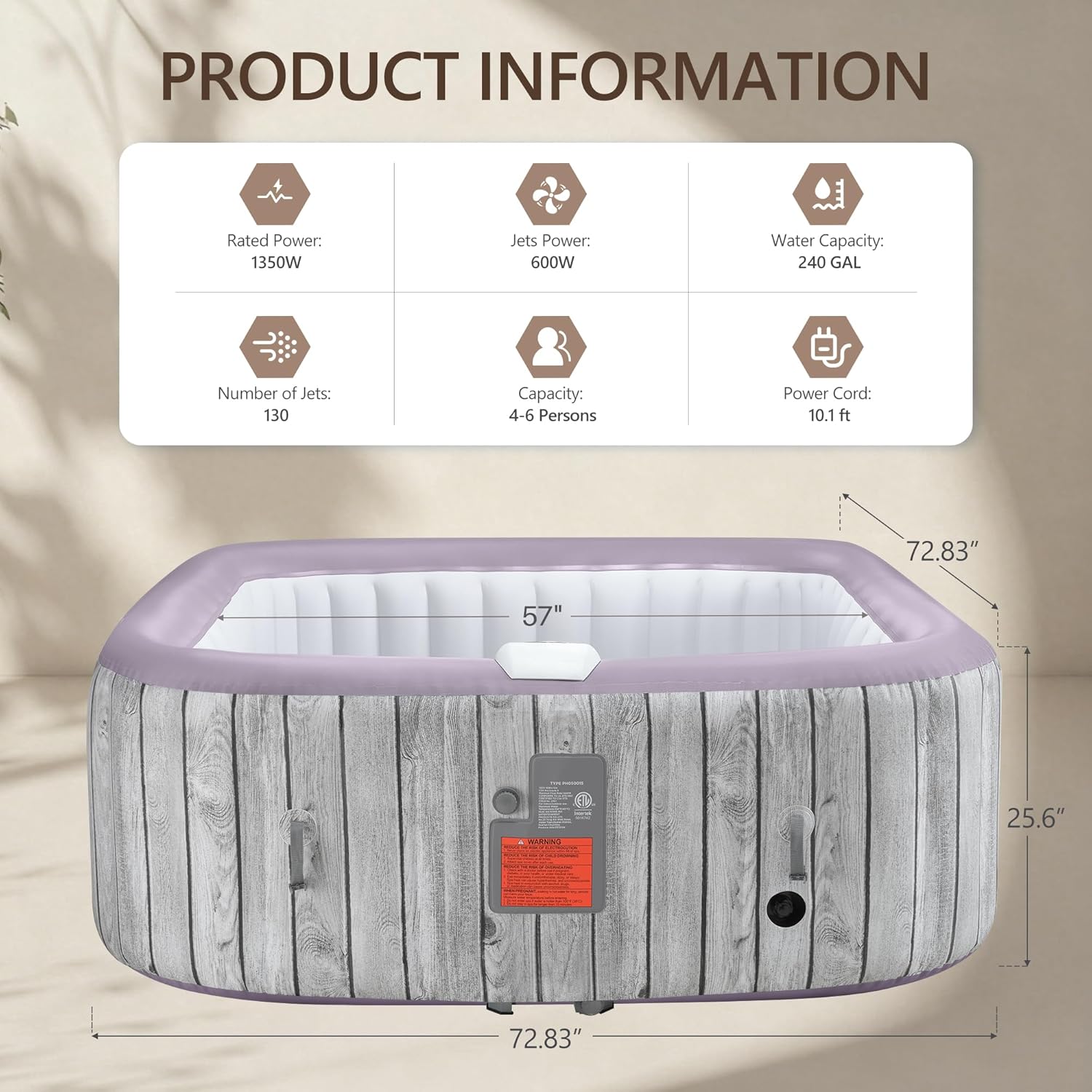 Inflatable Hot Tub for 4-6 Adults – Portable Blow Up Hot Tub with 130 Air Jets, FastFill System & Thermal Cover – Outdoor Spa Hot Tubs for Patio, Backyard & Travel Use (Laminated PVC Square)