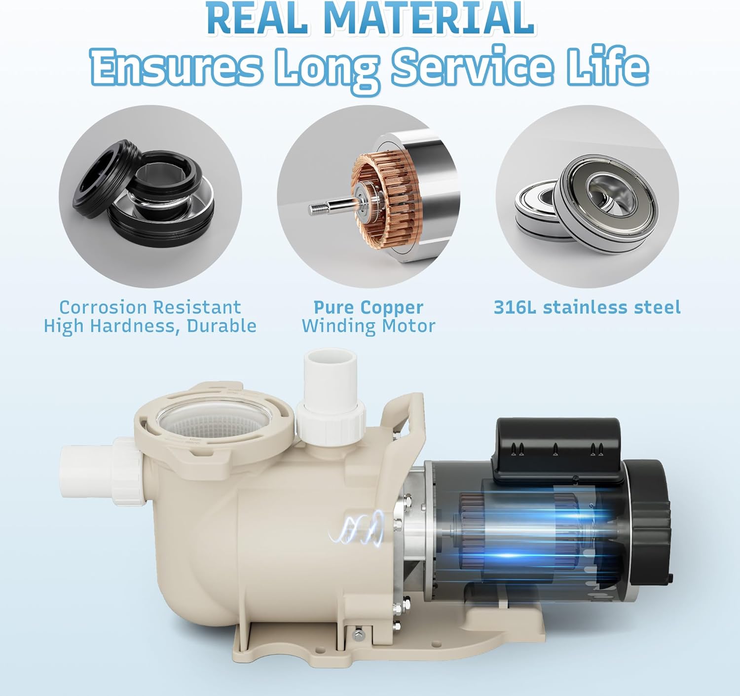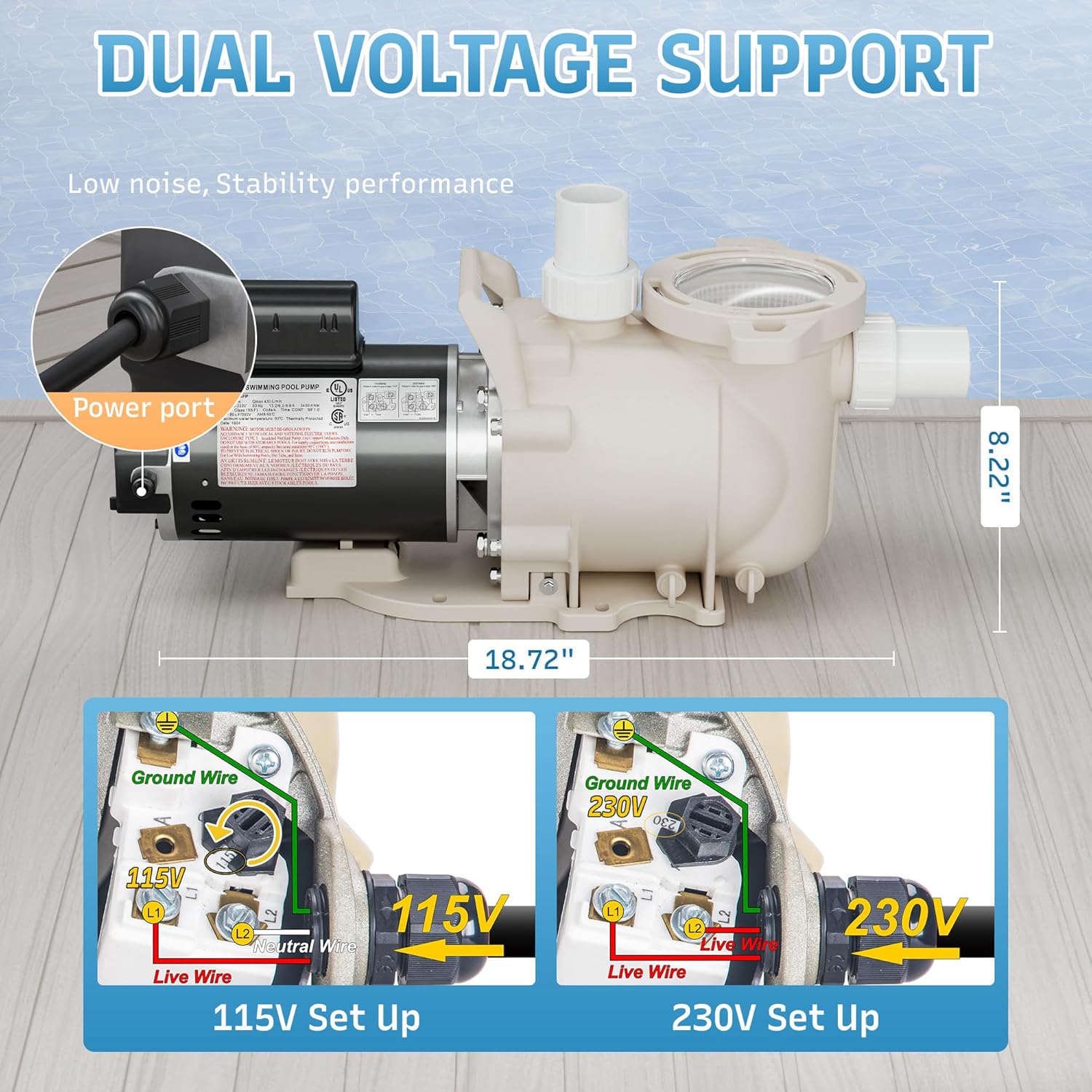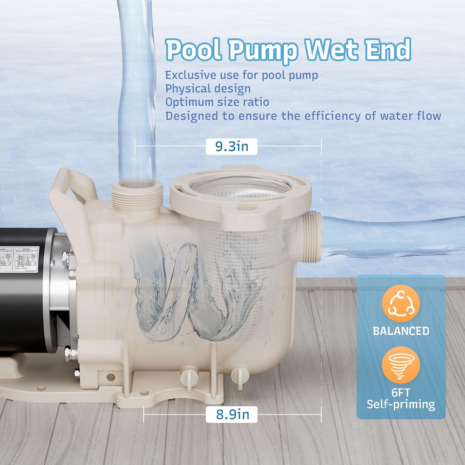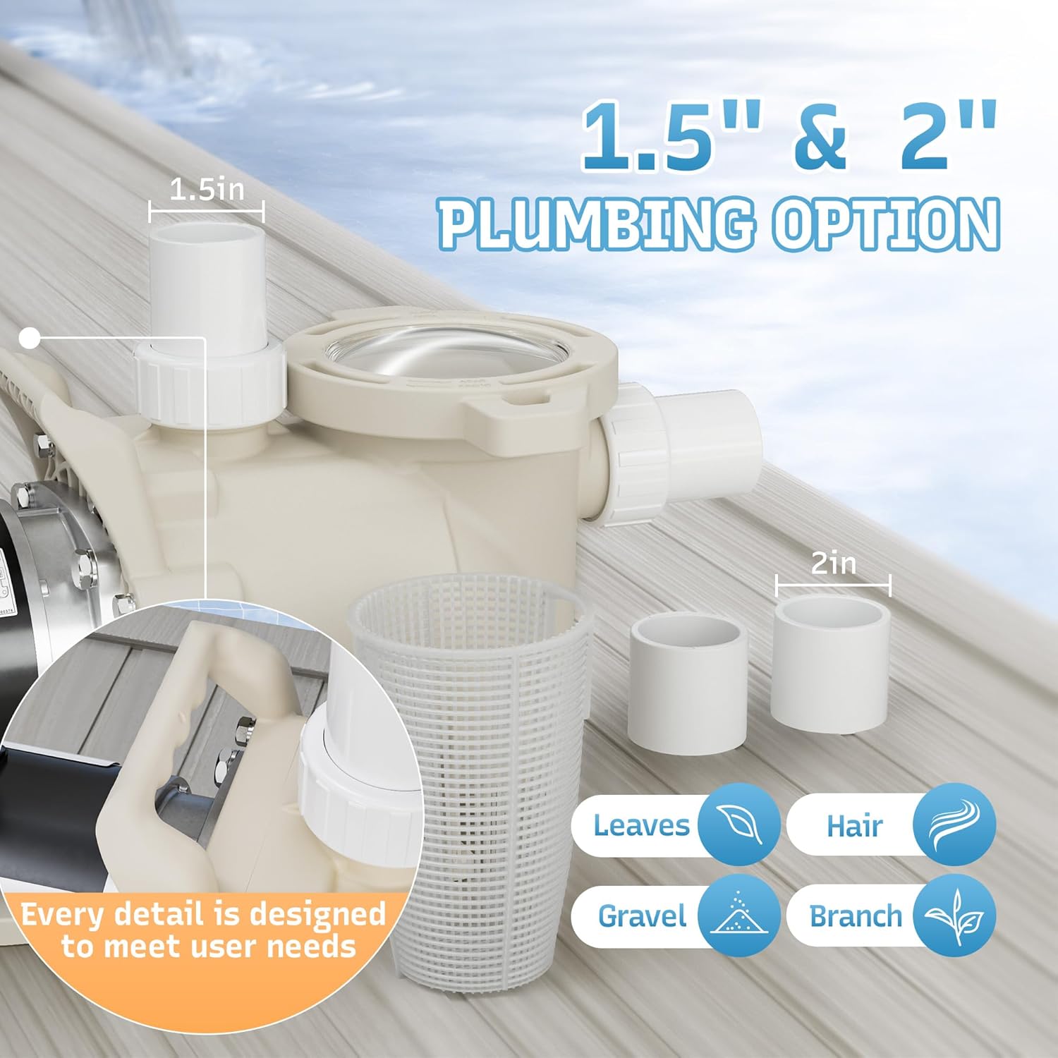 Single Speed Pool Pump 1.5HP, 115/208-230V, 6340GPH, In/Above Pool Pump, Low Nosie, High Flow, Powerful Self Primming Swimming Pool Pumps Inground with 2"/1.5" Fittings - 2 Year Warranty