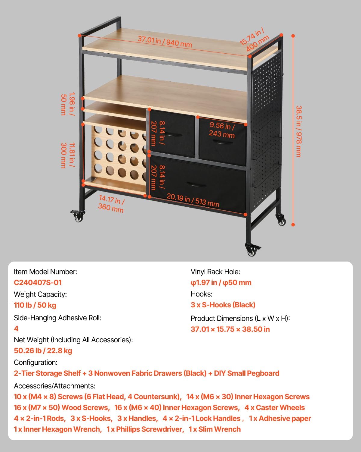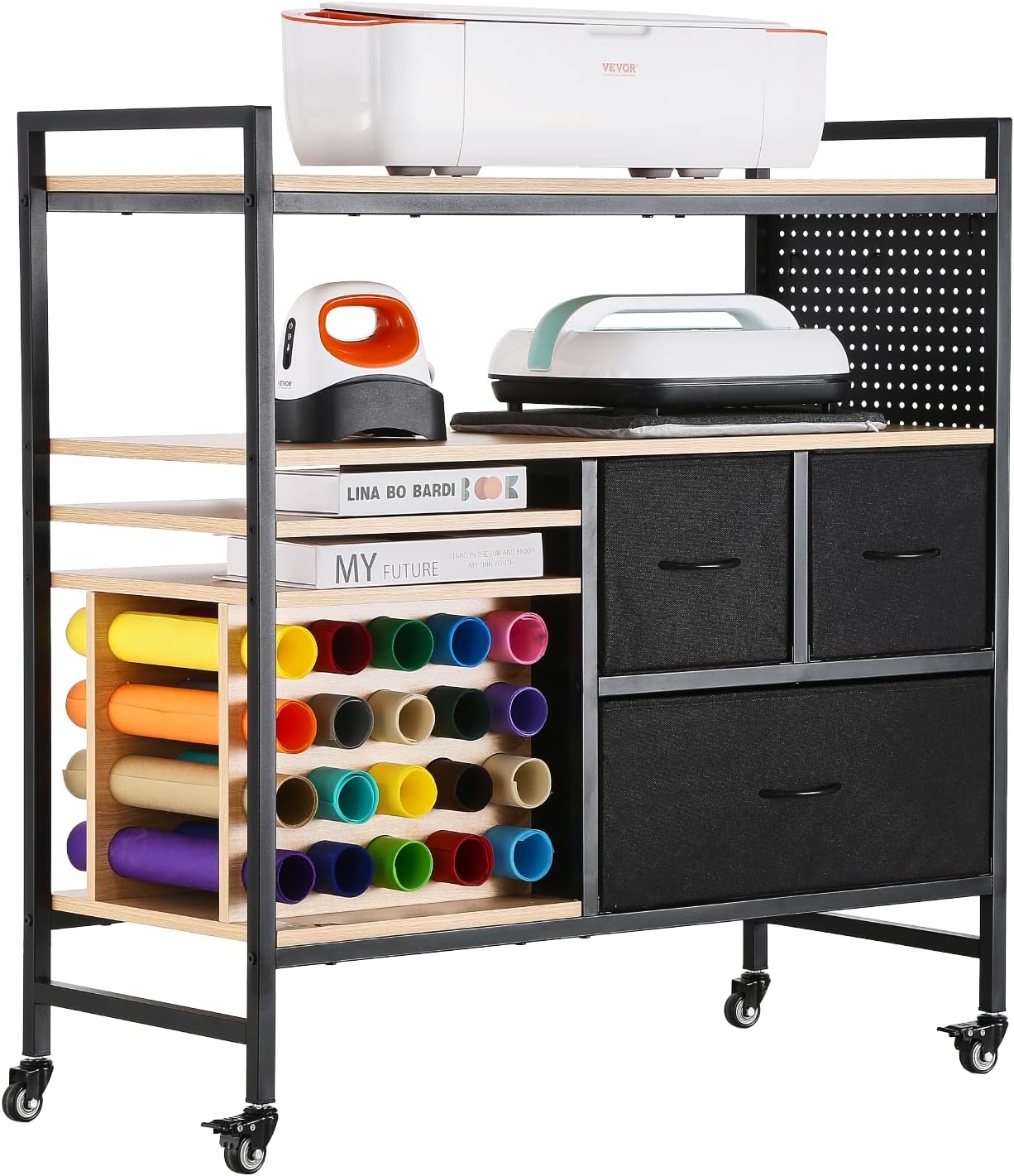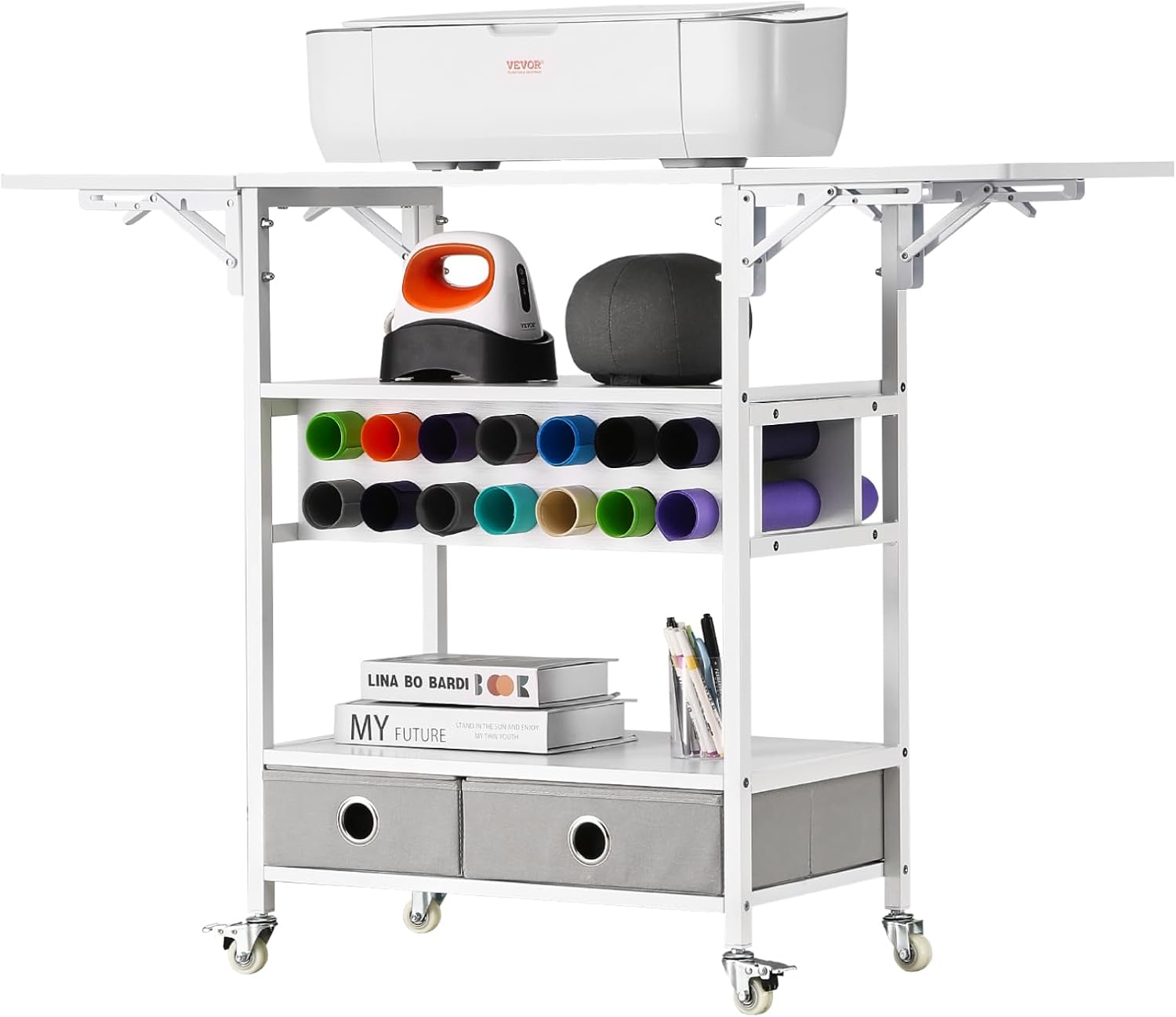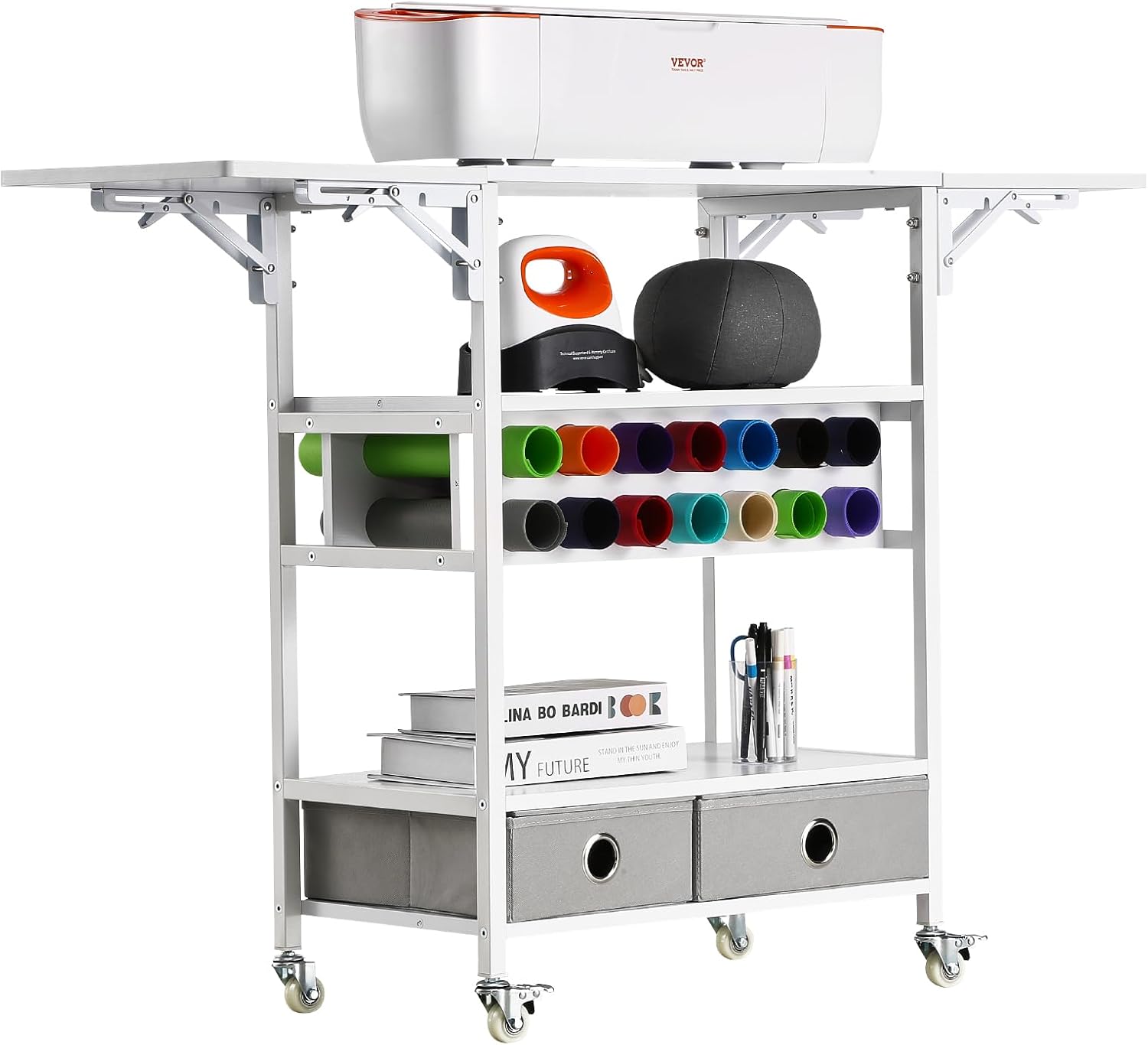 VEVOR Rolling Craft Cart and Storage Table, Compatible with Cricut Machines, Collapsible Cricut Table with Foldable Sides, Craft Rolling Storage Organizer with 16 Vinyl Roll Holders and 2 Drawers