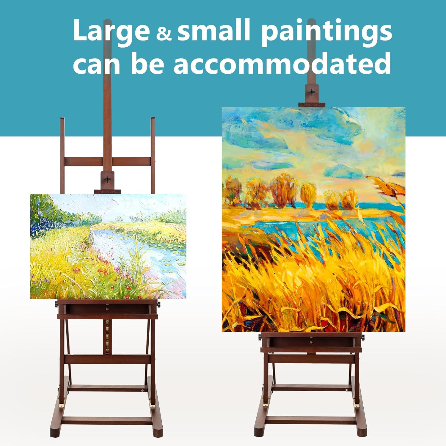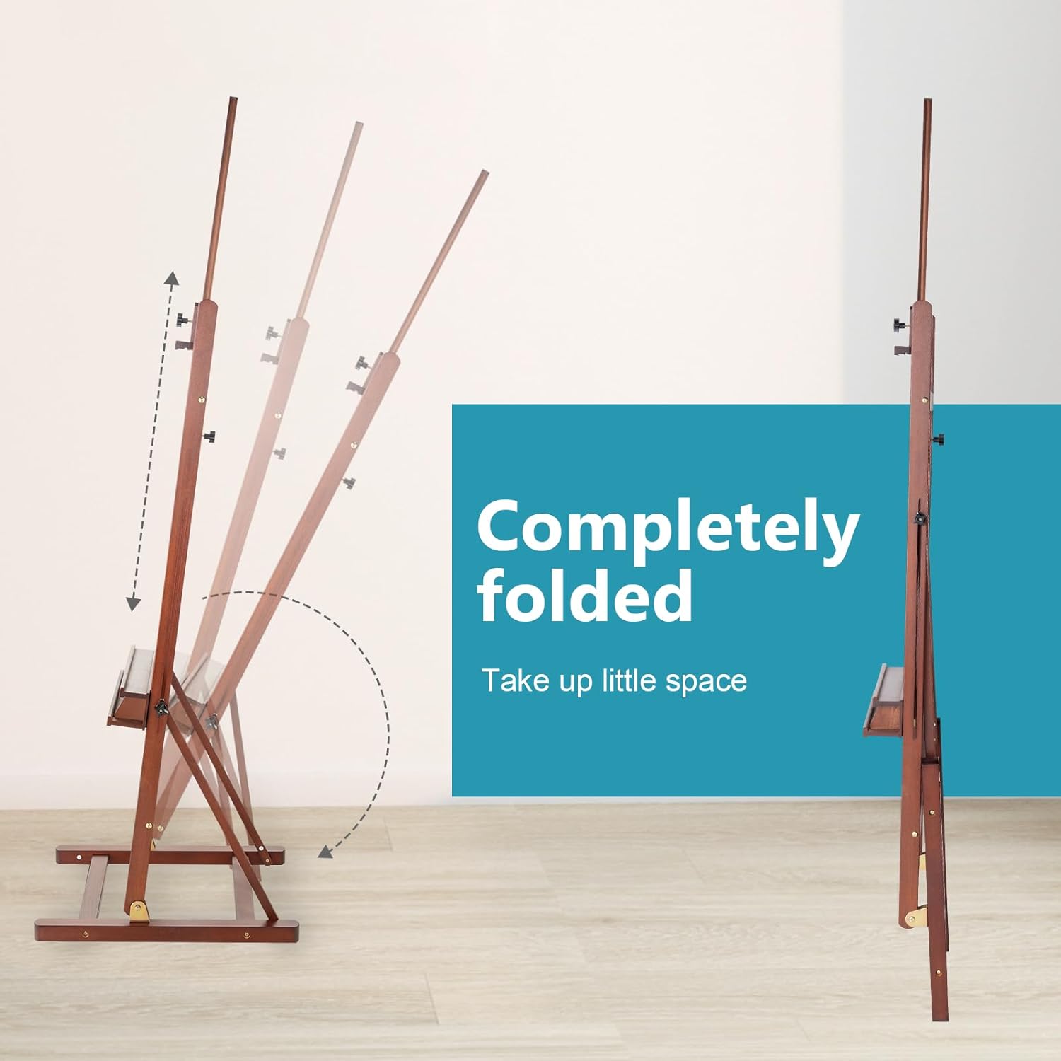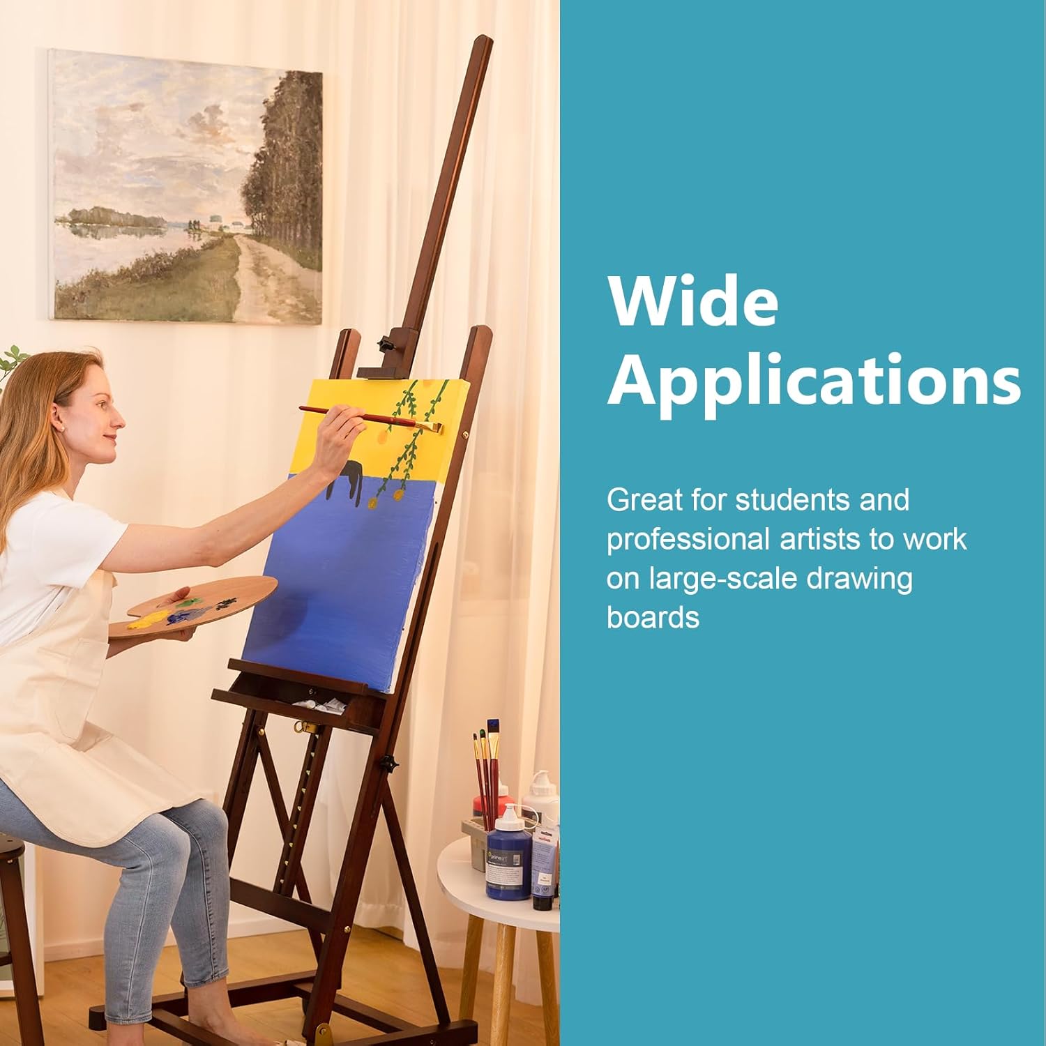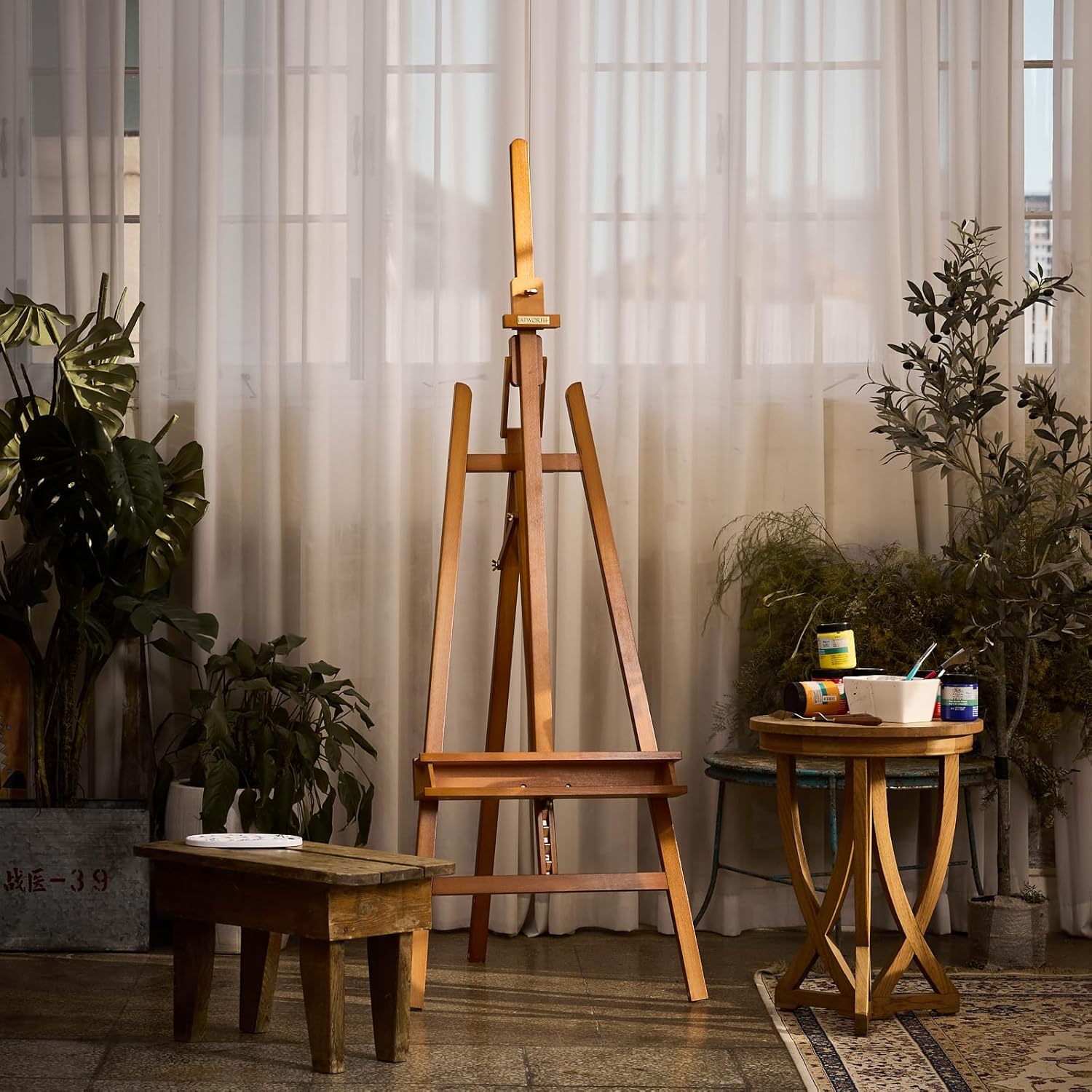 H-Frame Studio Easel, Beechwood Artist Easel Storage Tray, Adjustable Floor Easel Stand Holding Canvas up to 51Inches for Painting, Brown