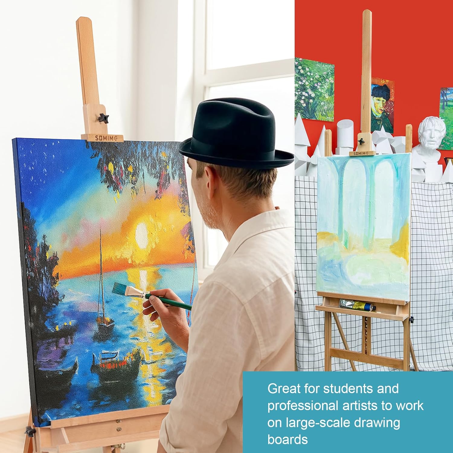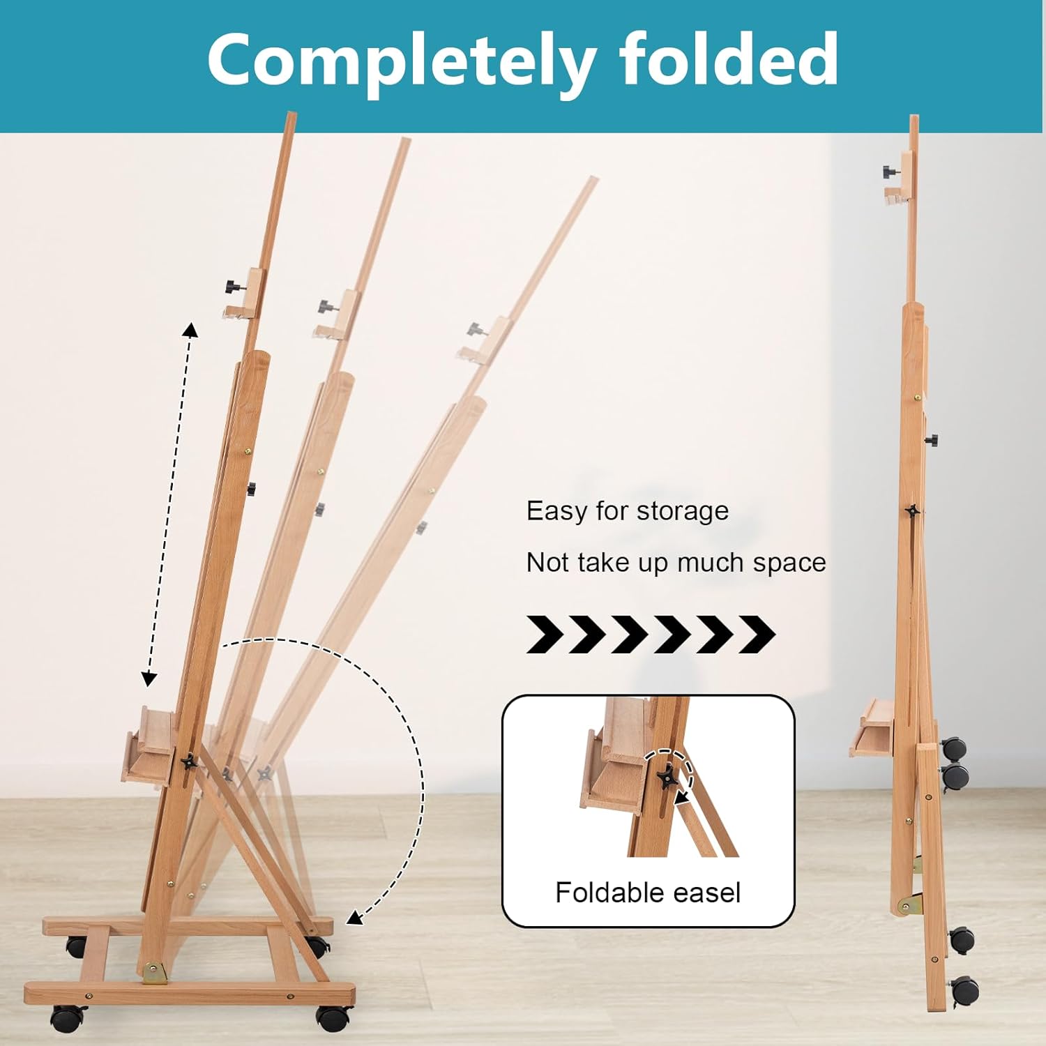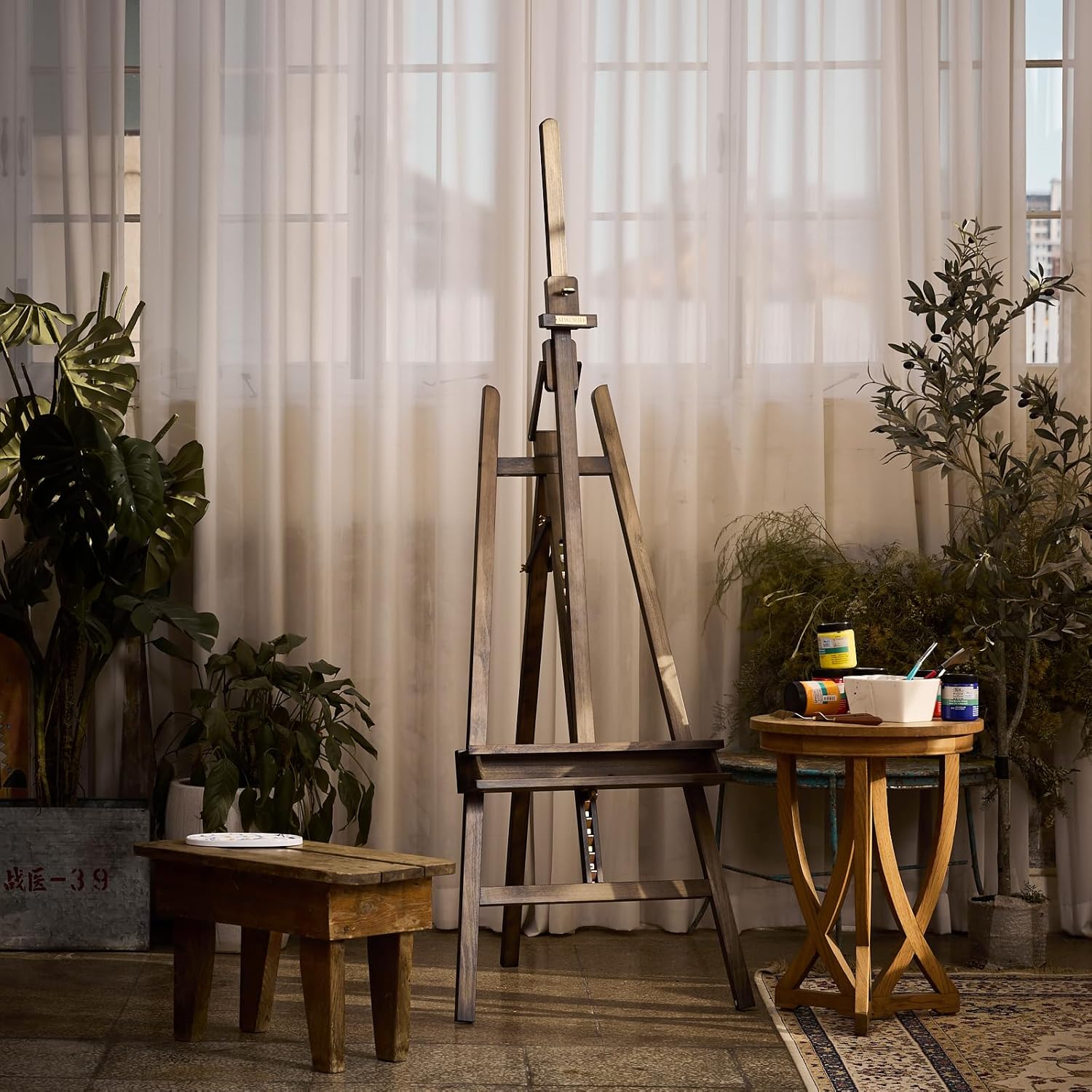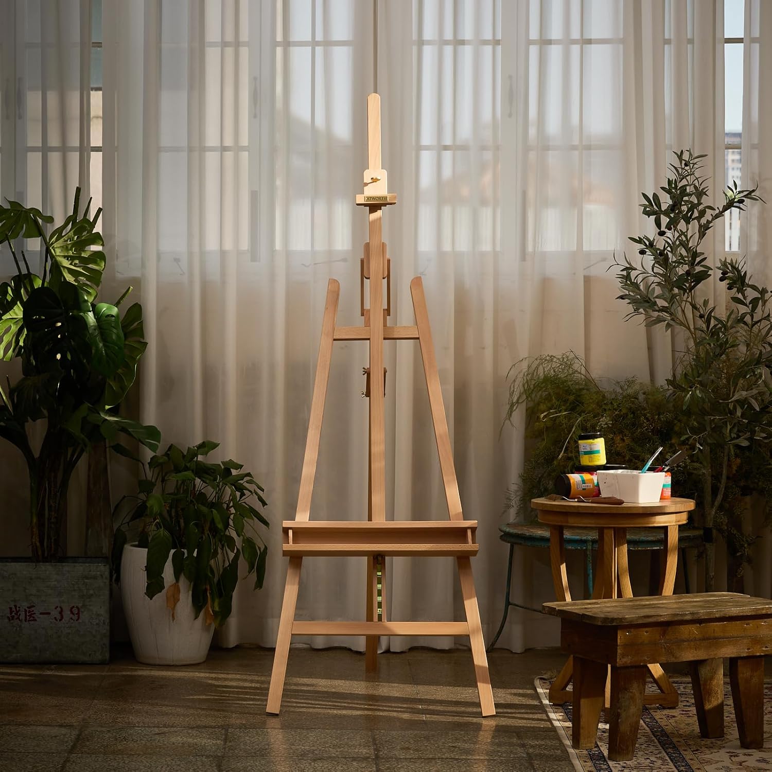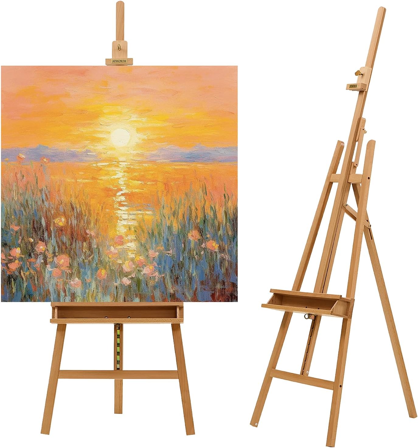 H-Frame Studio Easel, Beechwood Artist Easel Storage Tray, Adjustable Floor Easel Stand Holding Canvas up to 51Inches for Painting, Brown