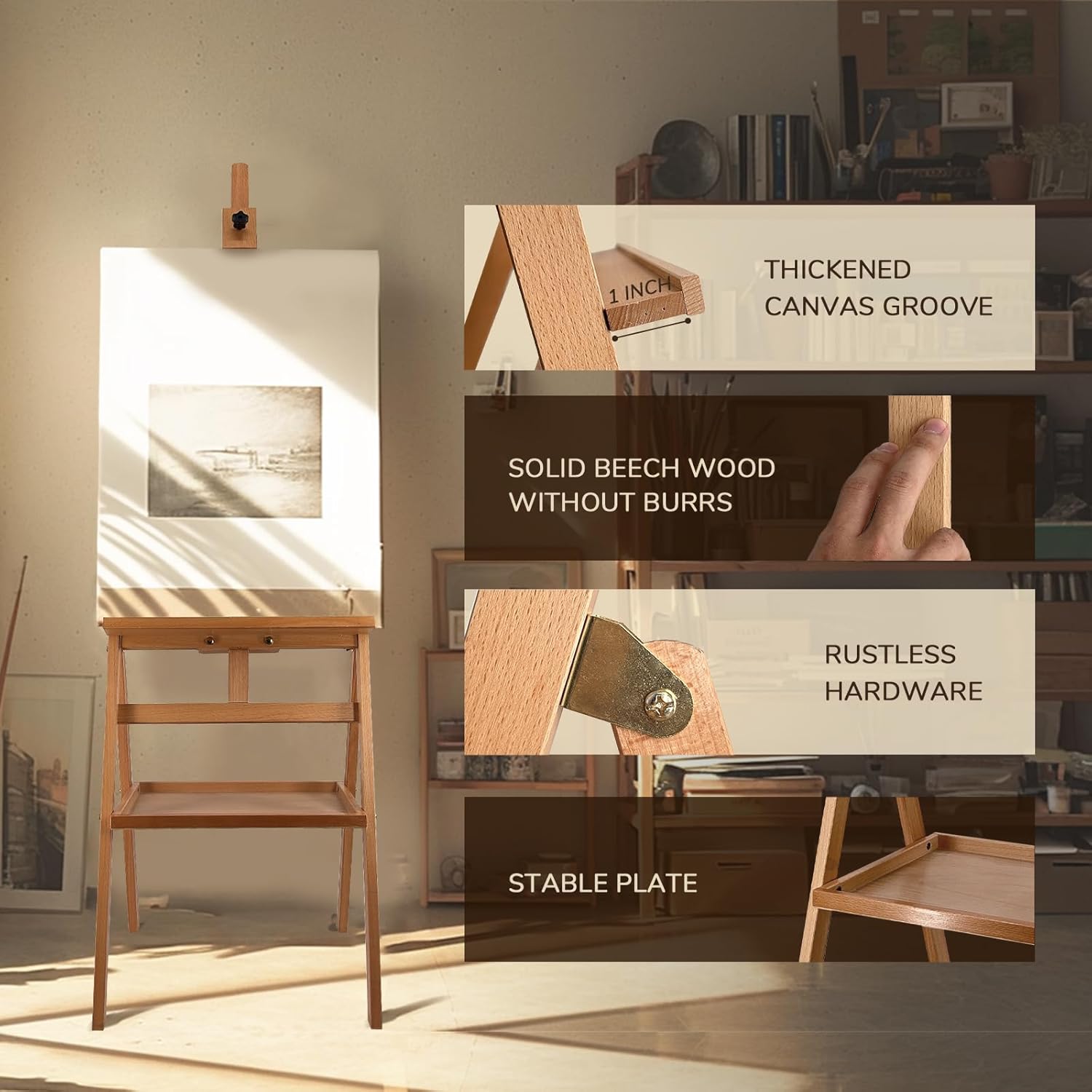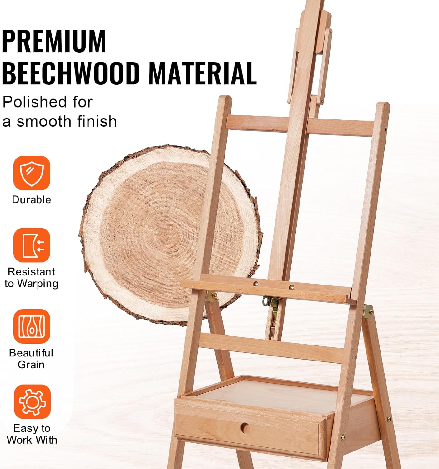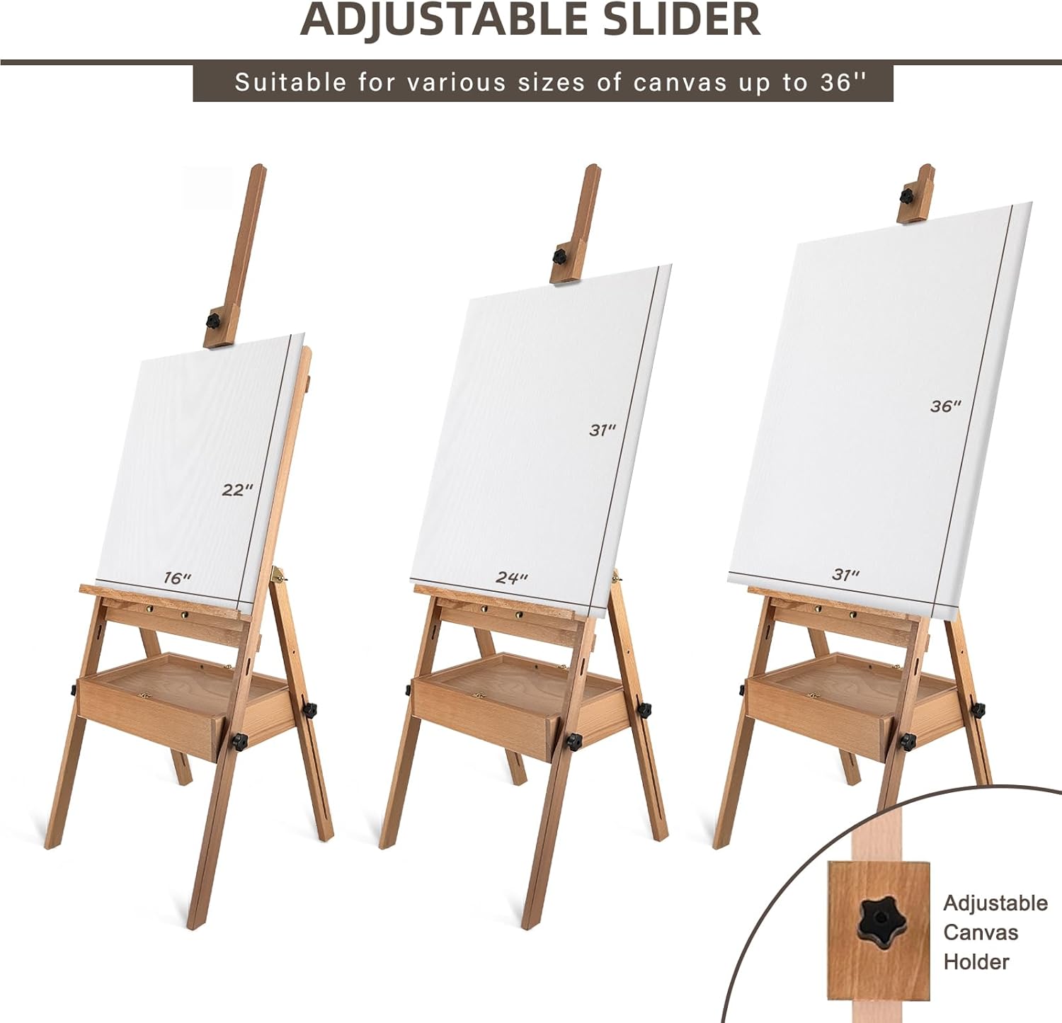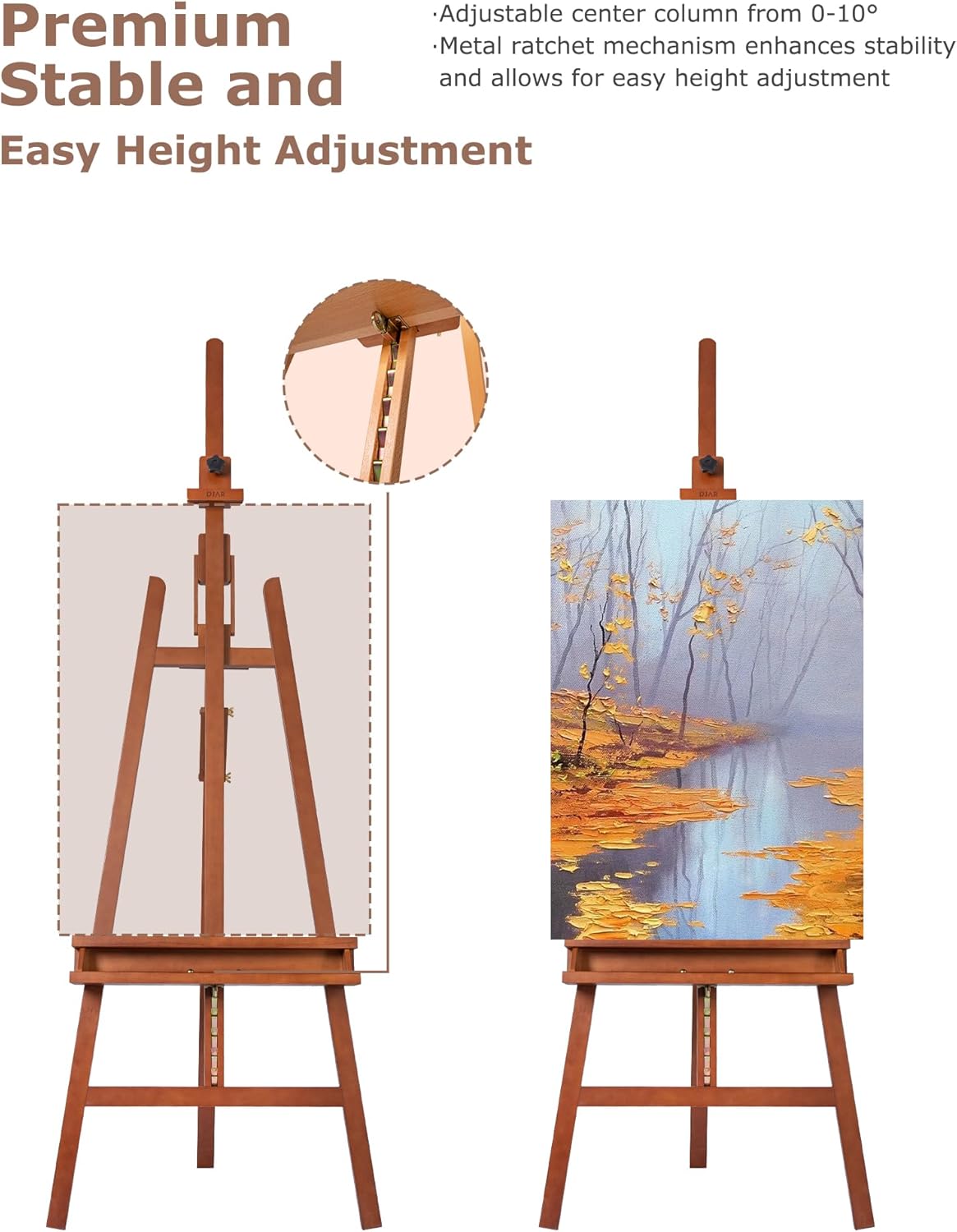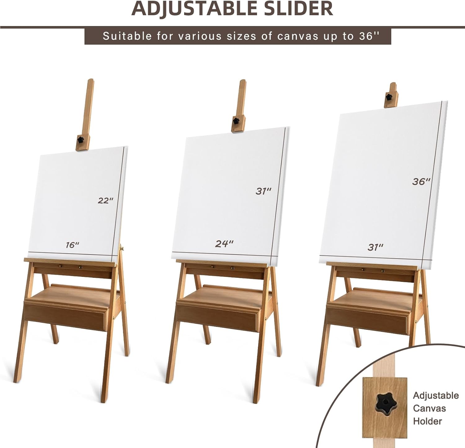 Large Solid Beech Wood Painting Easel with Storage Drawer(60"~75" H), H-Frame Adjustable Wooden Easel Stand with Signature Box for Adults, Students,Sturdy Canvas Holder up to 36''