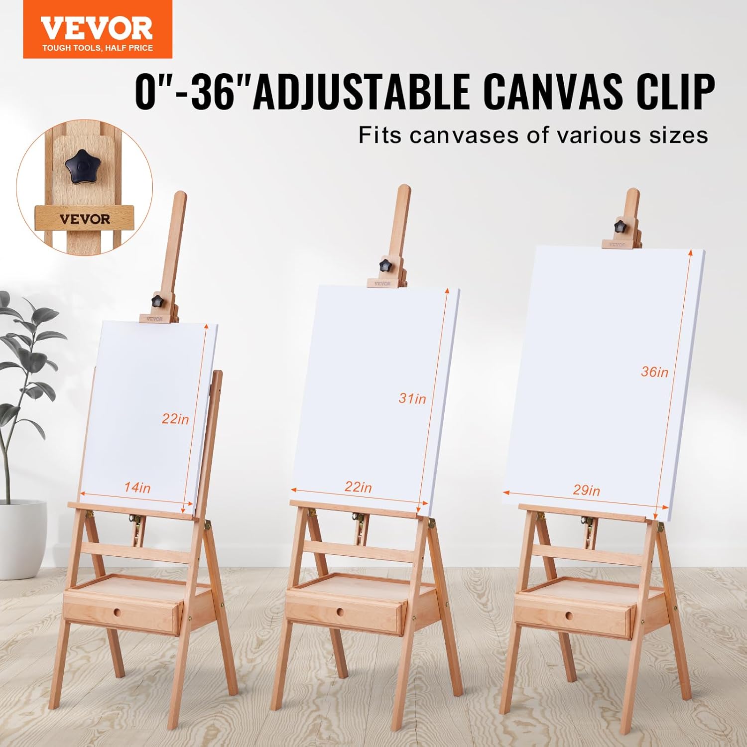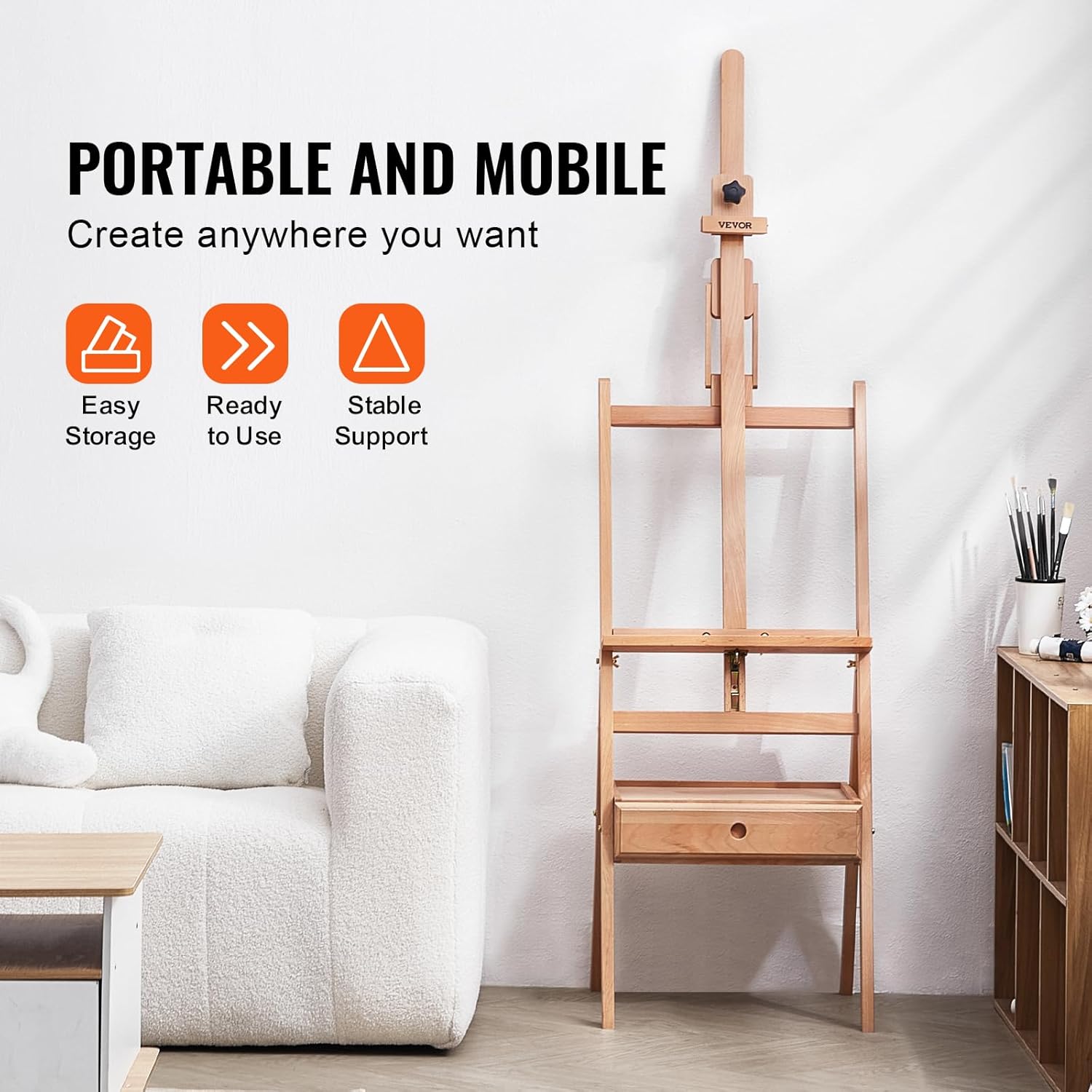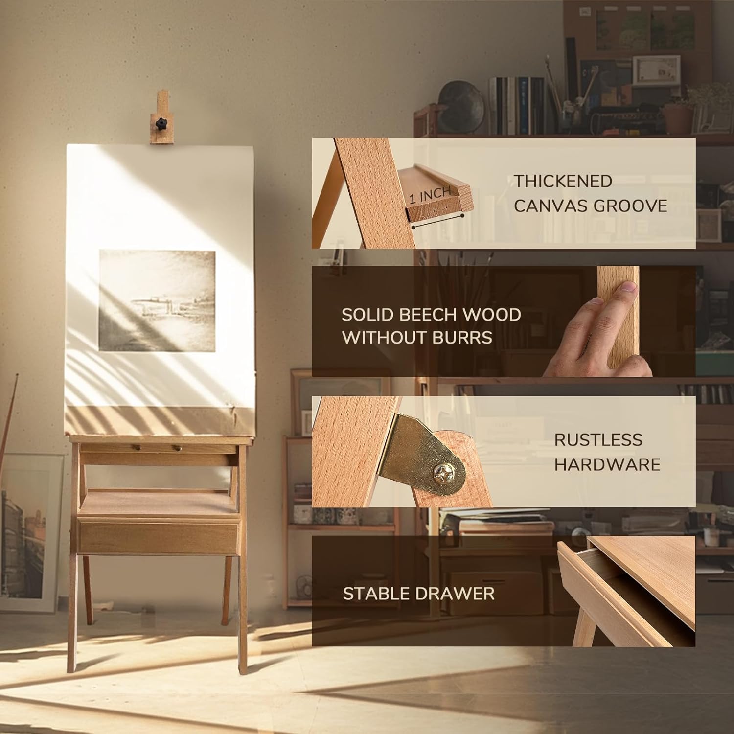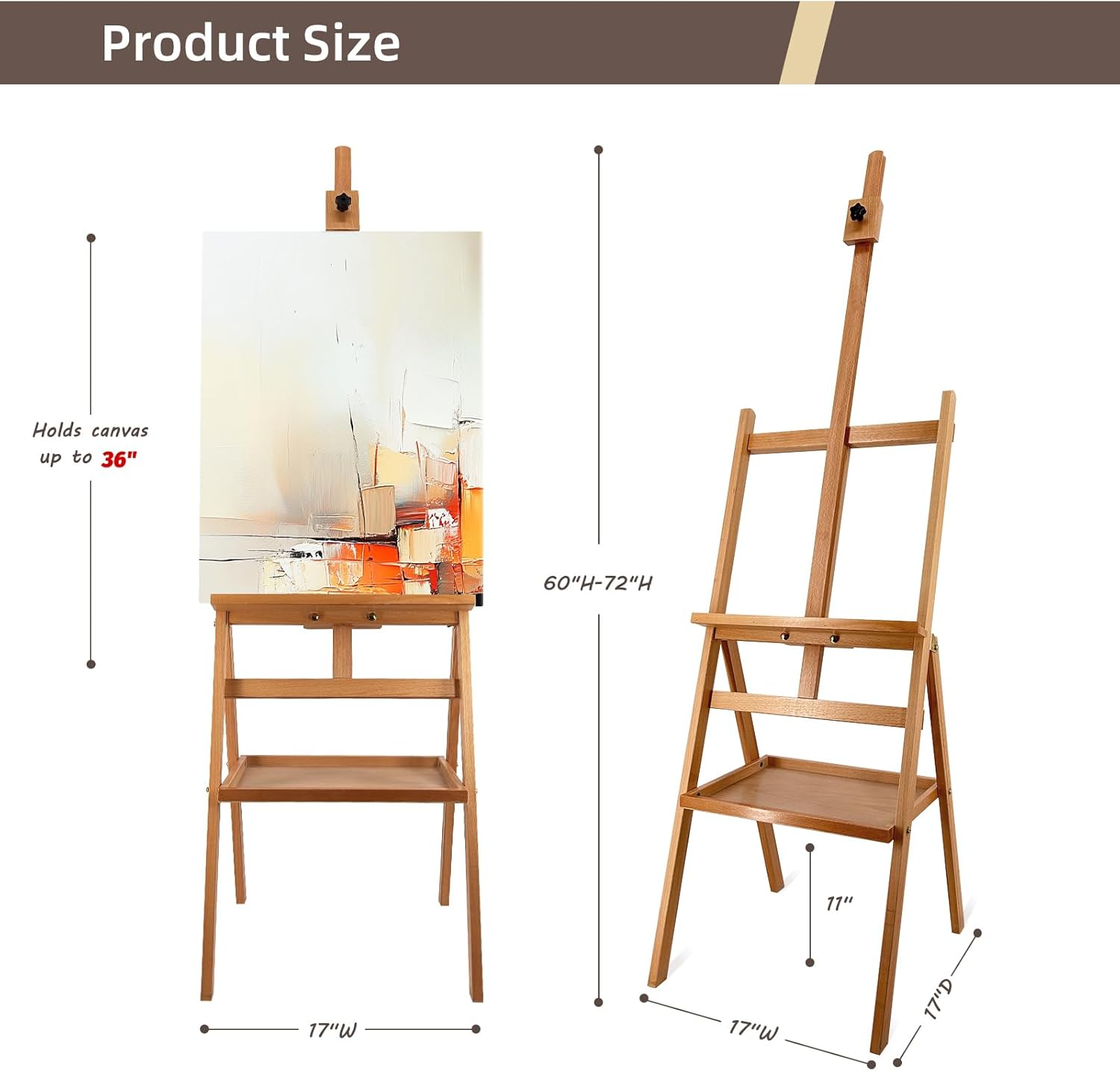 Large Solid Beech Wood Painting Easel with Storage Drawer(60"~75" H), H-Frame Adjustable Wooden Easel Stand with Signature Box for Adults, Students,Sturdy Canvas Holder up to 36''