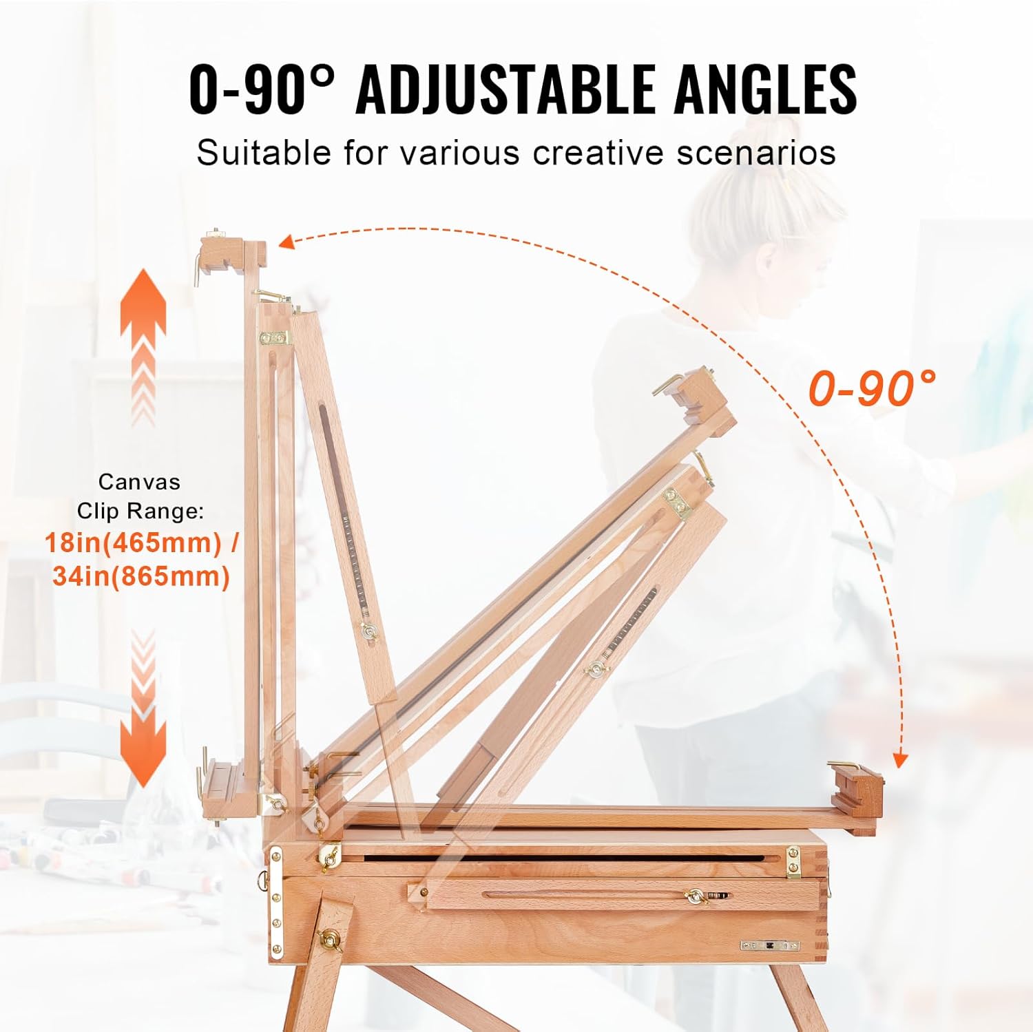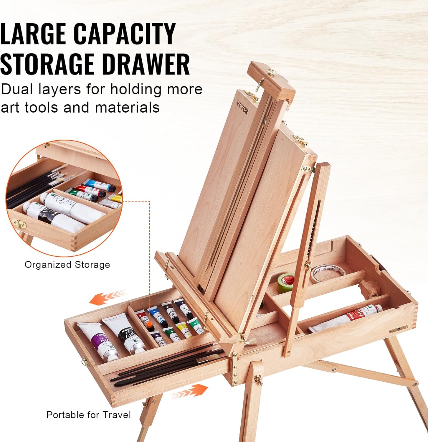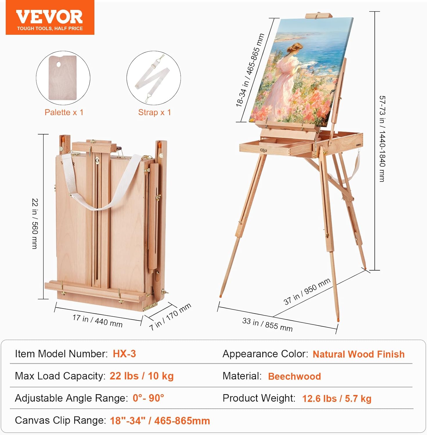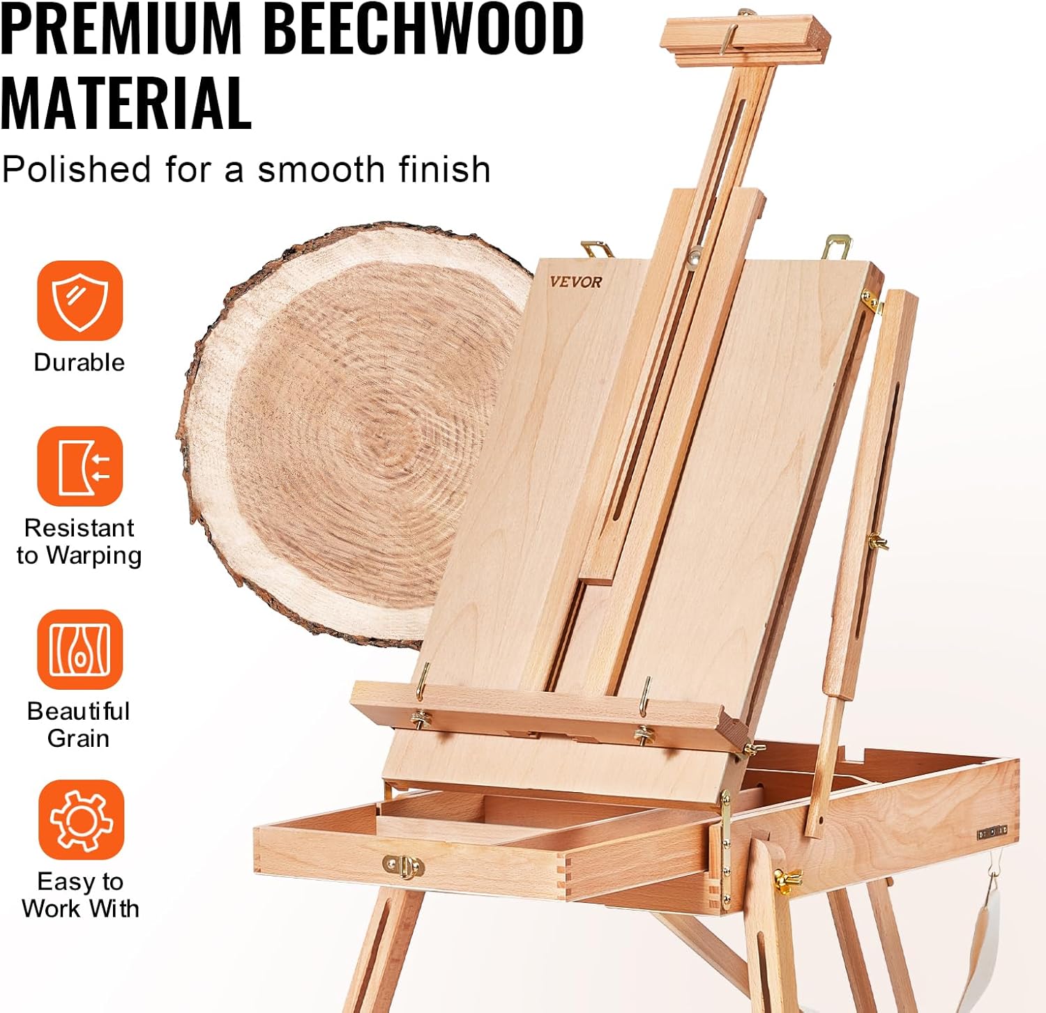 VEVOR French Easel, Hold Canvas to 34", Beechwood Foldable Sketchbox Easel with Drawer, Palette and Strap, Angle and Height Adjustable, Portable Wooden Art Painting Easel for Studio and Field