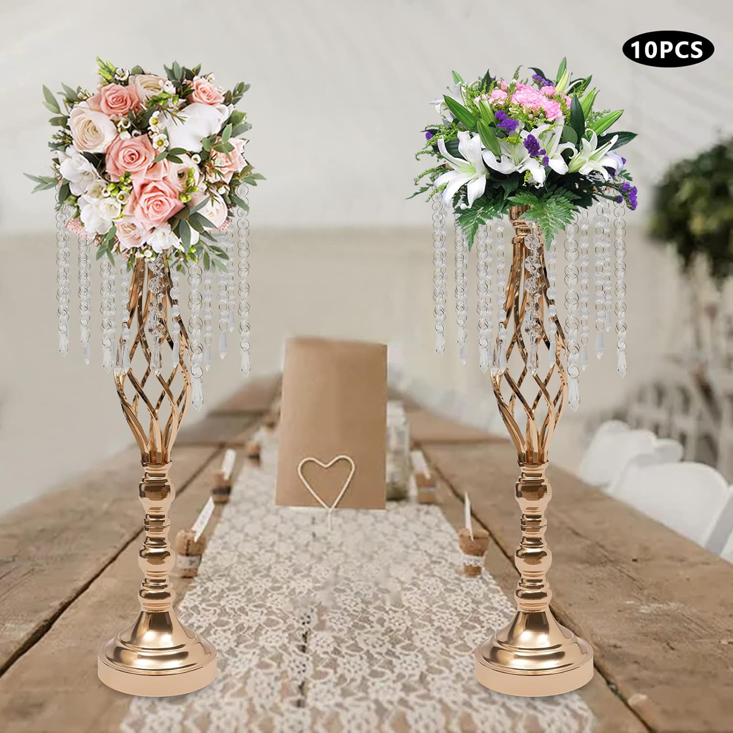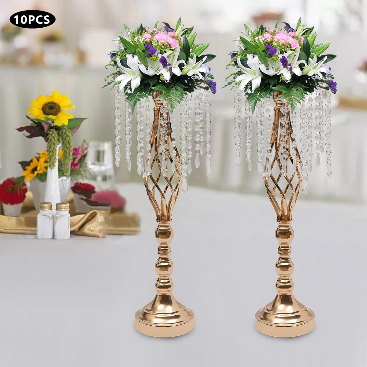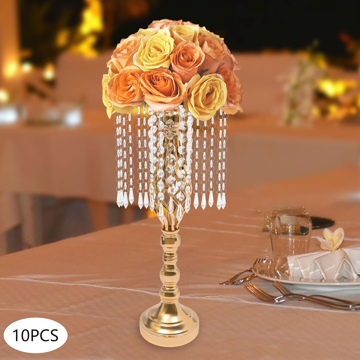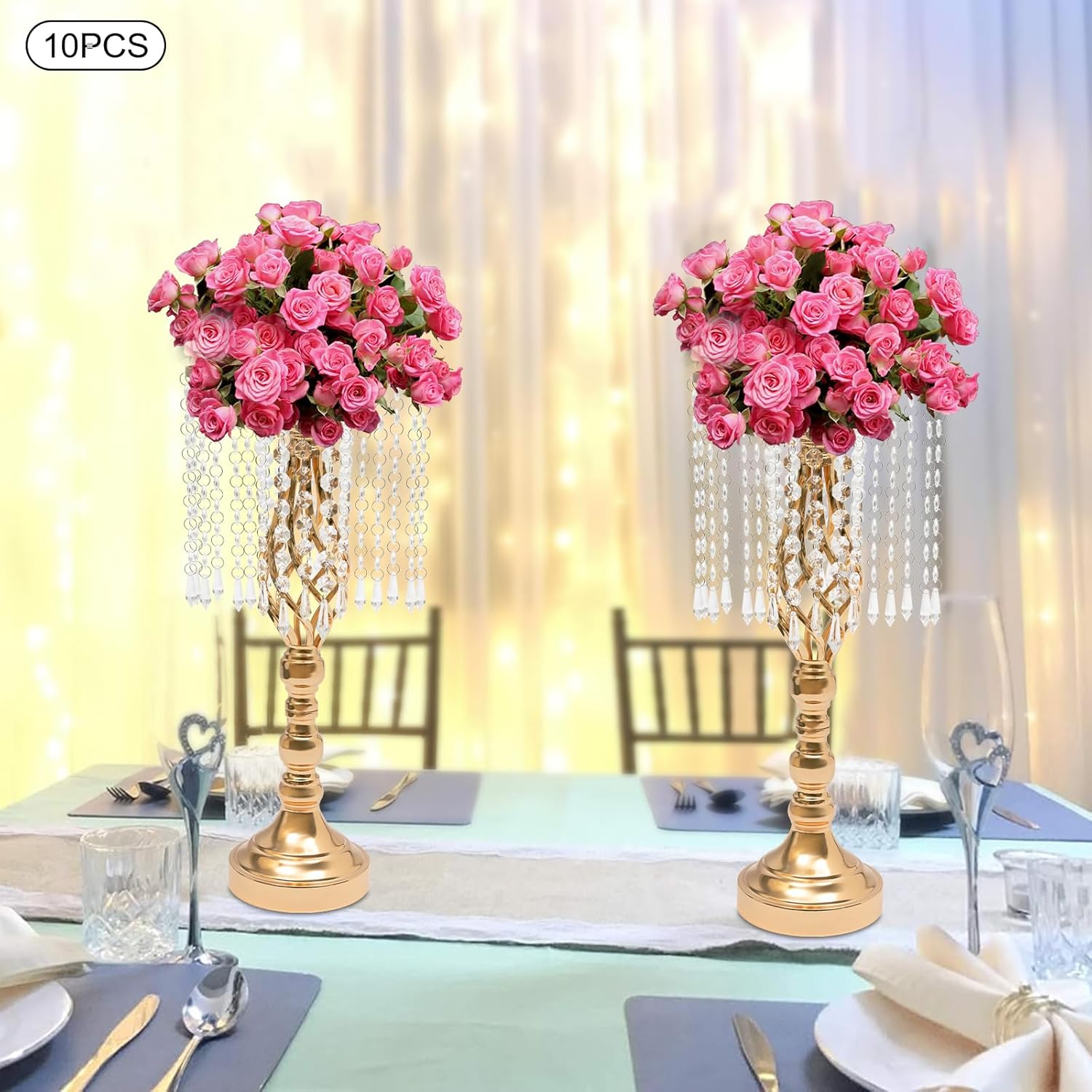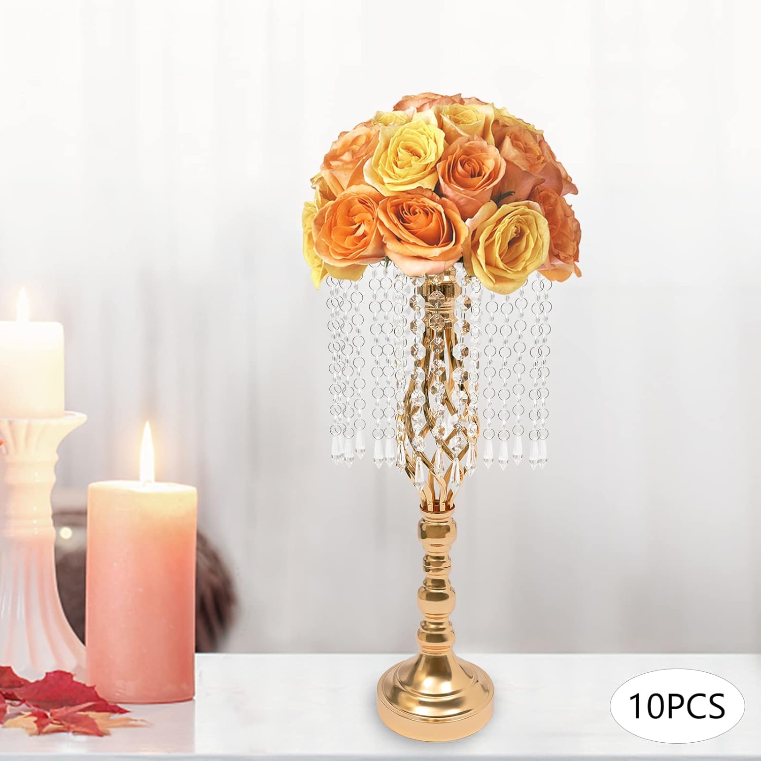 10 Pcs Crystal Flower Stands,Flower Holders,19.3 inches Tall Flower Vase with Chandelier for Wedding Party,Reception Dinner Event,Tabletop Decorations (6 Pcs Gold, 21.7 in)