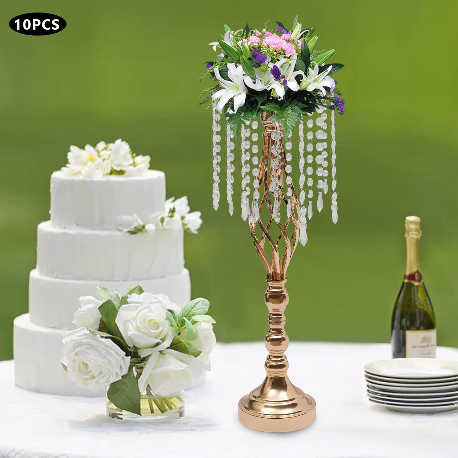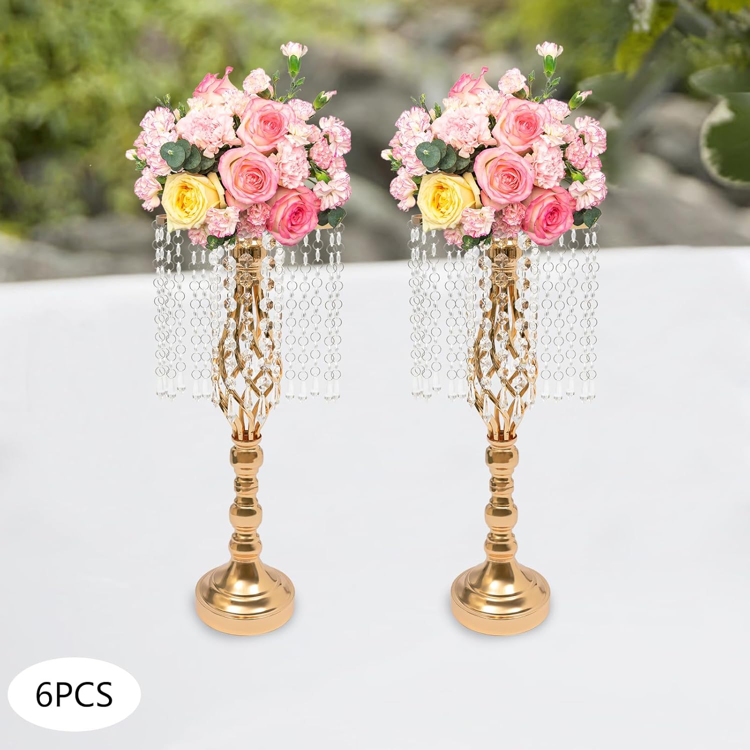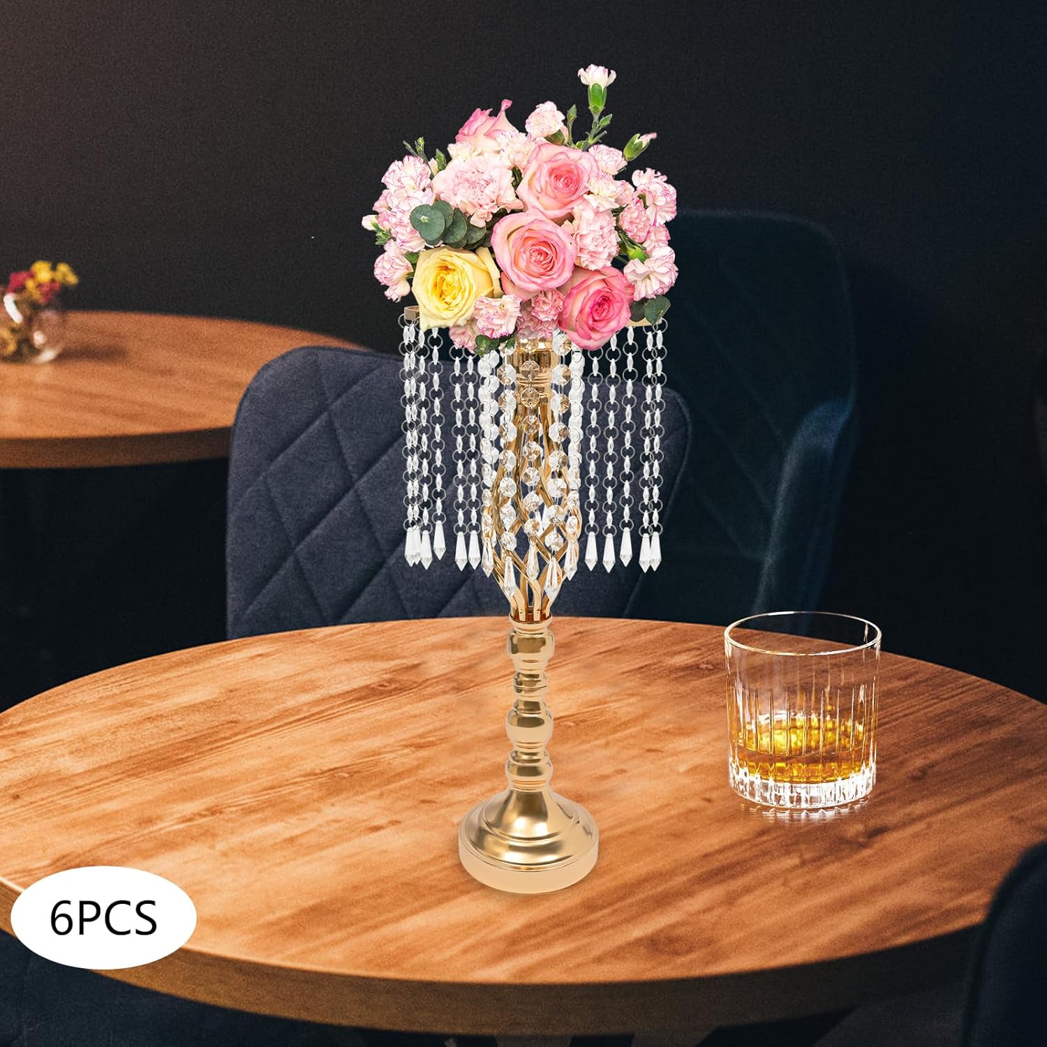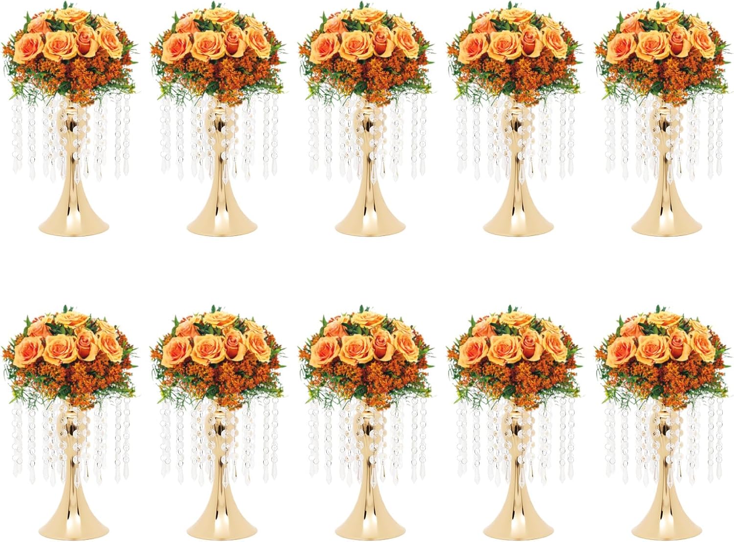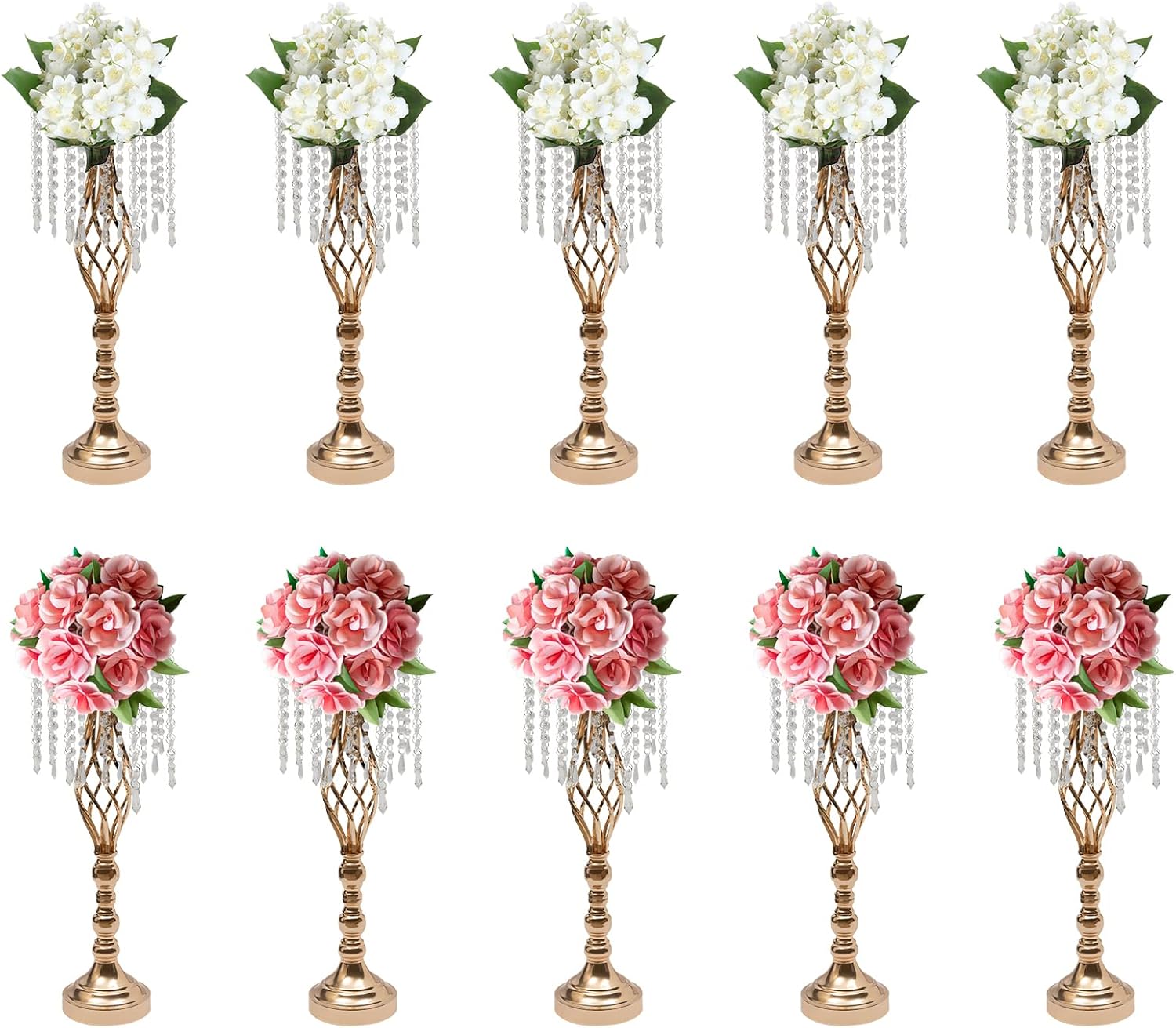 10 Pcs Crystal Flower Stands,Flower Holders,19.3 inches Tall Flower Vase with Chandelier for Wedding Party,Reception Dinner Event,Tabletop Decorations (6 Pcs Gold, 21.7 in)