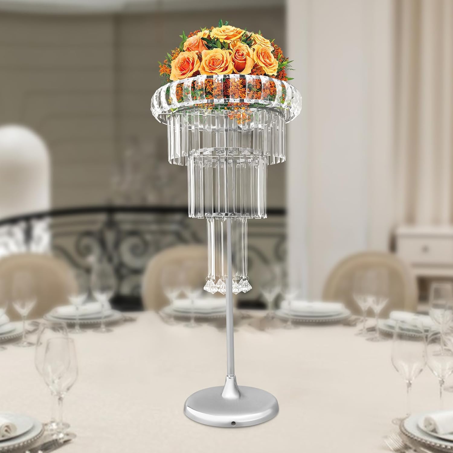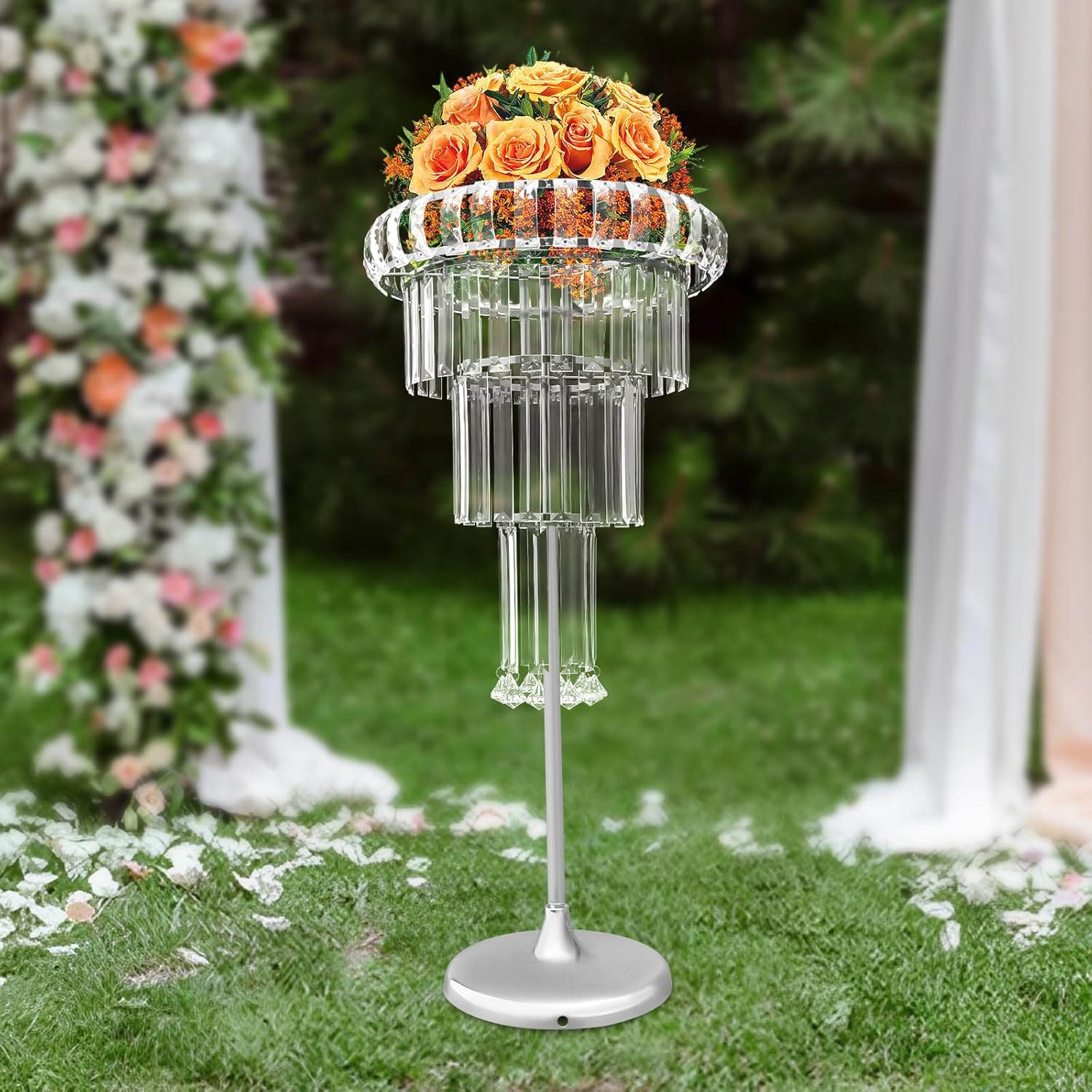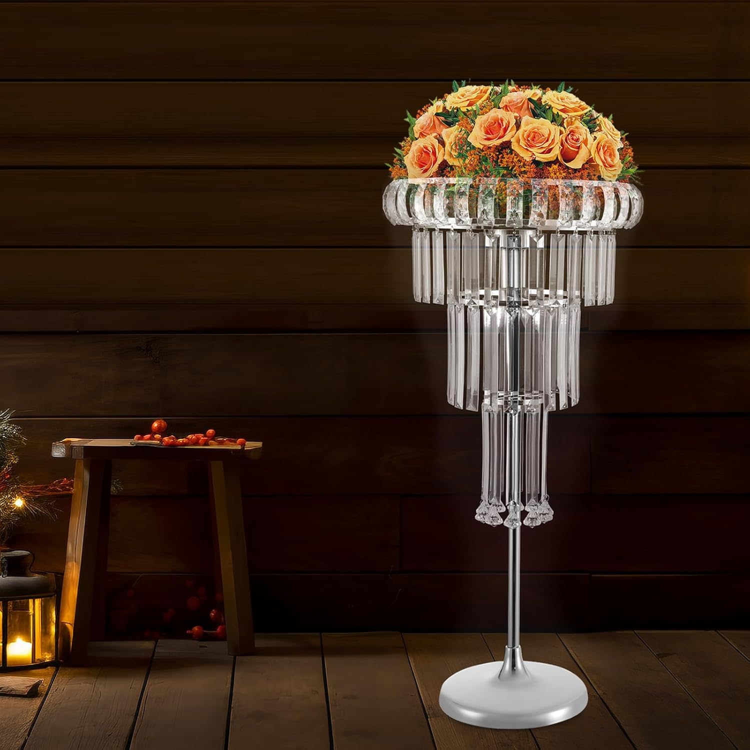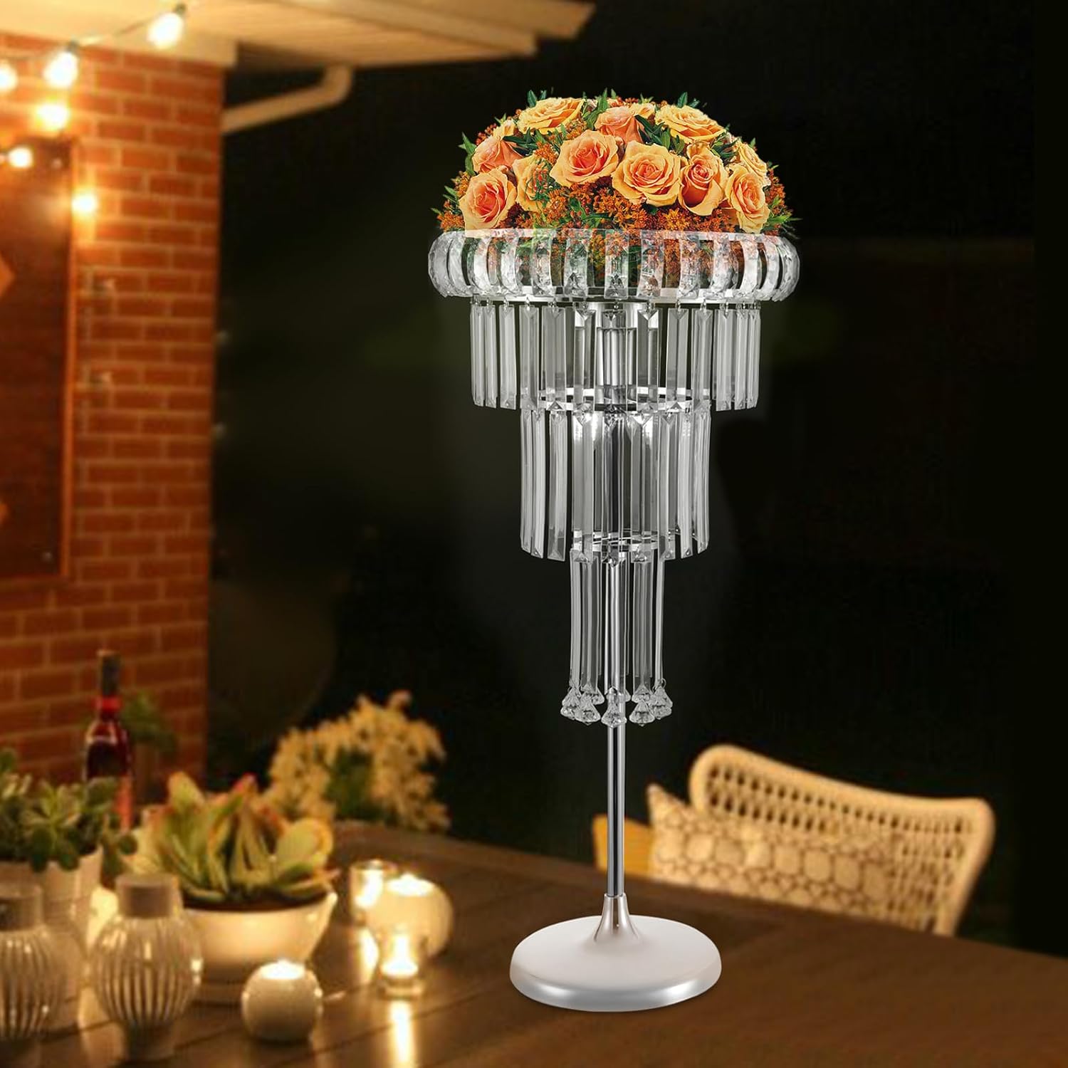 2PCS 4Tier Wedding Centerpieces Crystal Vases, 32.3in Acrylic Flower Stand with Hanging Crystals,Round Chandelier Pedestal Stand for Party Table Decoration Lawn Hotel (Silver,w/Lamp)