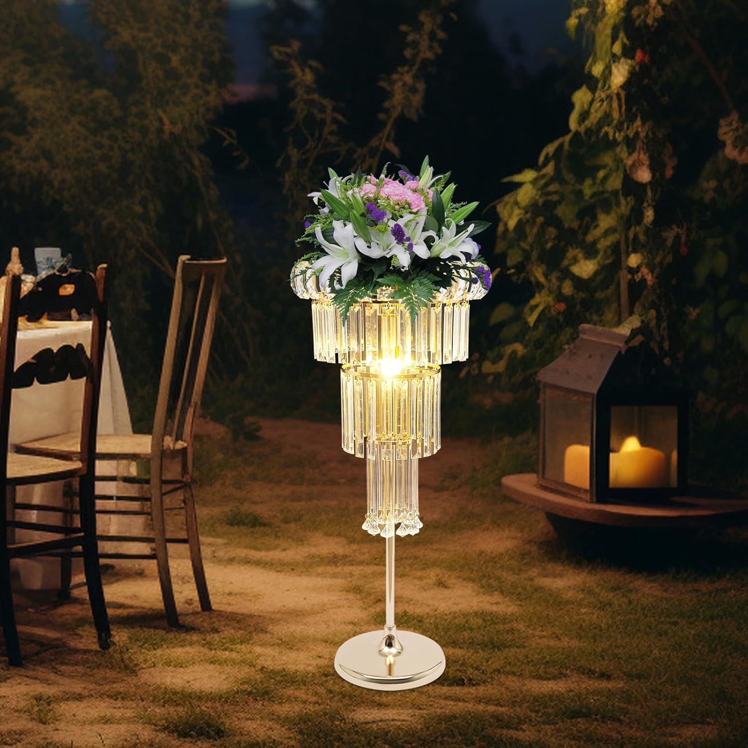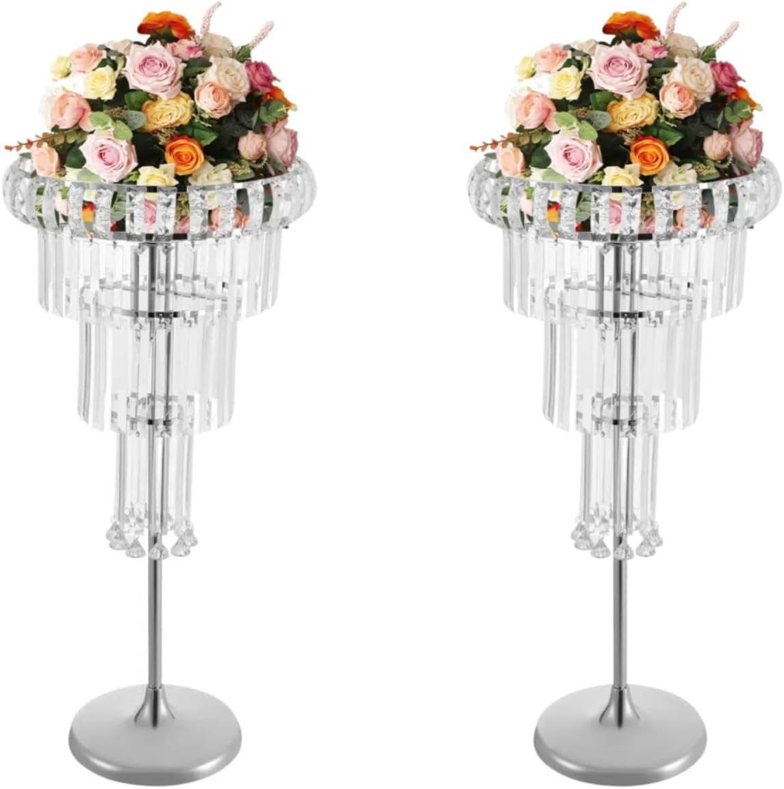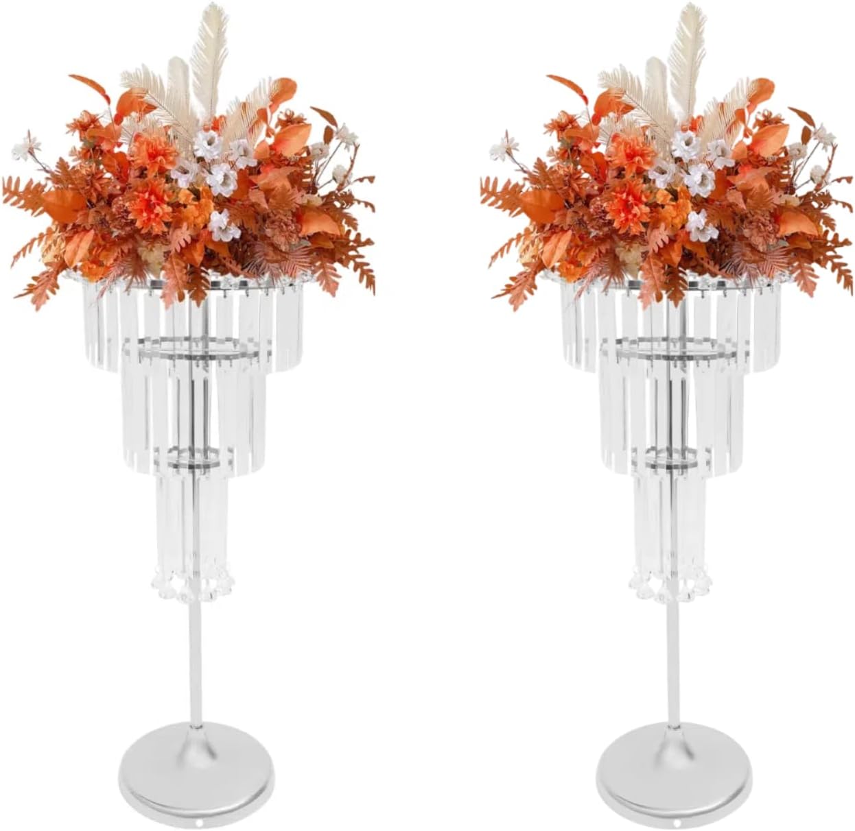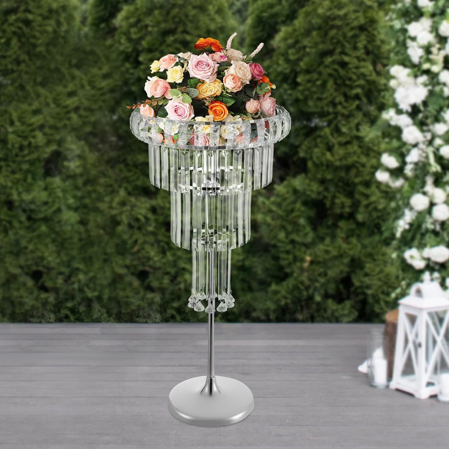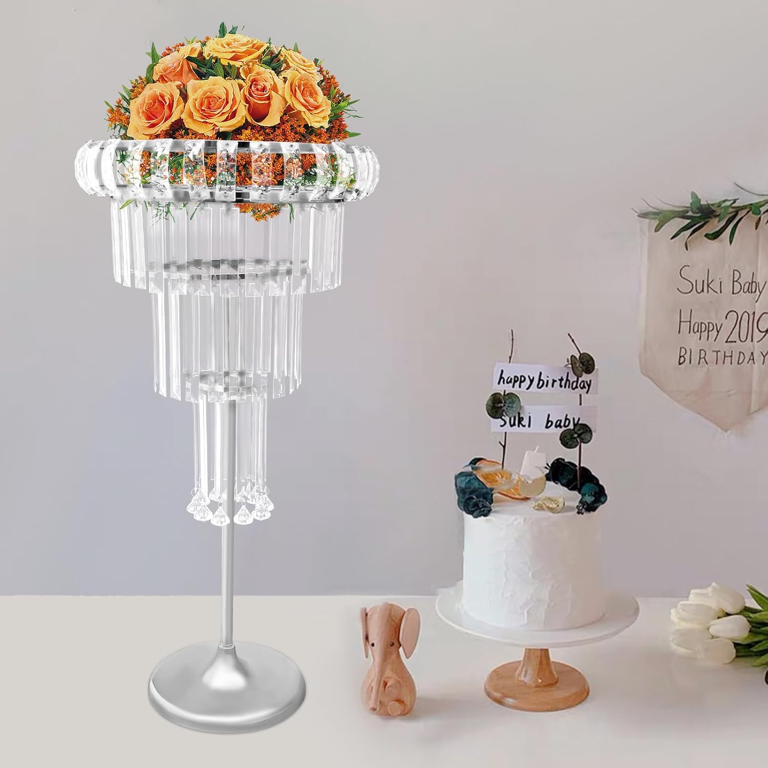 2PCS 4Tier Wedding Centerpieces Crystal Vases, 32.3in Acrylic Flower Stand with Hanging Crystals,Round Chandelier Pedestal Stand for Party Table Decoration Lawn Hotel (Silver,w/Lamp)