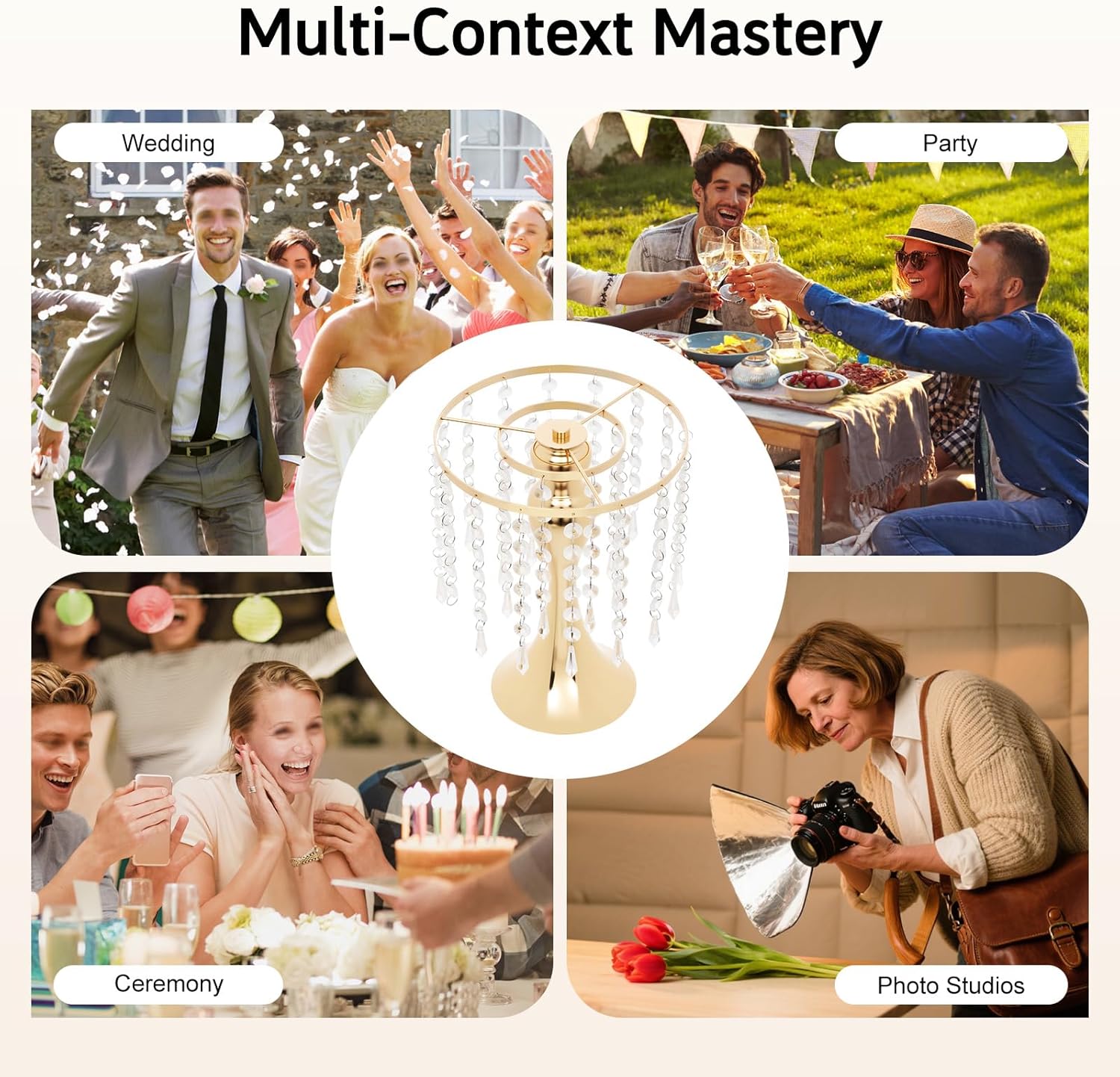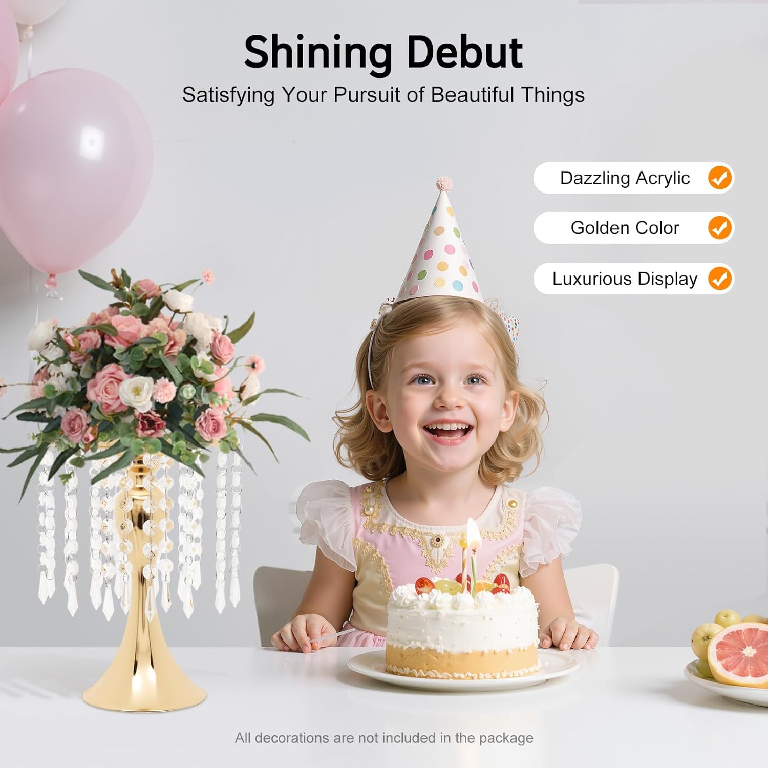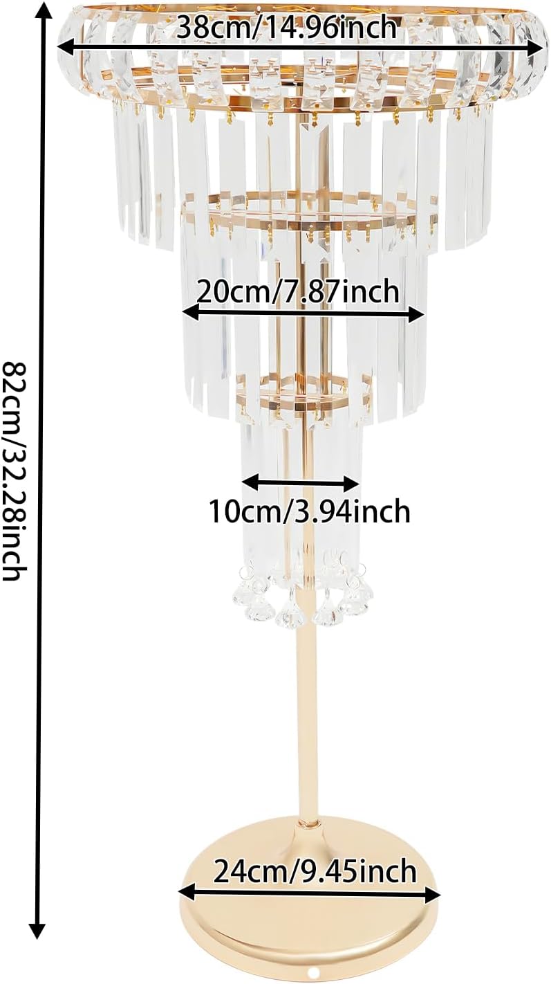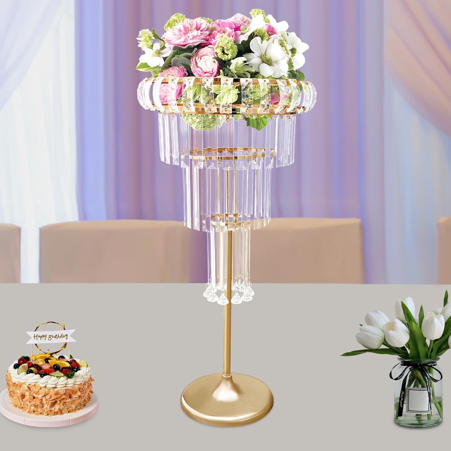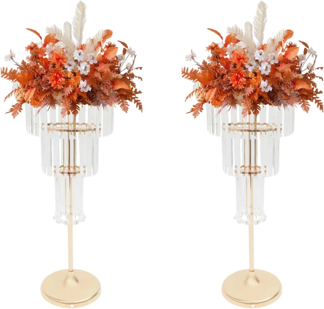 2PCS 4Tier Wedding Centerpieces Crystal Vases, 32.3in Acrylic Flower Stand with Hanging Crystals,Round Chandelier Pedestal Stand for Party Table Decoration Lawn Hotel (Gold,w/Lamp)
