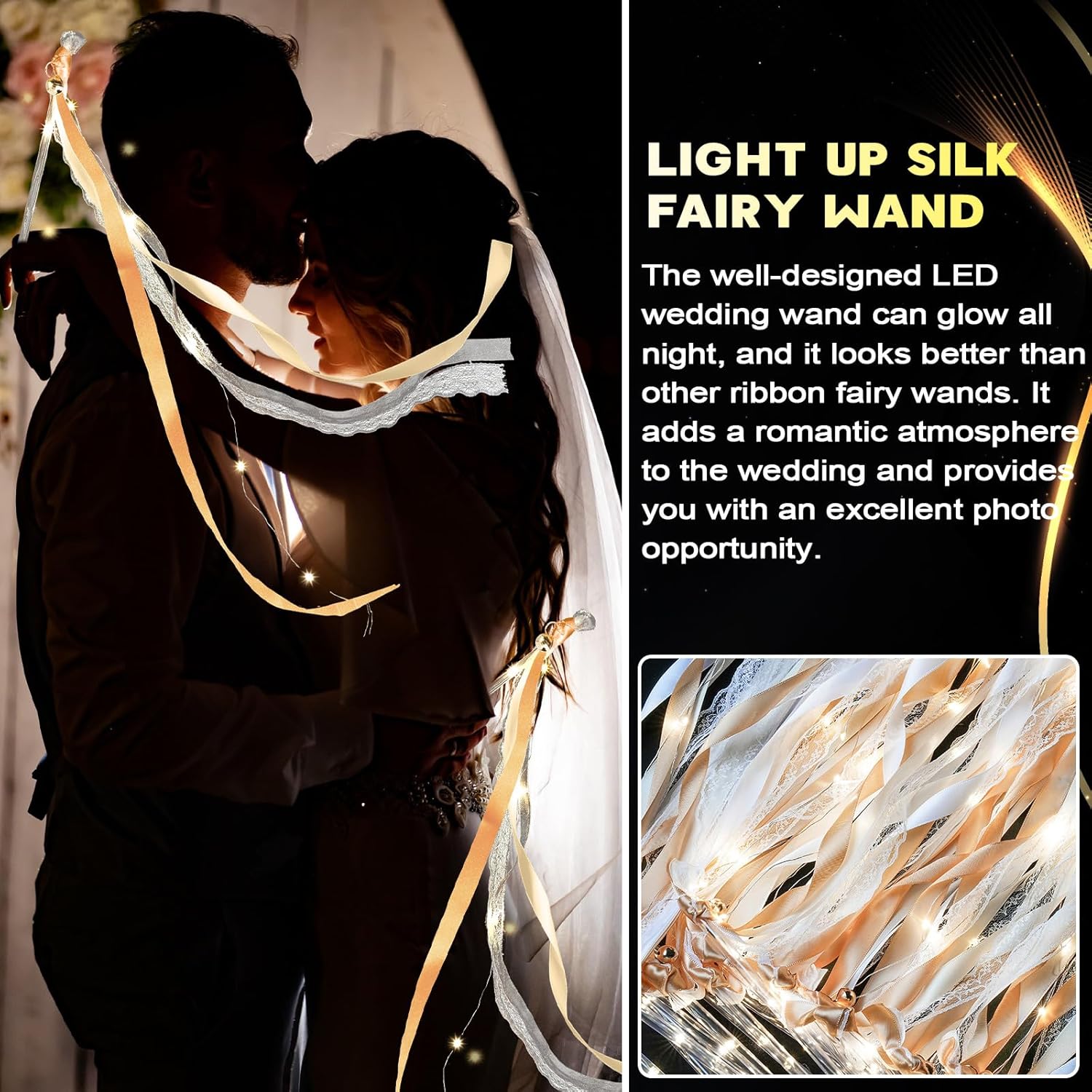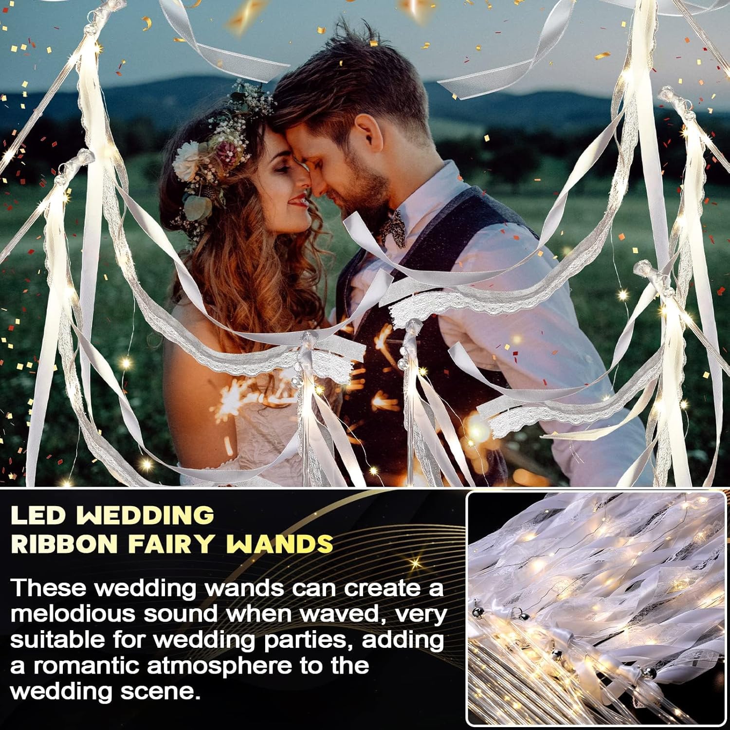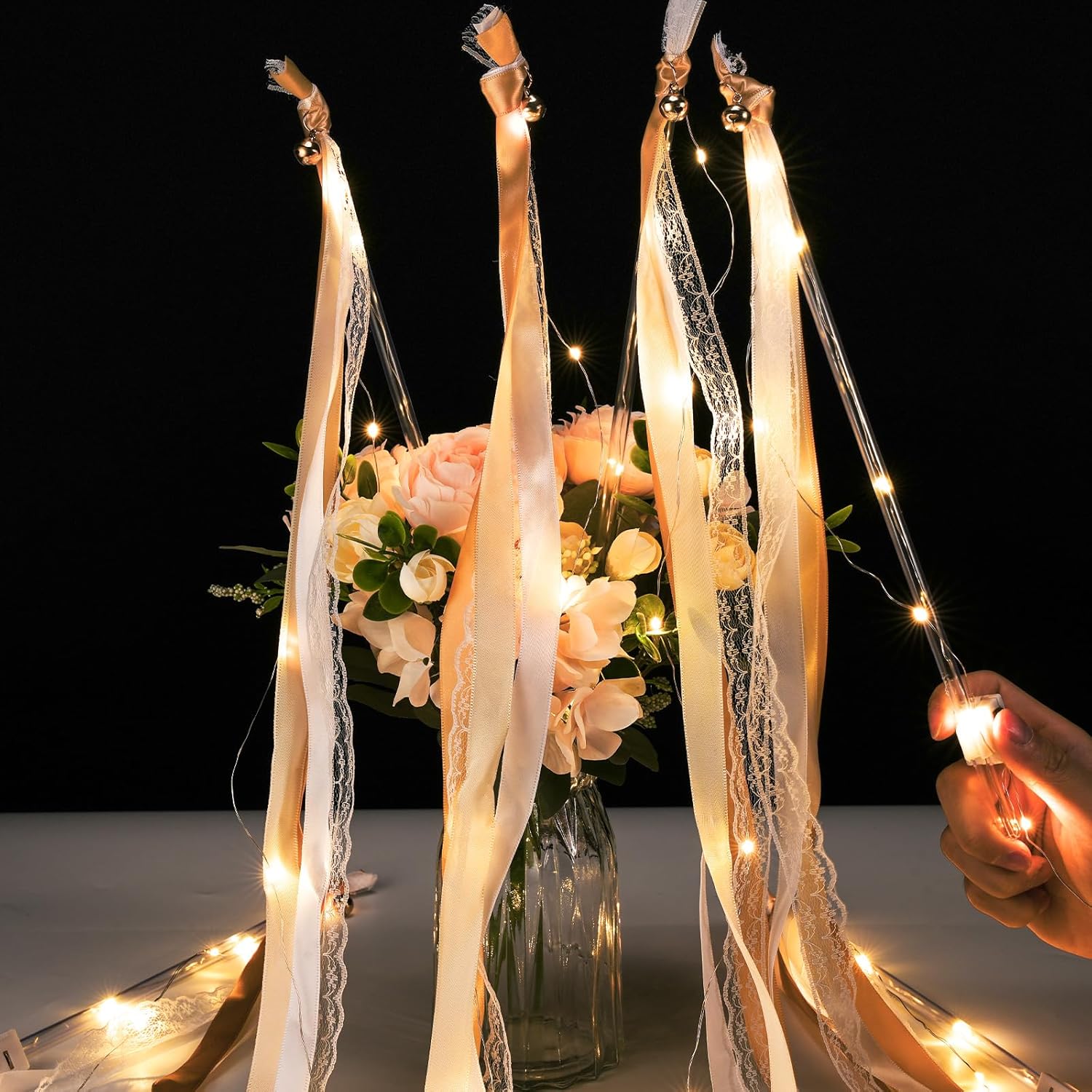 Unittype Wedding Wands Ribbon Streamers with Bells LED Fairy Light up Silk Fairy Wand Glow in the Dark Flashing Lace Stick for Wedding Birthday Party Favors (Ivory & Warm White LED,100 Pieces)