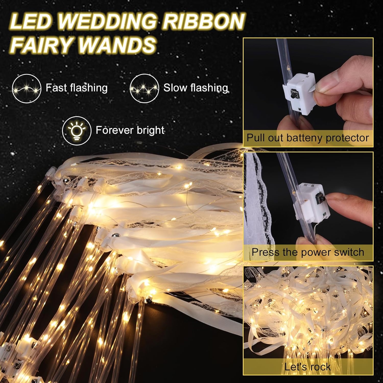 120 Pieces Wedding Wands with LED Multi Mode Light up Wands Silk Fairy Glow Ribbon Streamers with Bells for Wedding New Year Graduation Concert Raves Birthday (120 PCS)