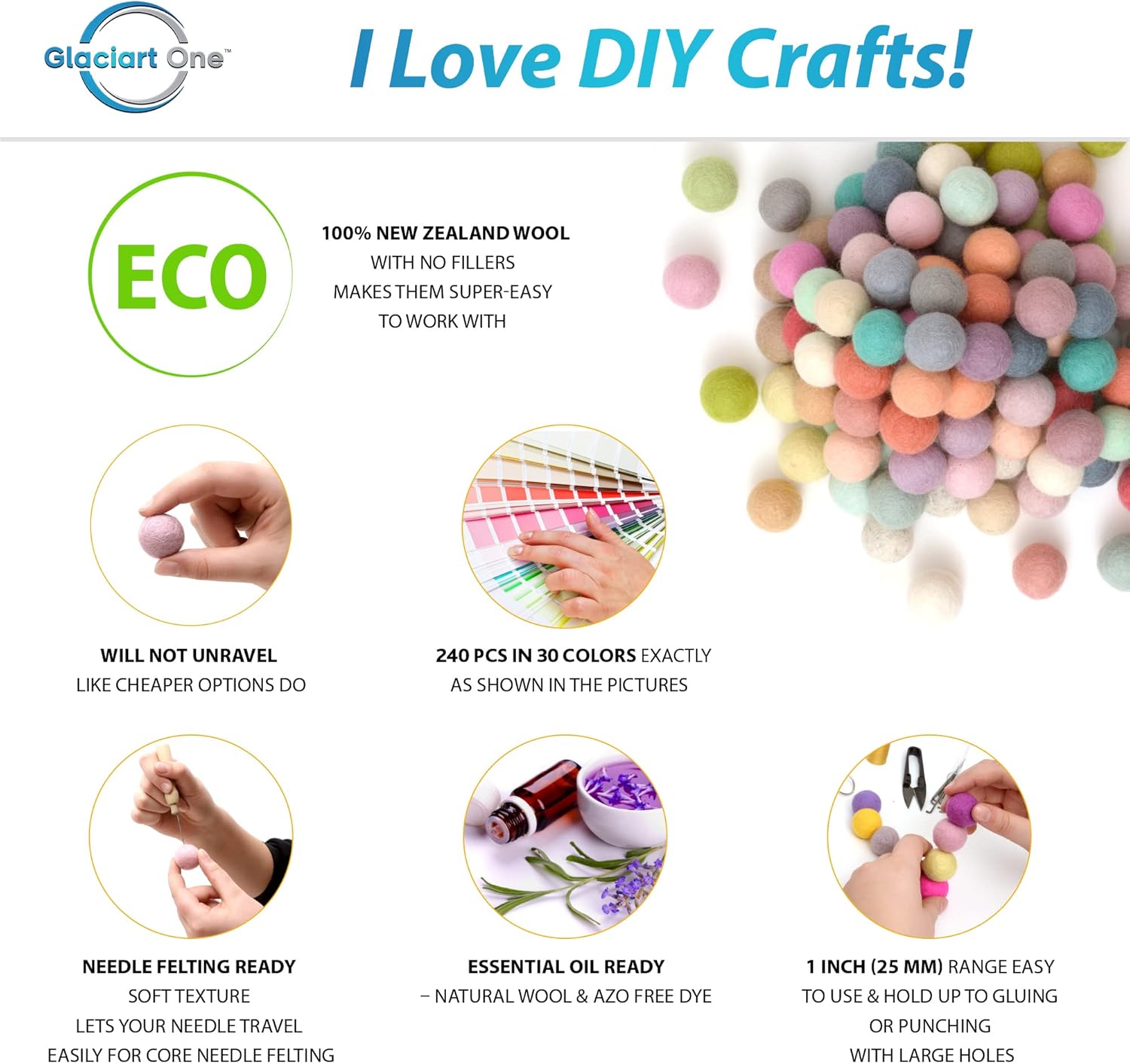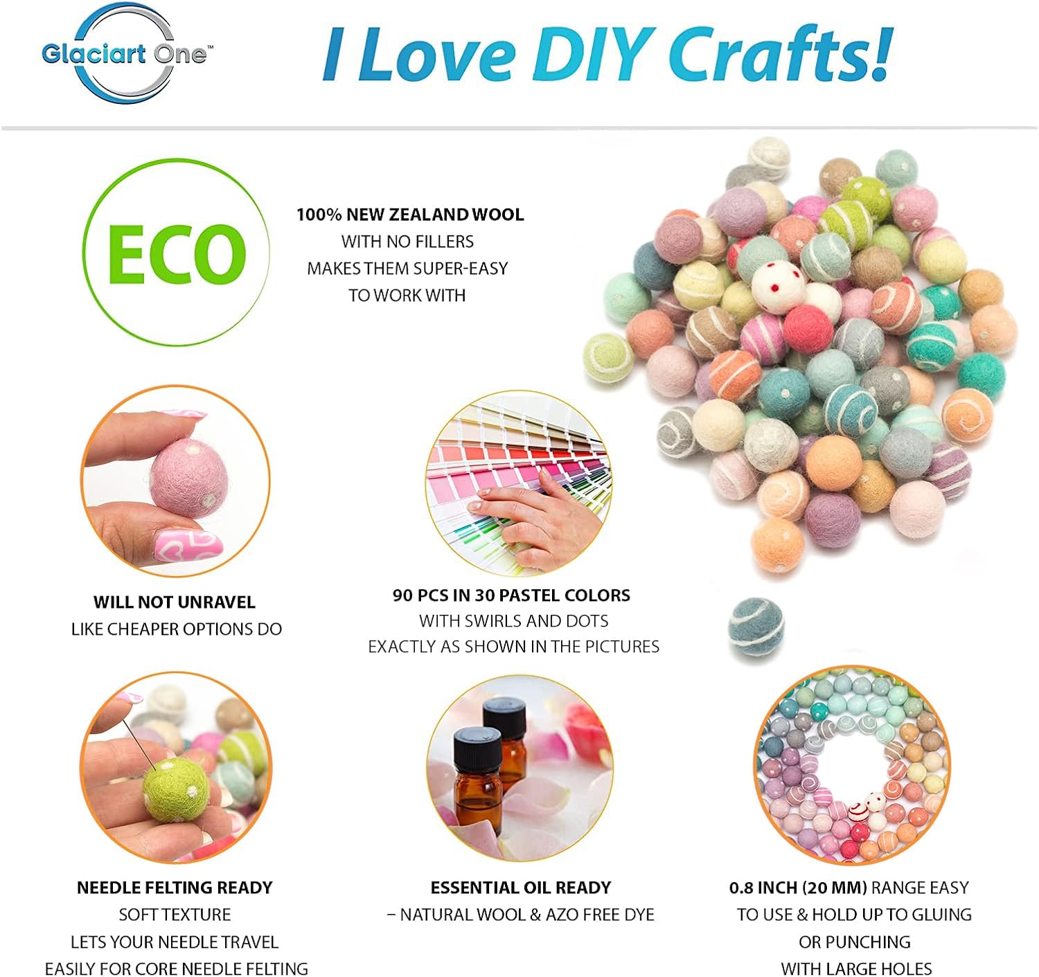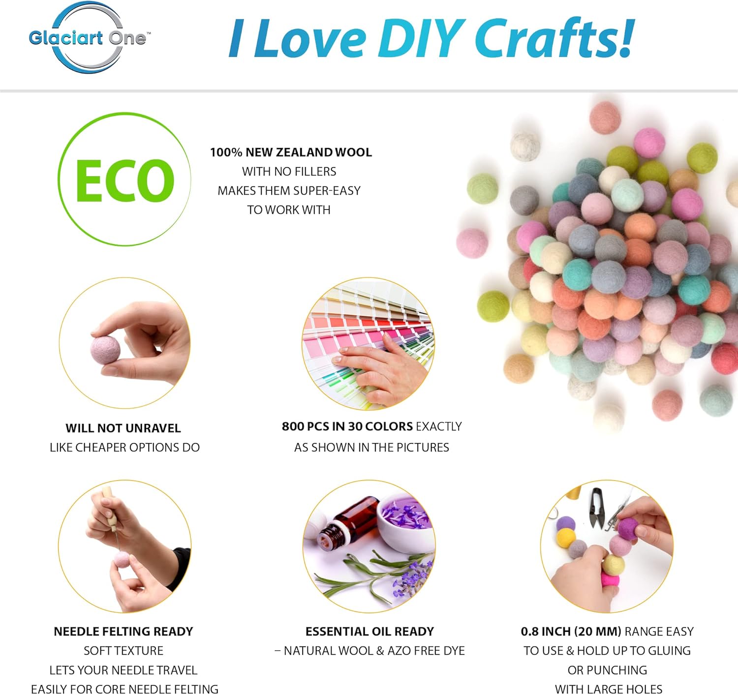Glaciart One Felt Pom Poms, Wool Felt Balls (800 Pieces) 2 cm – 0.8 Inch, Handmade Felted 30 Pastel Colors (Green, Pink, Blue, Yellow and More) Bulk Small Puff for Felting and Garland
