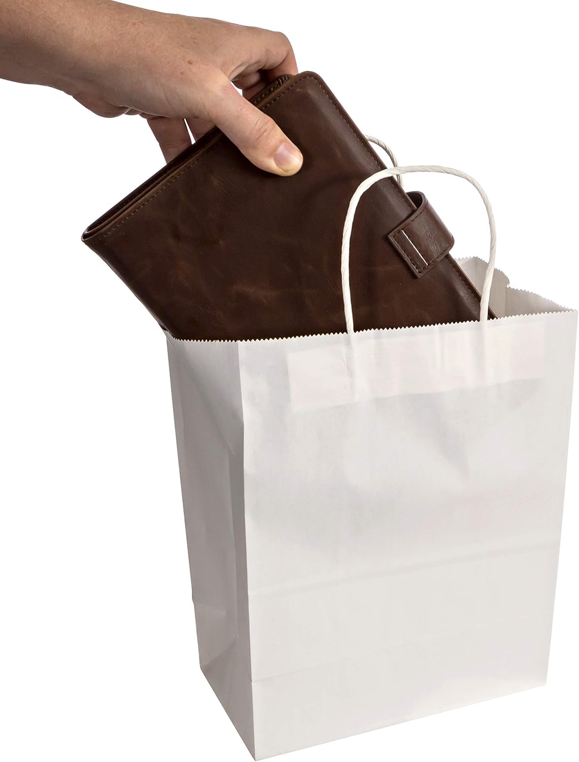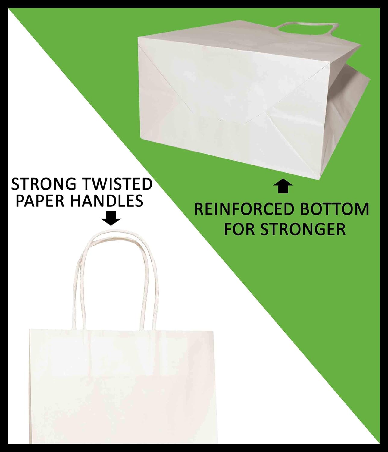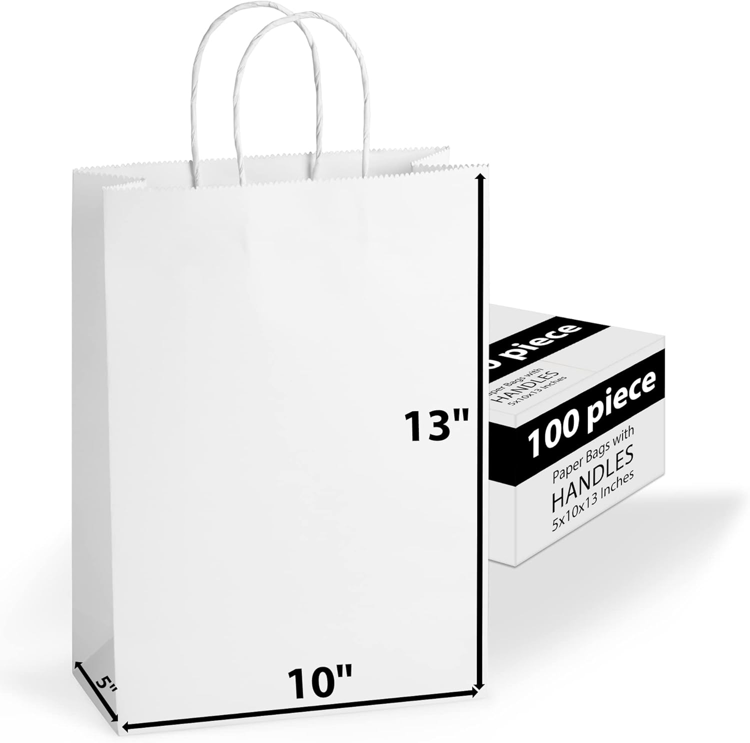 White Kraft Paper Gift Bags with Handles Bulk 200 Bags [ 2 box of 100] 10 X 5 X 13 Ideal for Shopping, Packaging, Retail, Party, Craft, Gifts, Wedding, Recycled, Business, Goody and Merchandise Bag