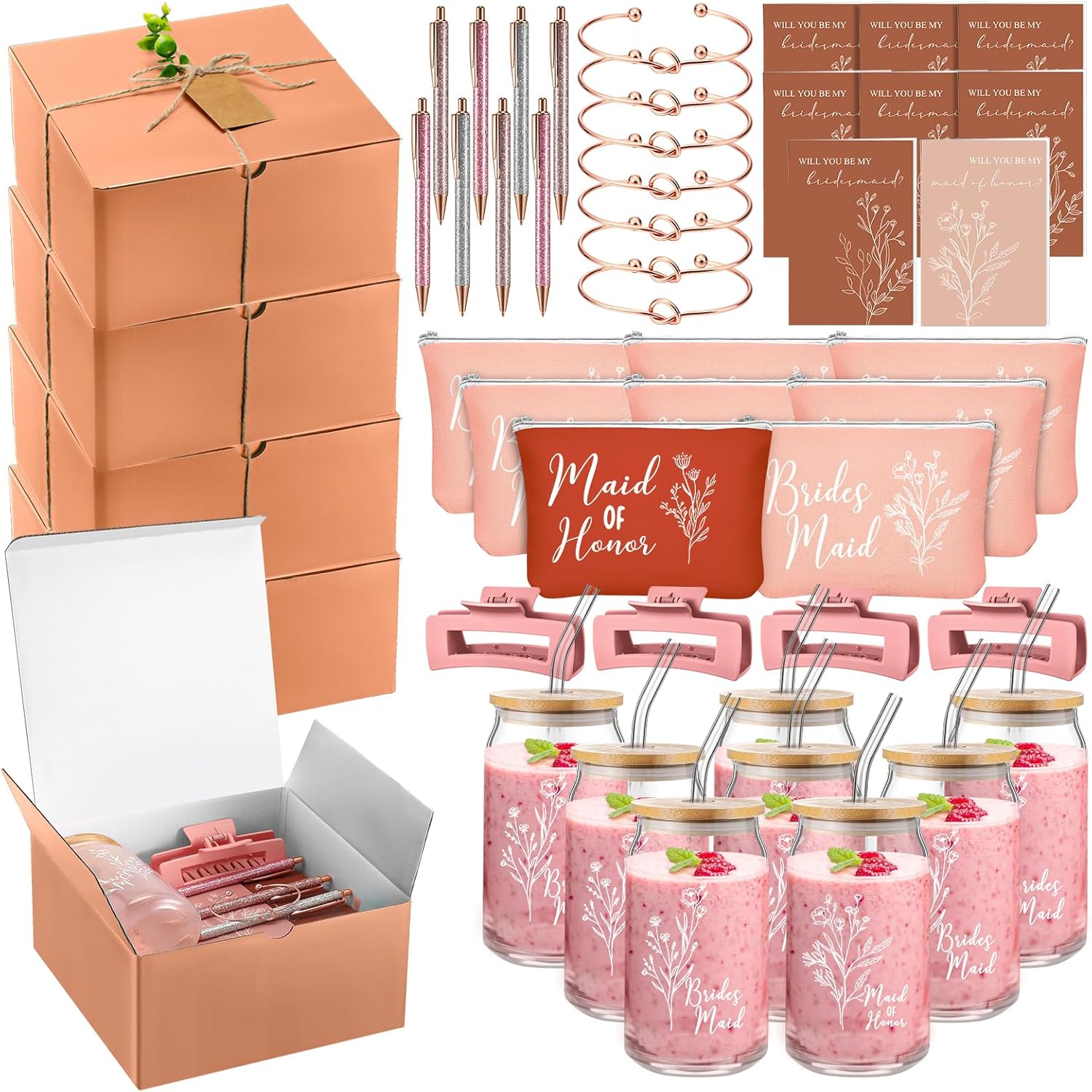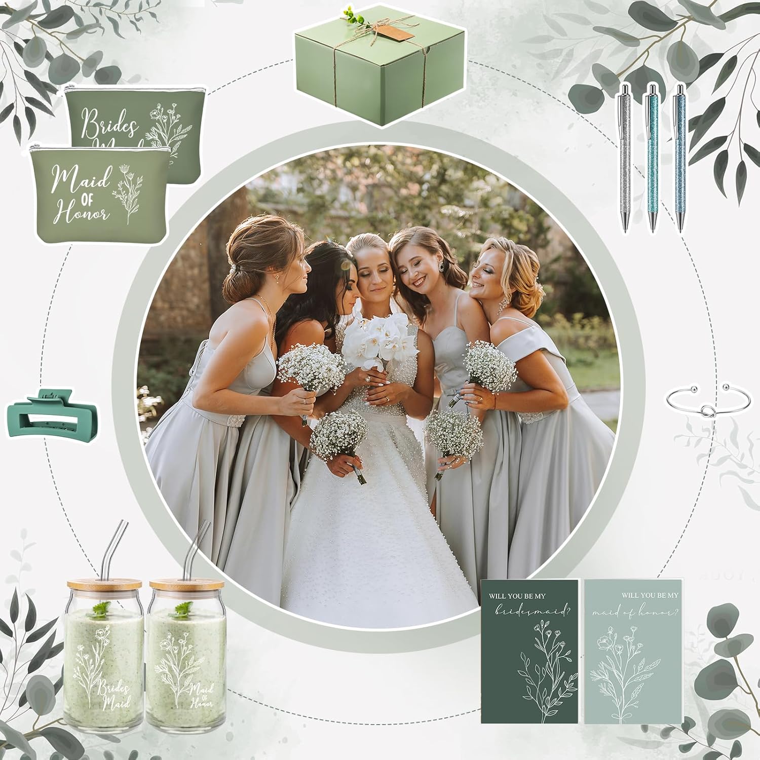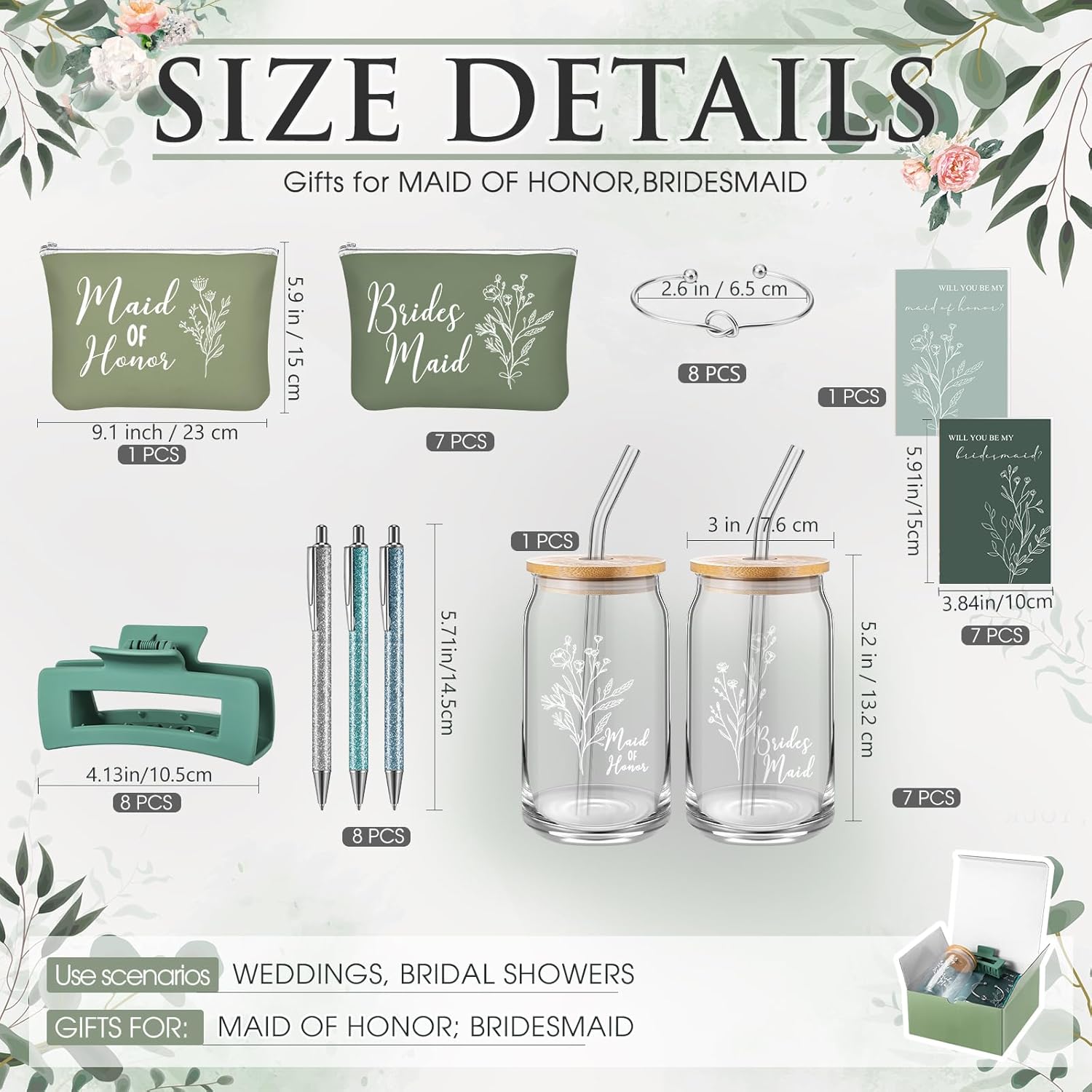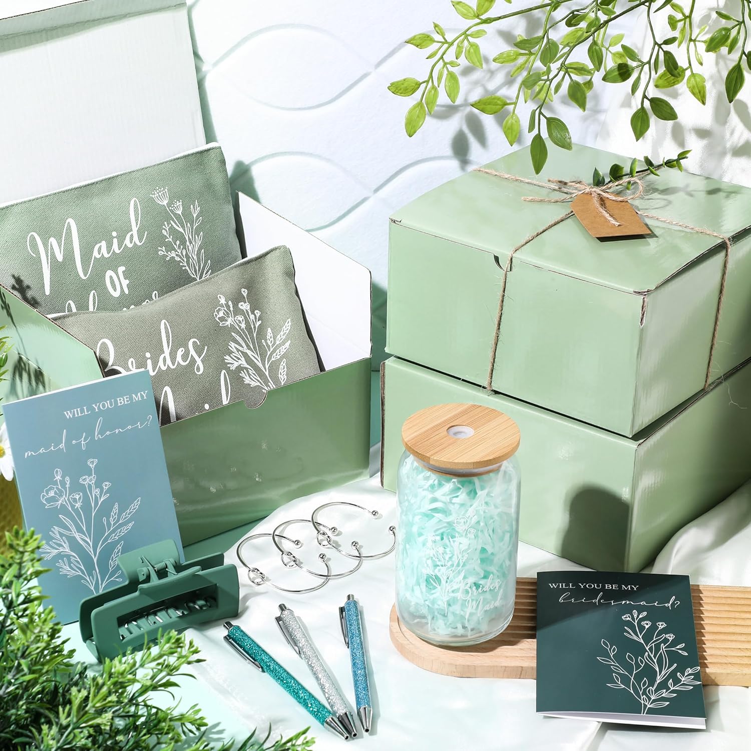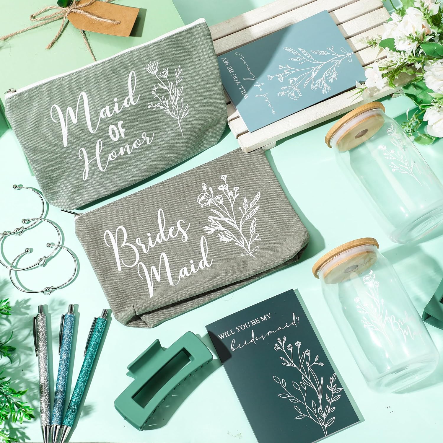 8 Sets/ 80 Pcs Bridesmaid Proposal Gifts Maid of Honor Gifts for Wedding, Include Glass Cup Makeup Bag Glitter Pen Card Bracelet Hair Clip Gift Box Kraft Tags Grass Twine(Green)