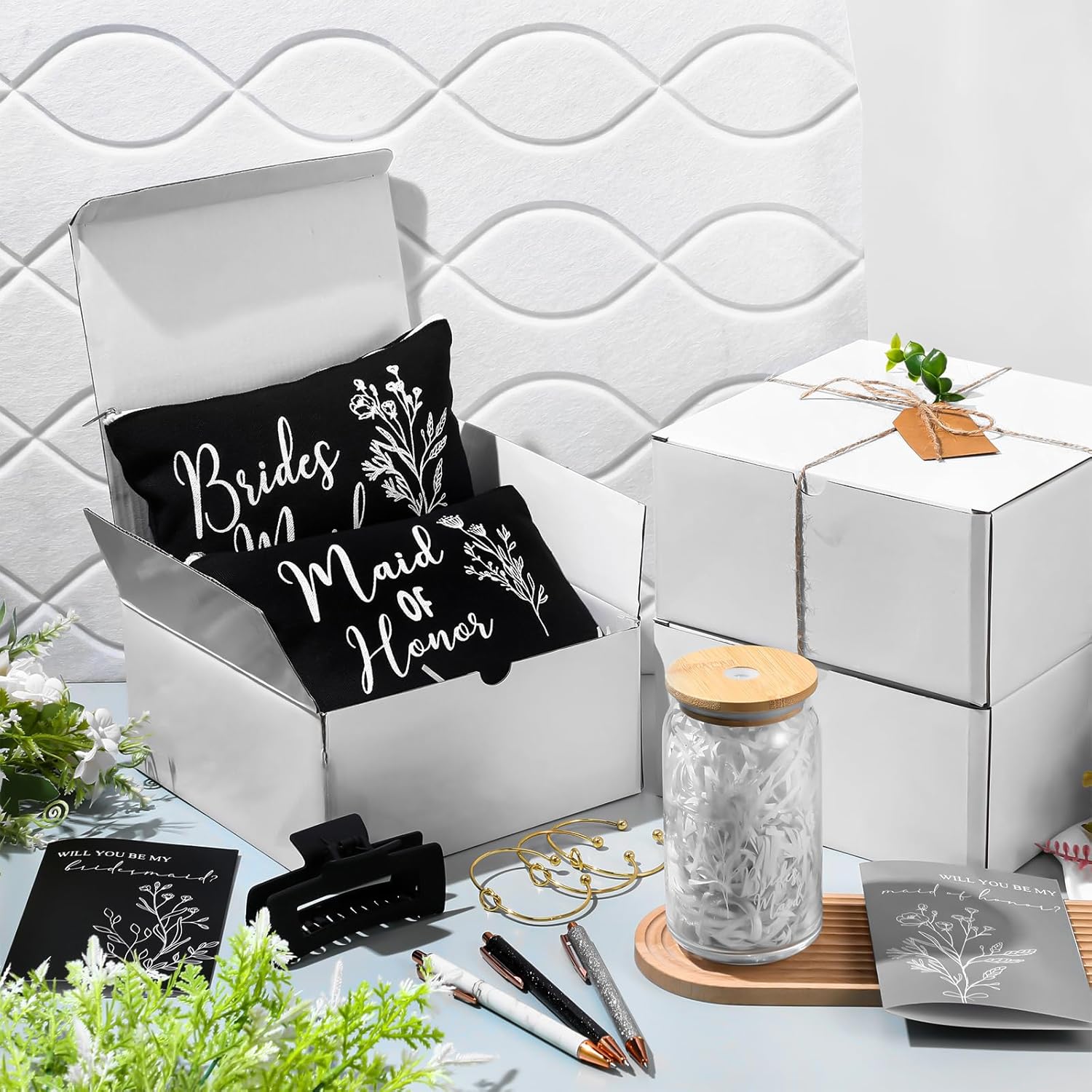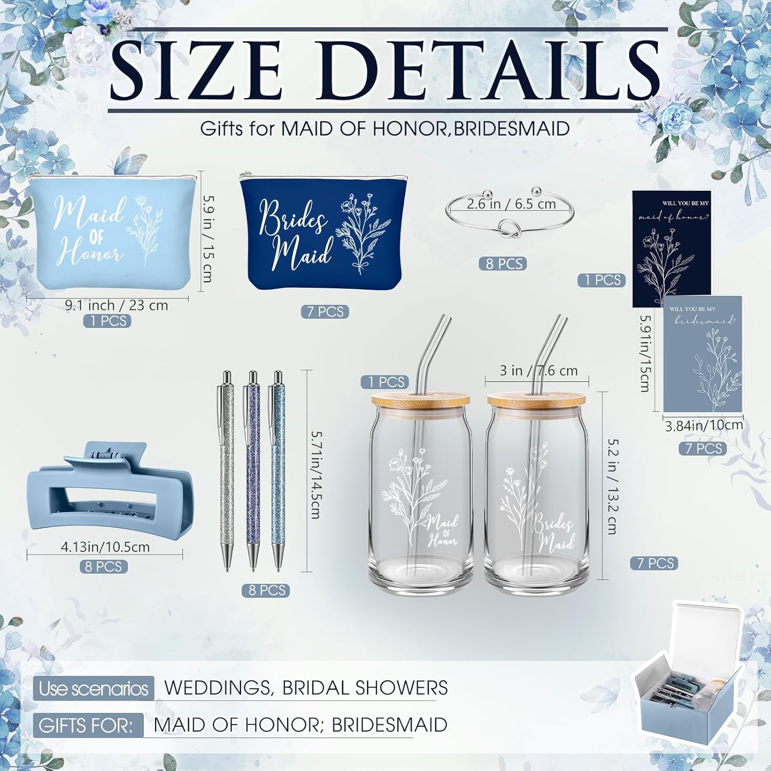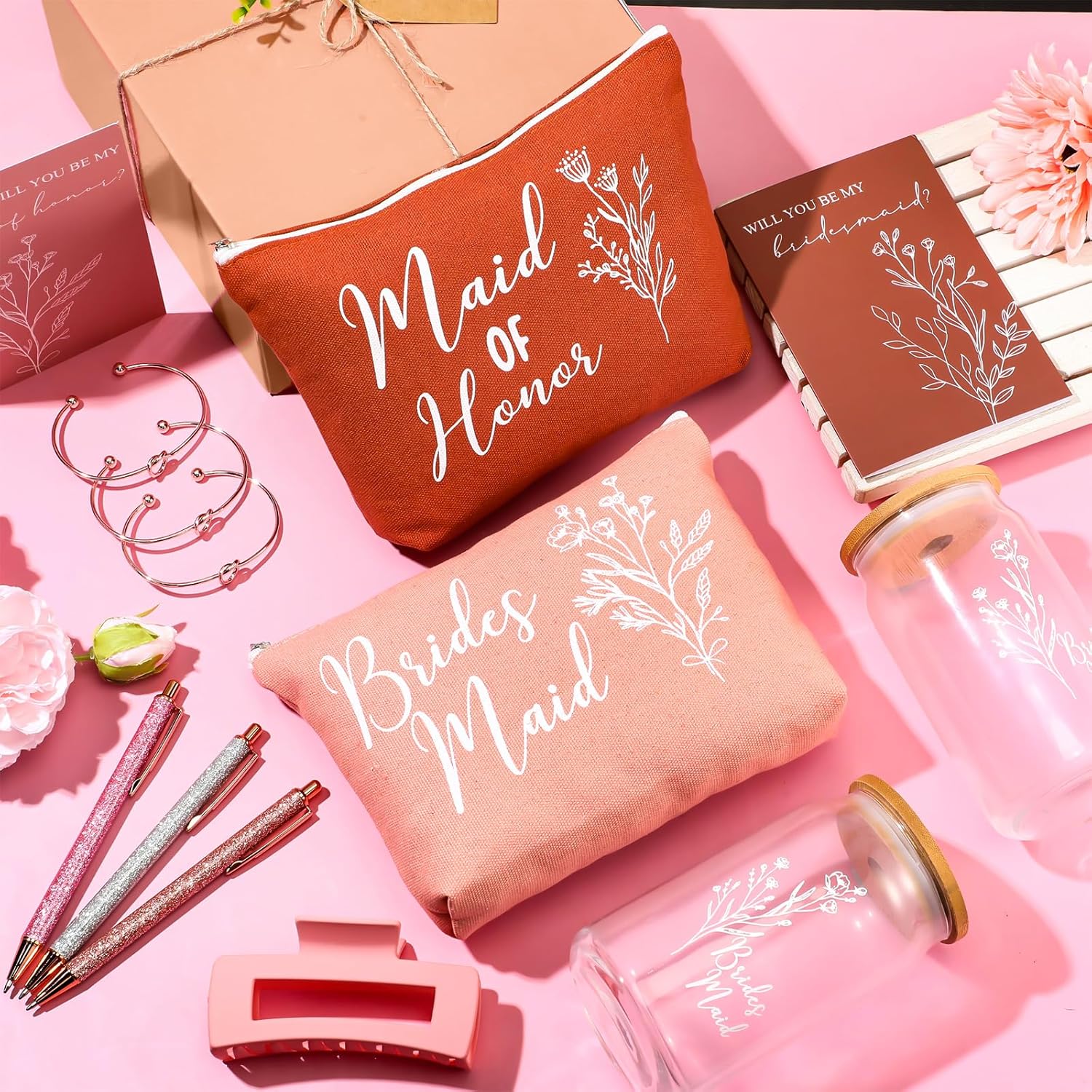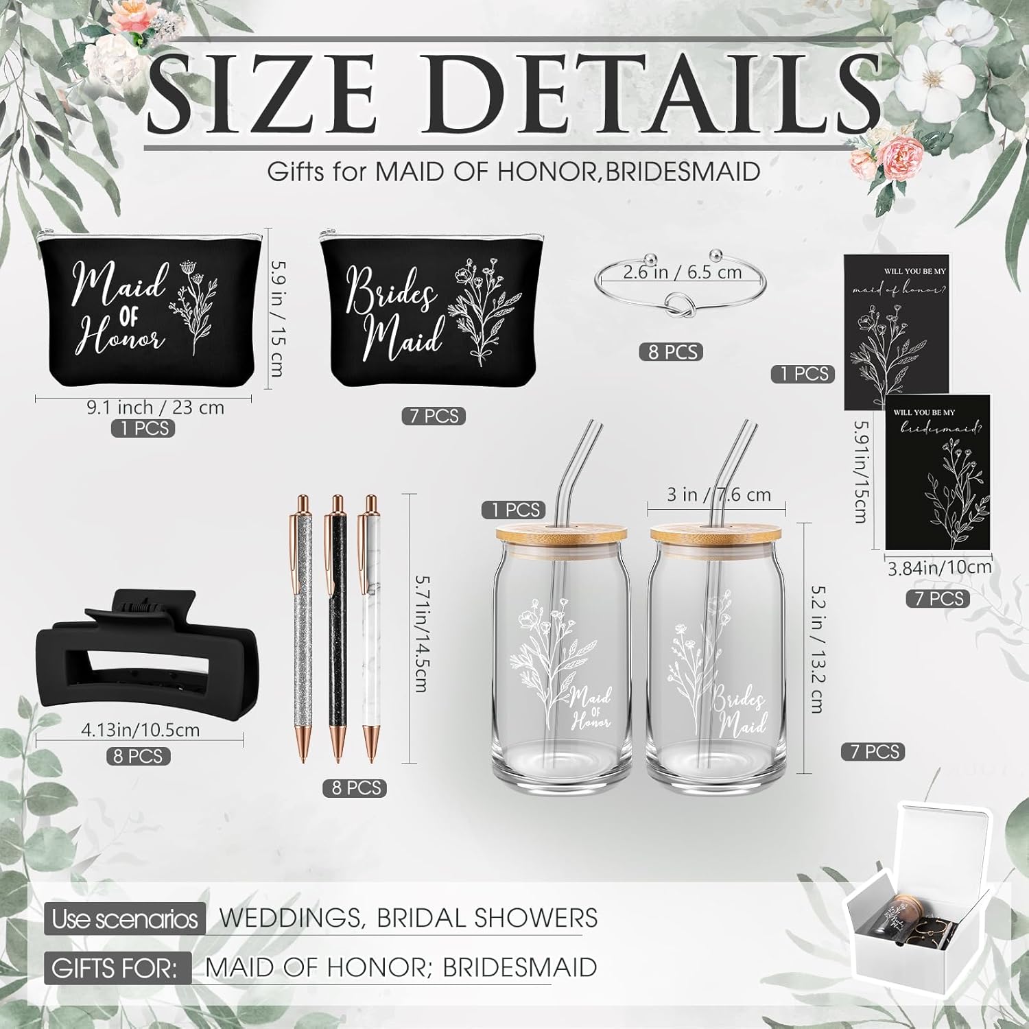 8 Sets/ 80 Pcs Bridesmaid Proposal Gifts Maid of Honor Gifts for Wedding, Include Glass Cup Makeup Bag Glitter Pen Card Bracelet Hair Clip Gift Box Kraft Tags Grass Twine(Green)