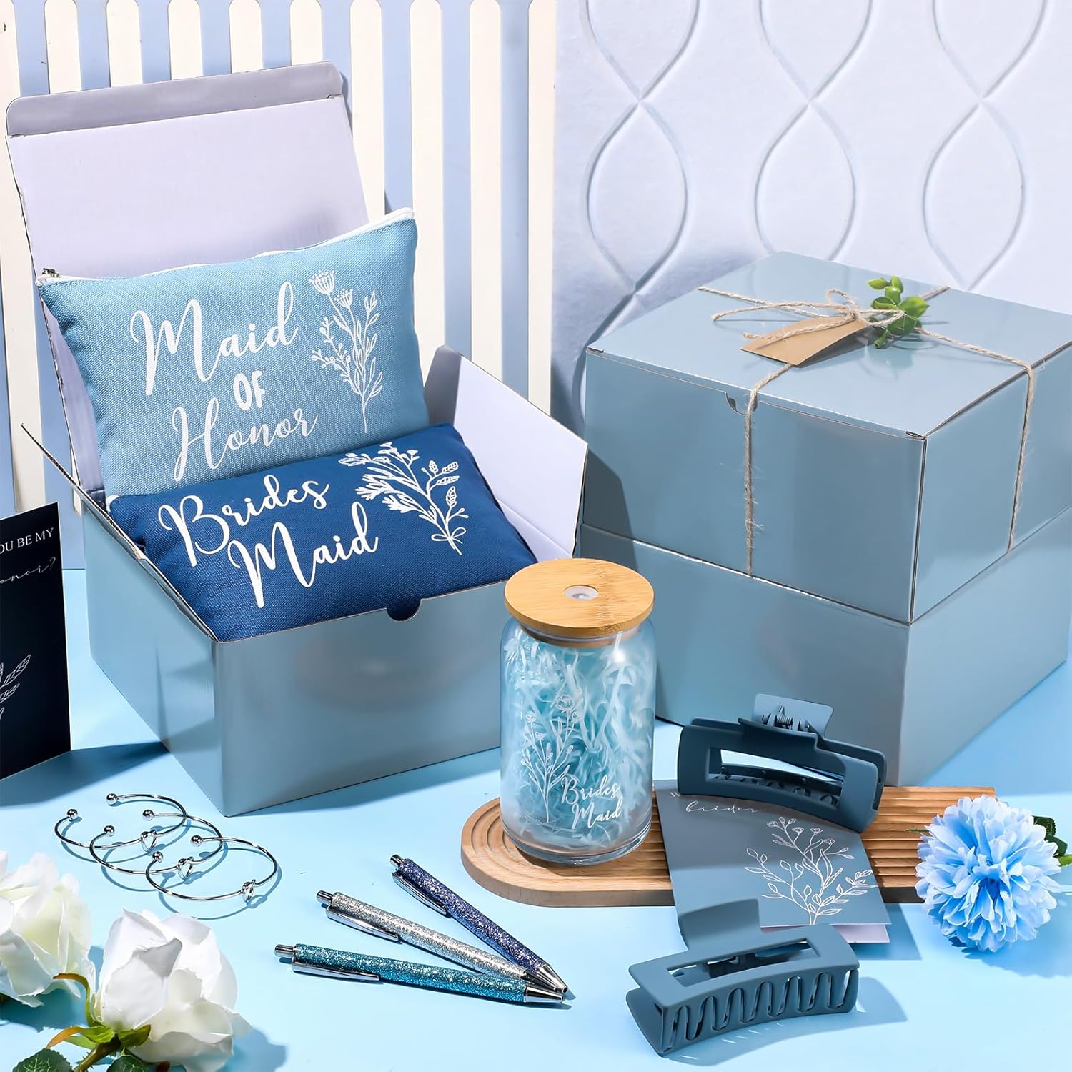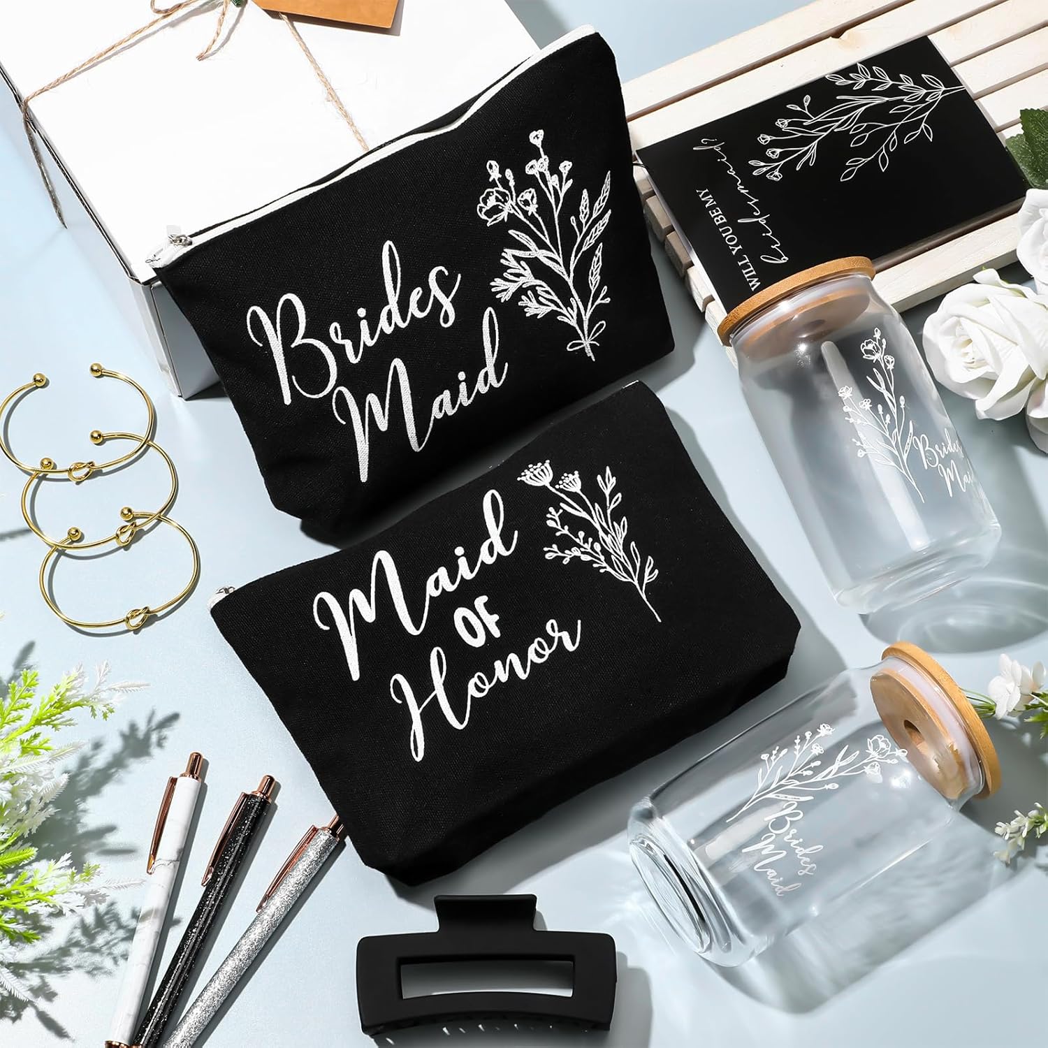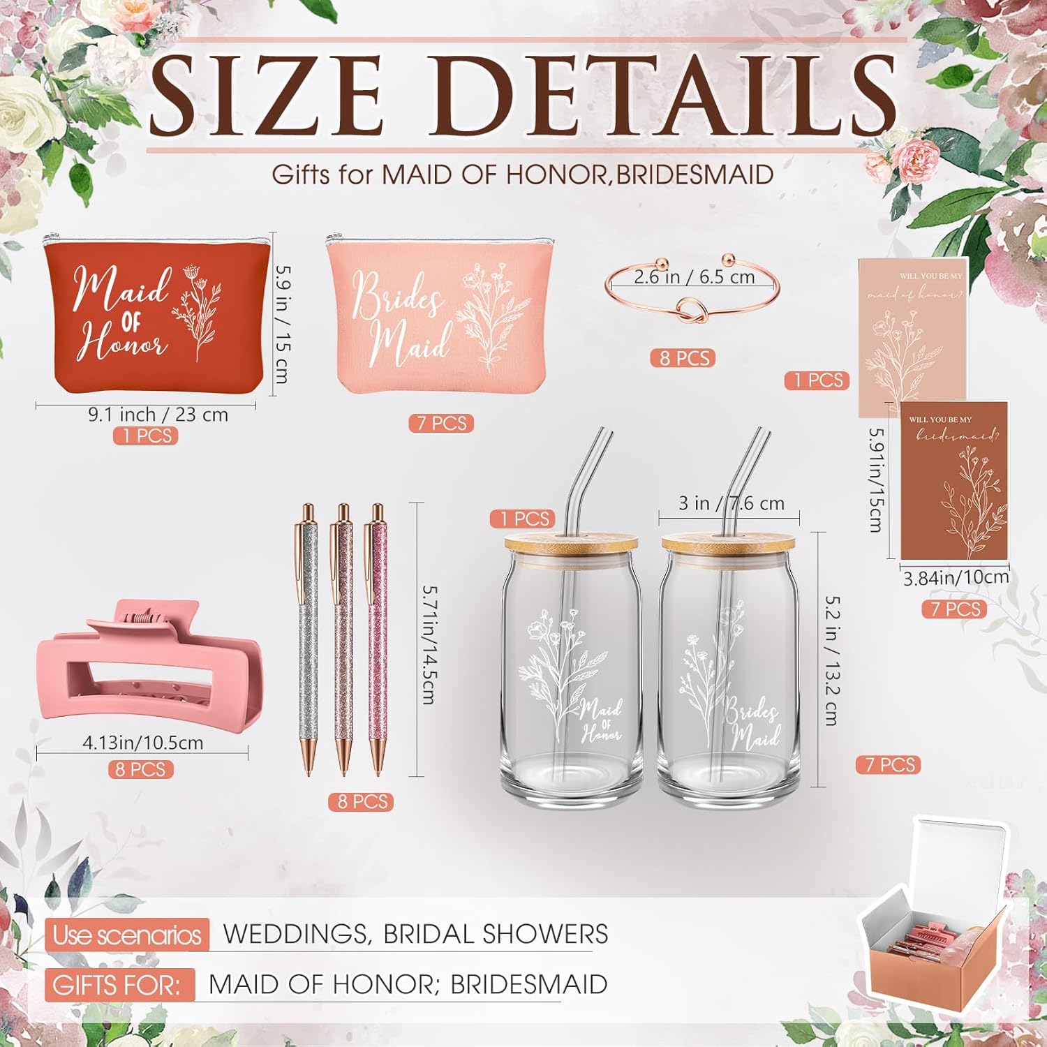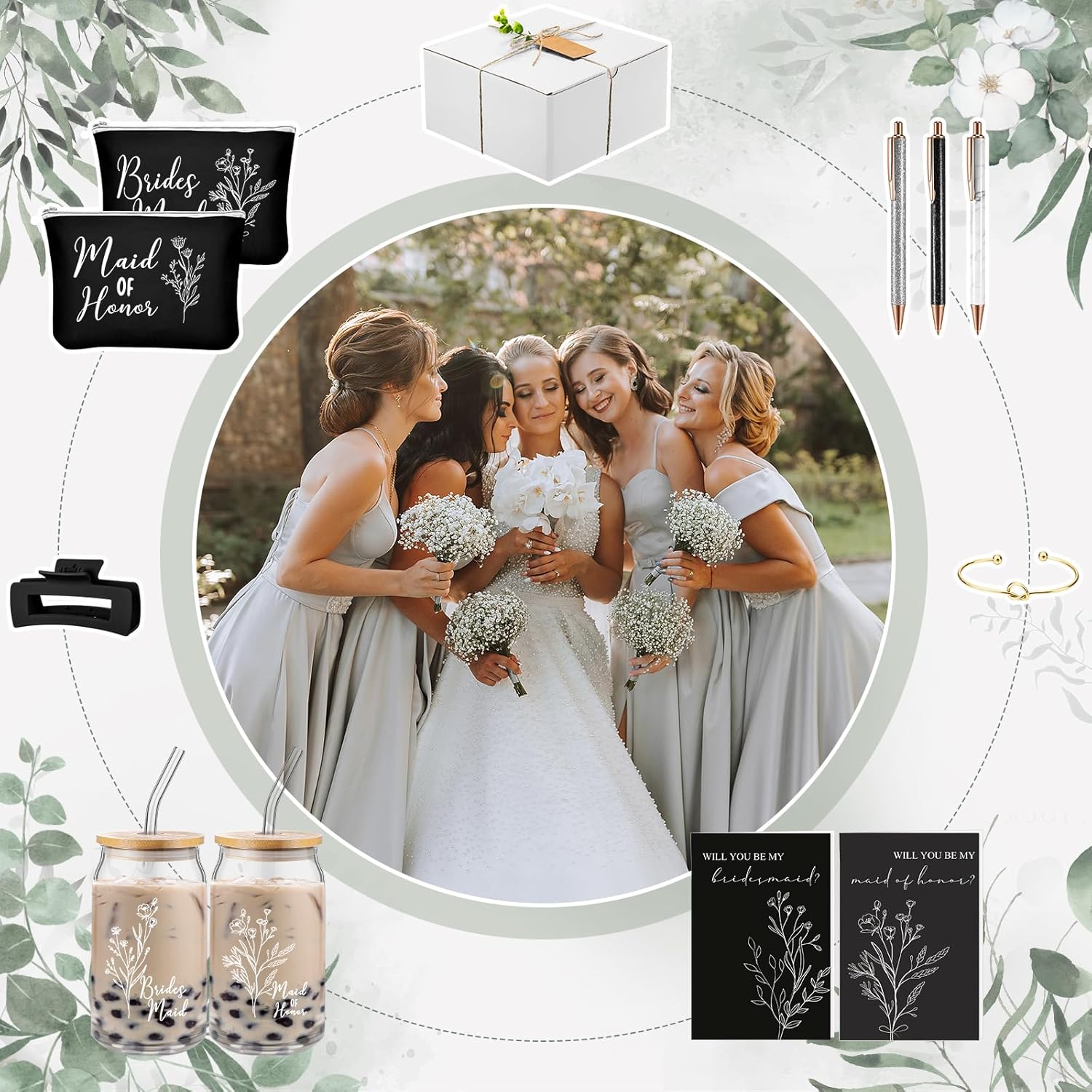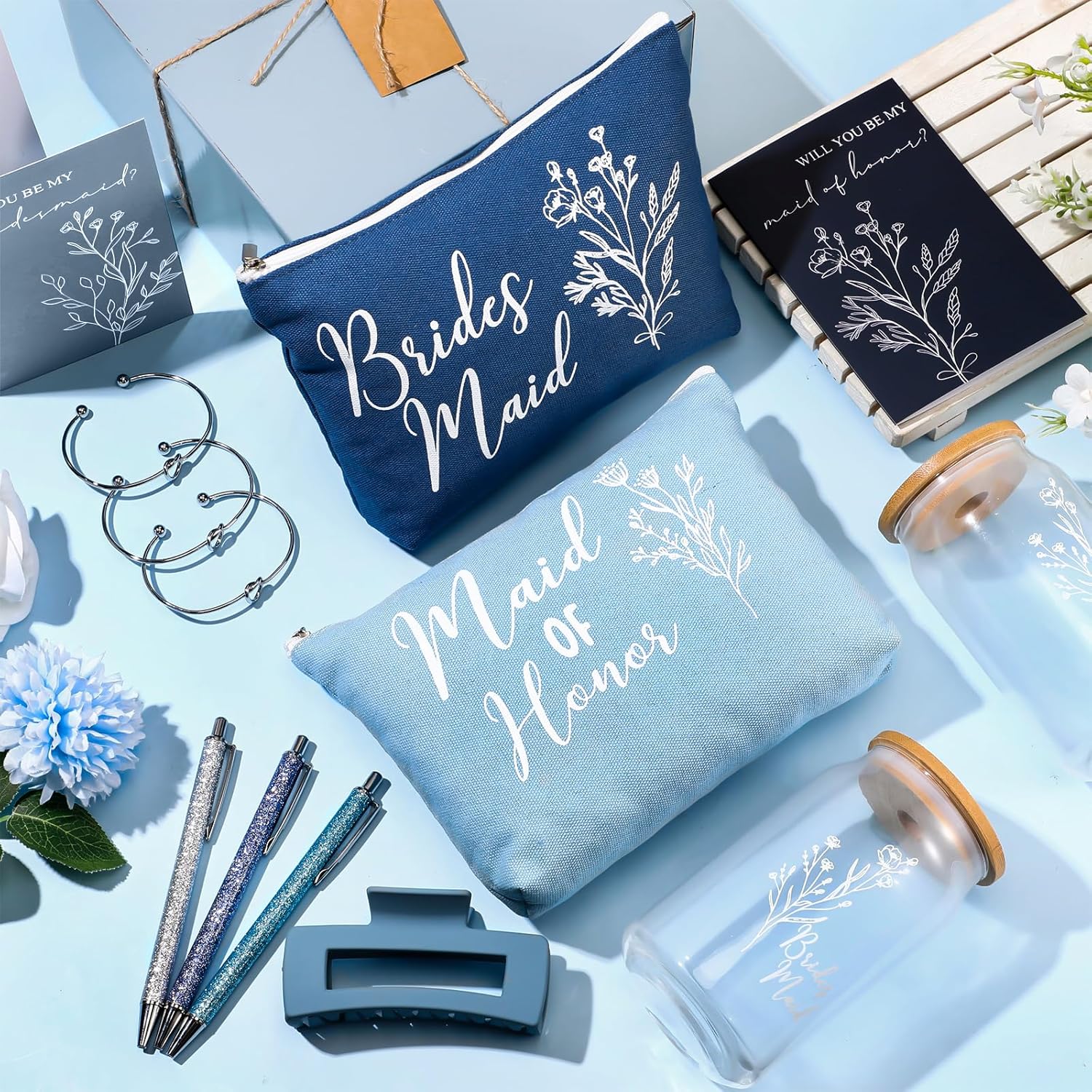 8 Sets/ 80 Pcs Bridesmaid Proposal Gifts Maid of Honor Gifts for Wedding, Include Glass Cup Makeup Bag Glitter Pen Card Bracelet Hair Clip Gift Box Kraft Tags Grass Twine(Green)