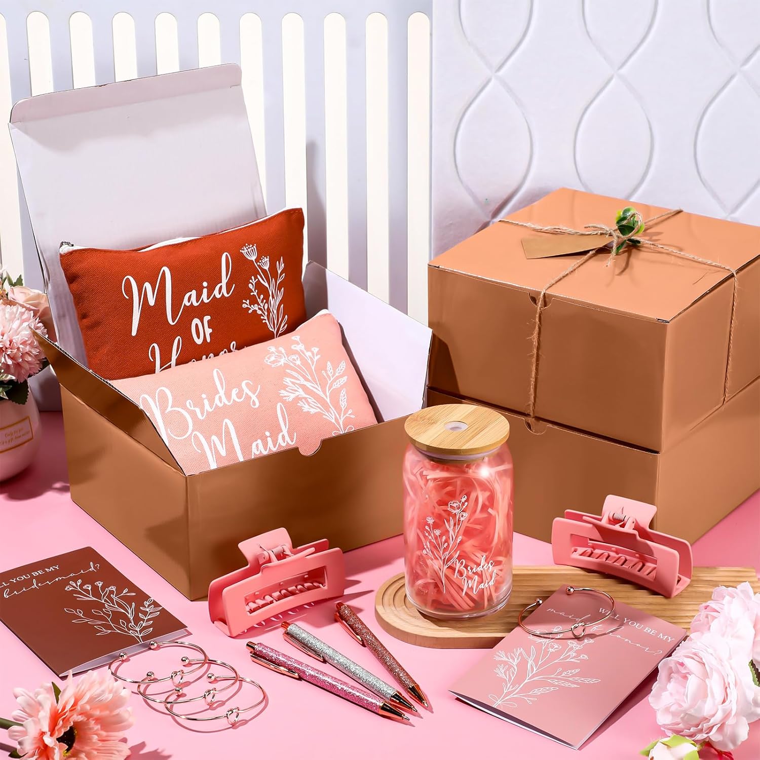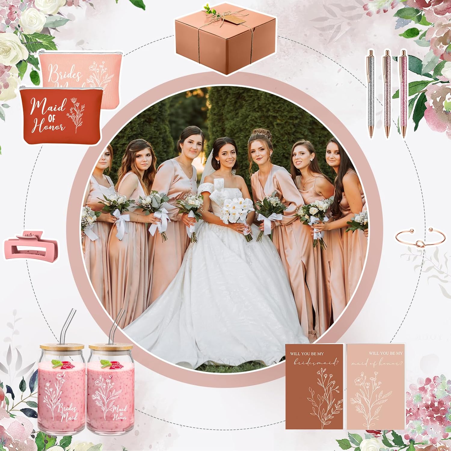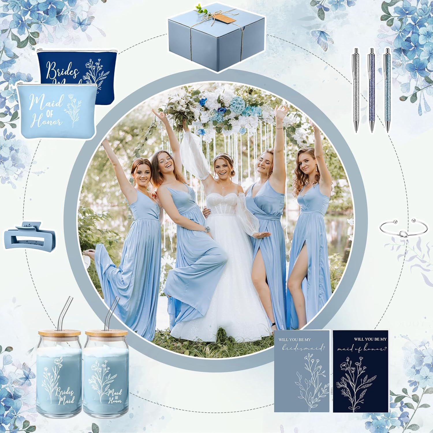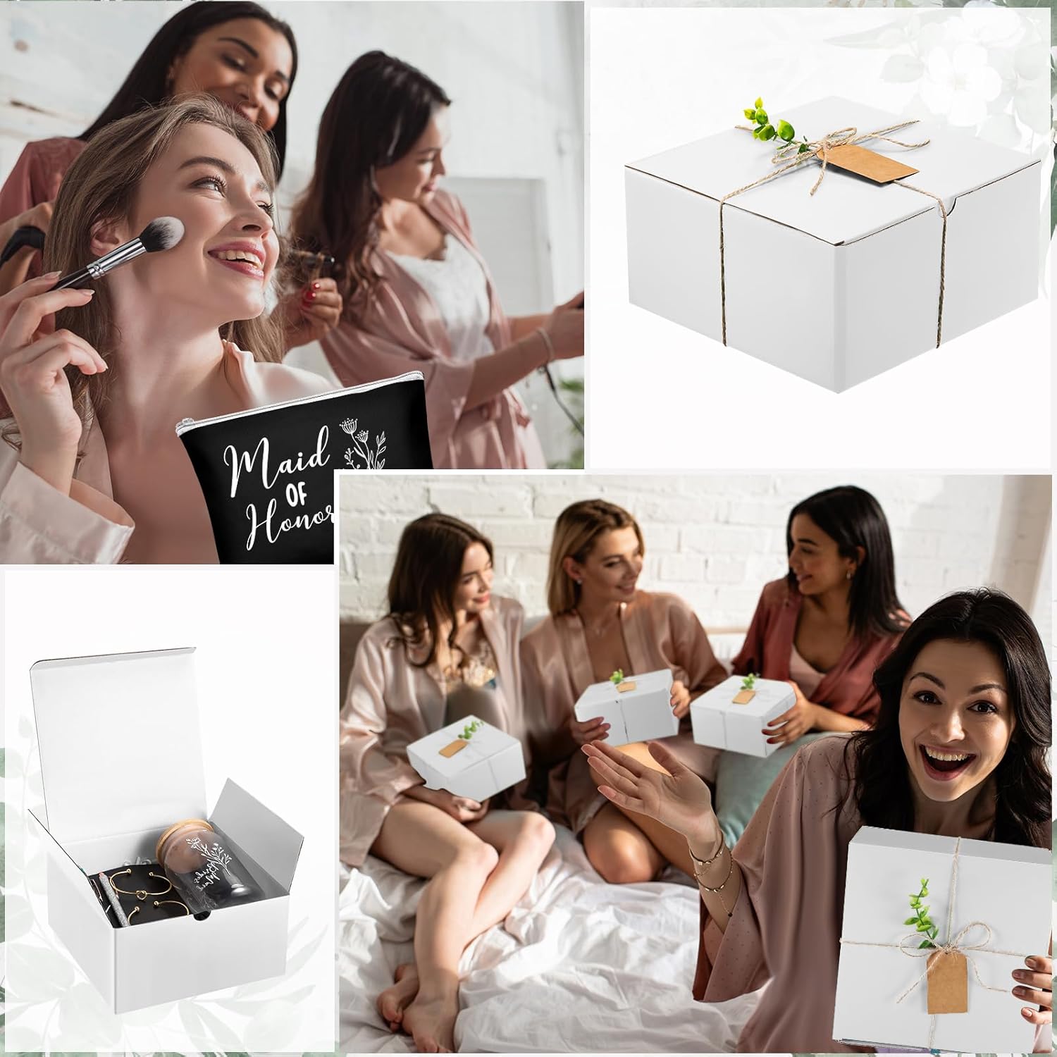 8 Sets/ 80 Pcs Bridesmaid Proposal Gifts Maid of Honor Gifts for Wedding, Include Glass Cup Makeup Bag Glitter Pen Card Bracelet Hair Clip Gift Box Kraft Tags Grass Twine(Green)