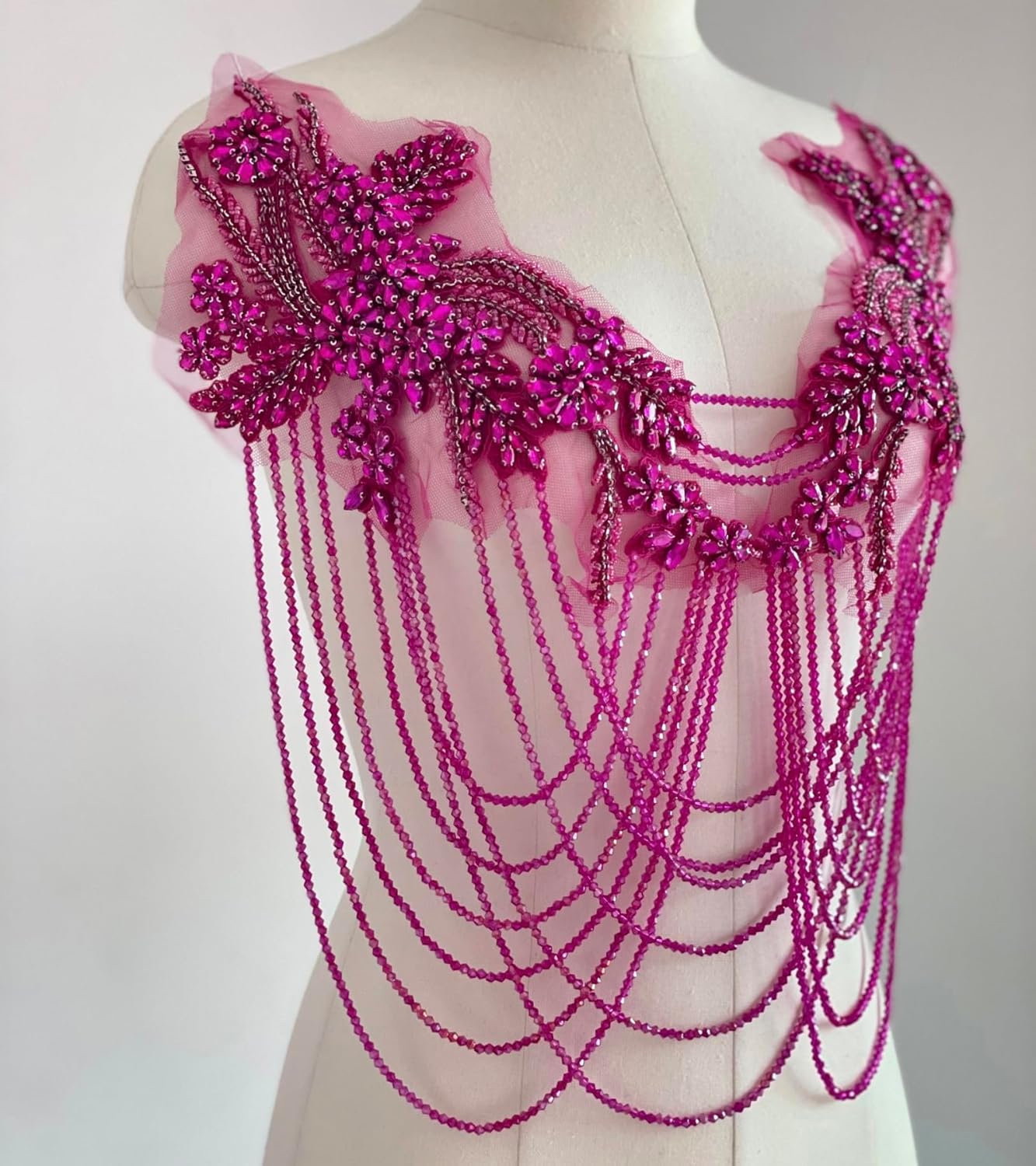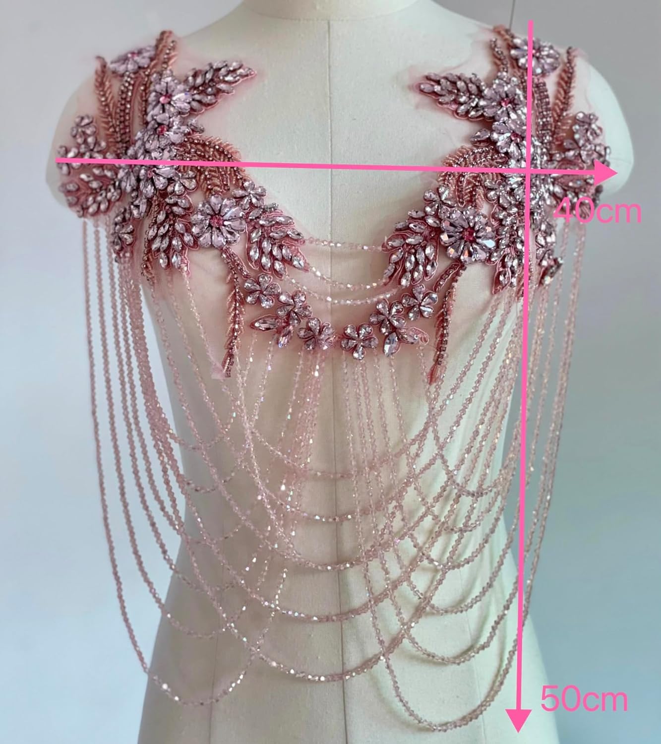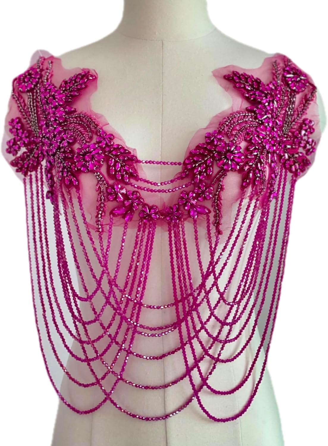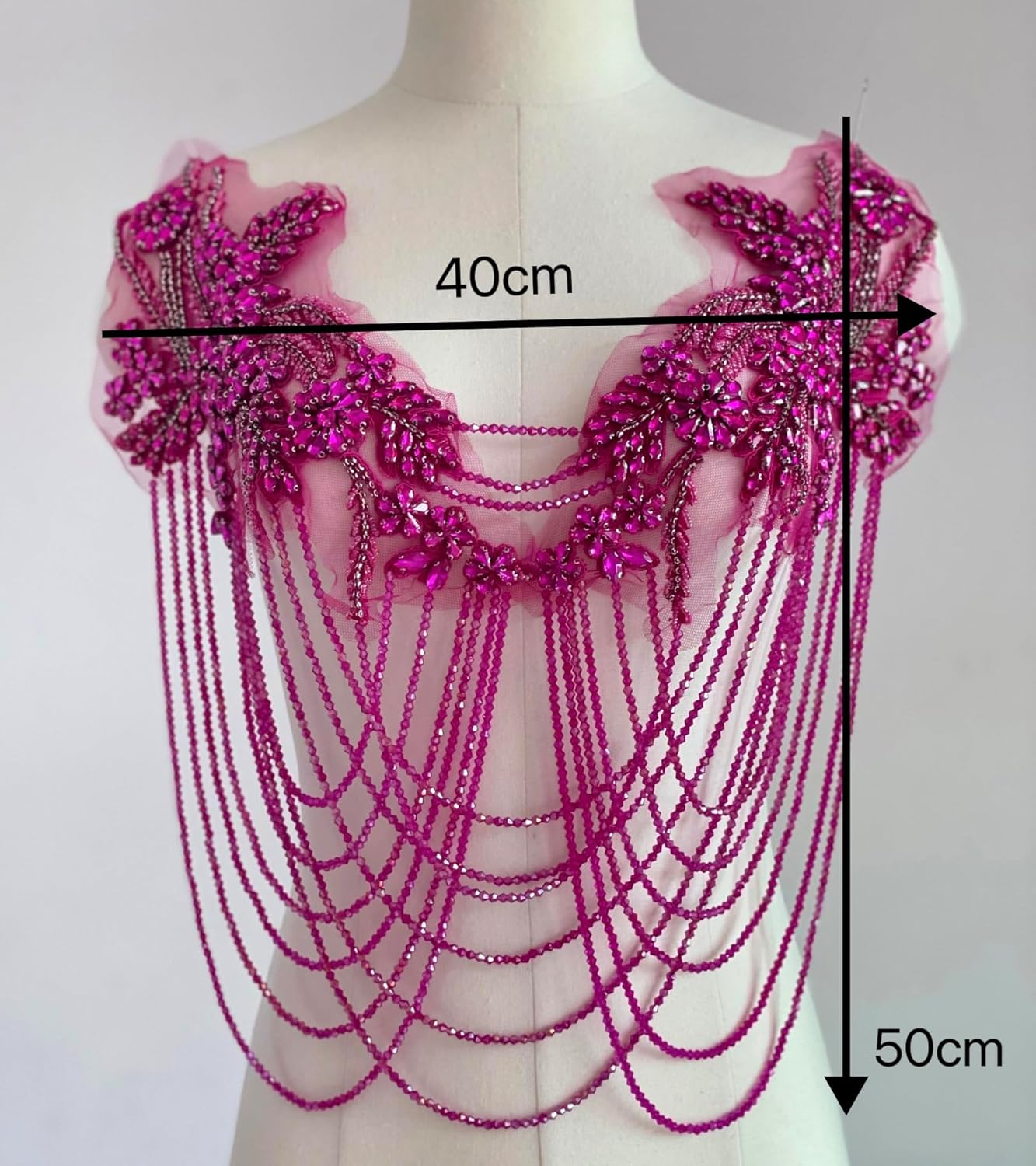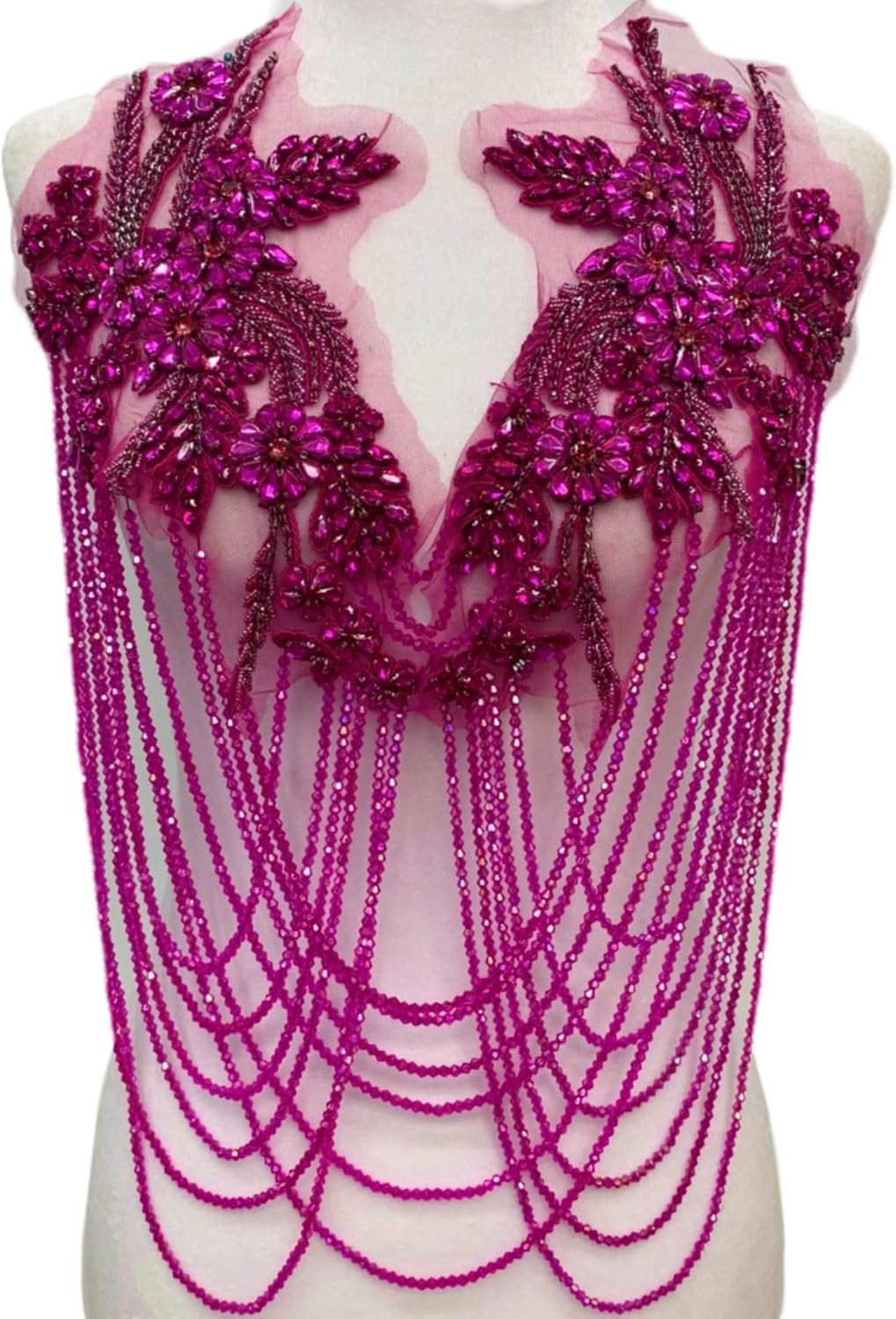Handmade Tassel Rhinestone Applique,Rhinestone Bodice Applique, Rhinestone Applique for Dress Wedding Clothing Accessory Applique、Patch (Pink)