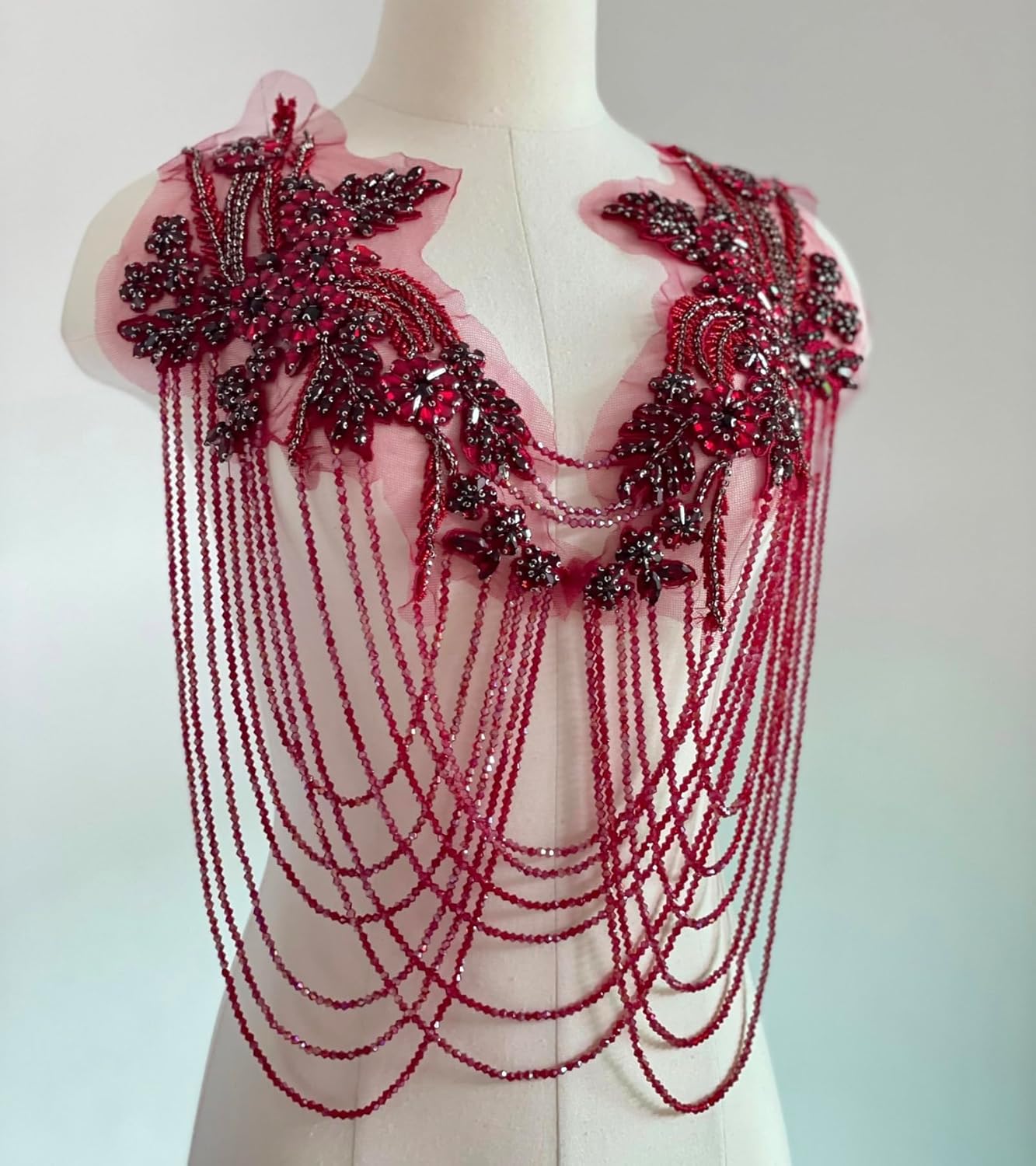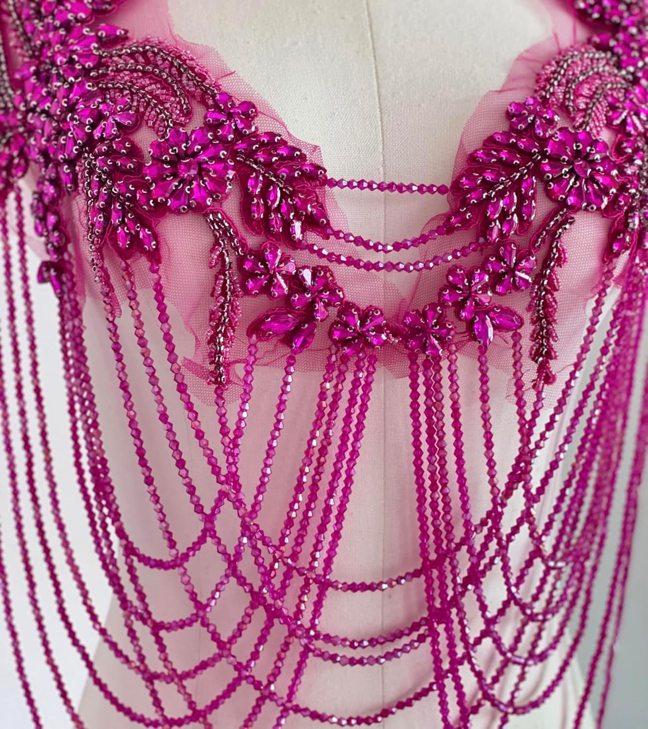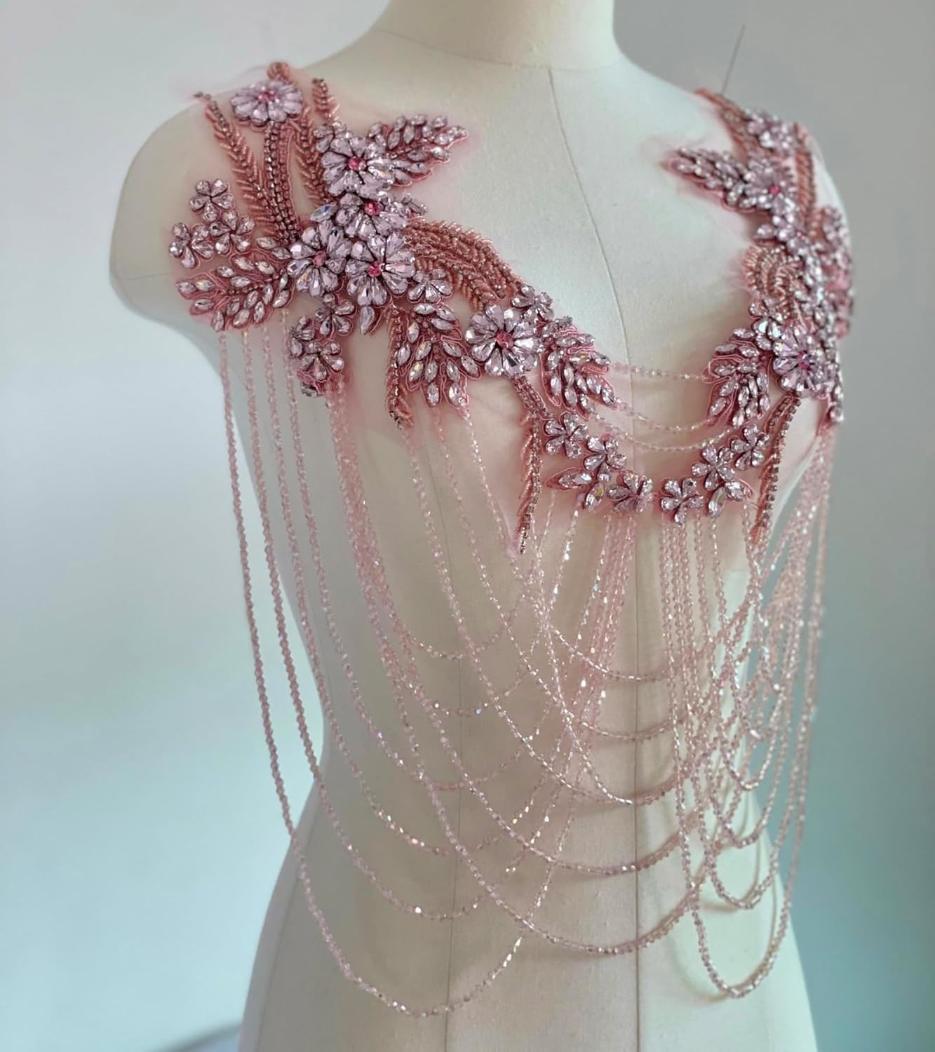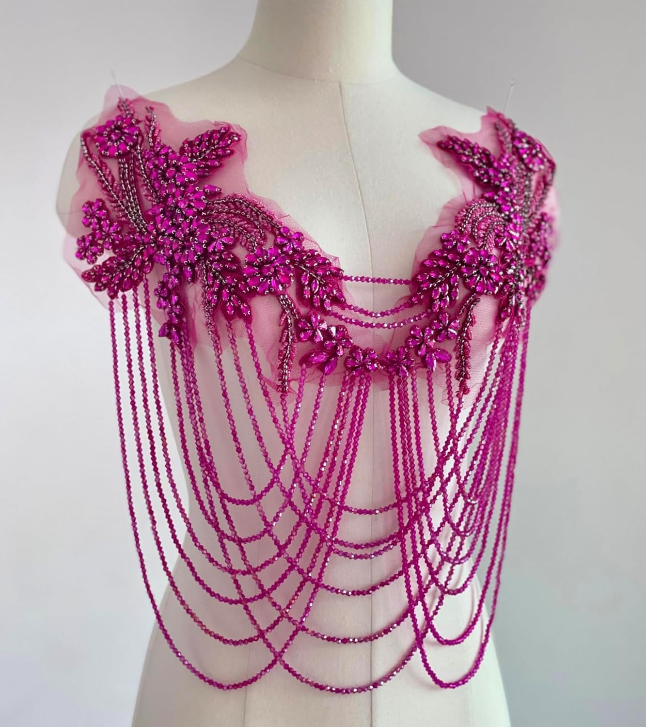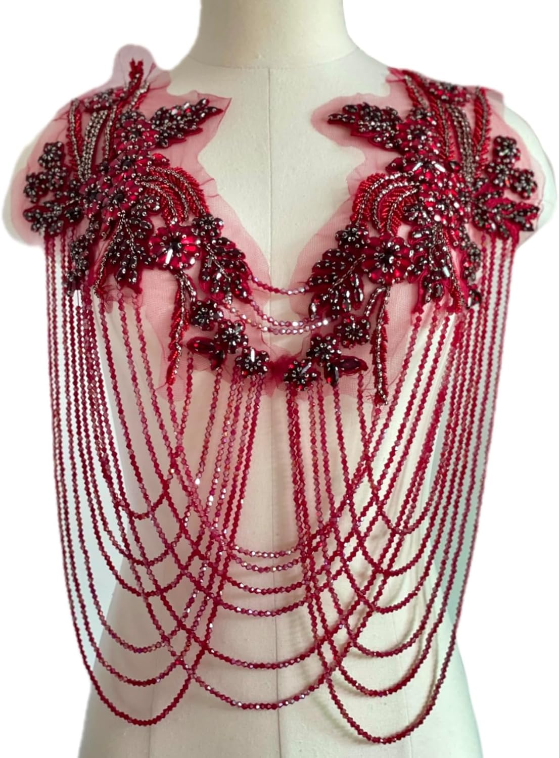 Handmade Tassel Rhinestone Applique,Rhinestone Bodice Applique, Rhinestone Applique for Dress Wedding Clothing Accessory Applique、Patch (Pink)
