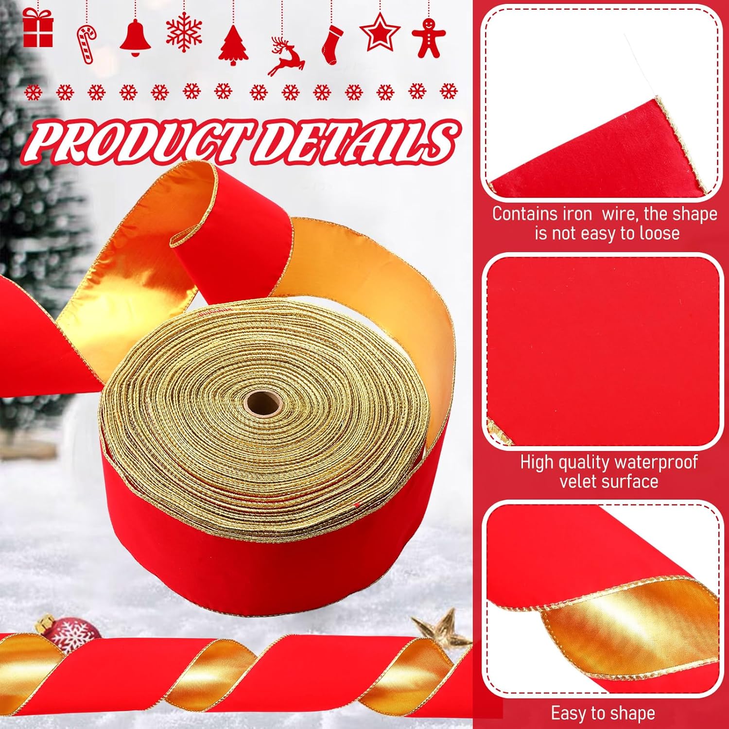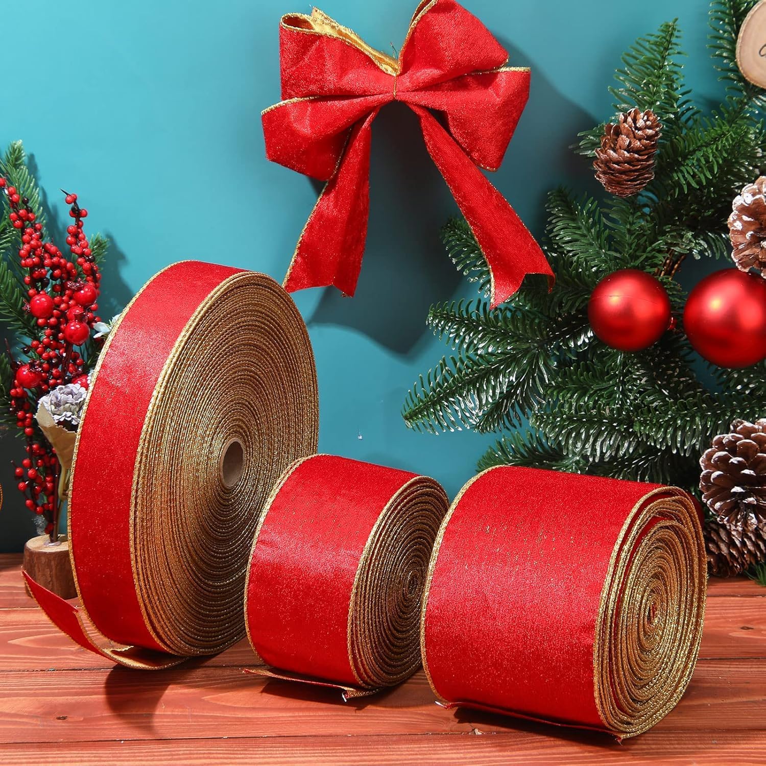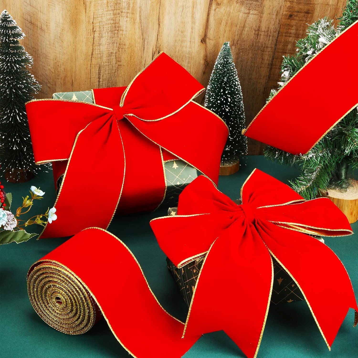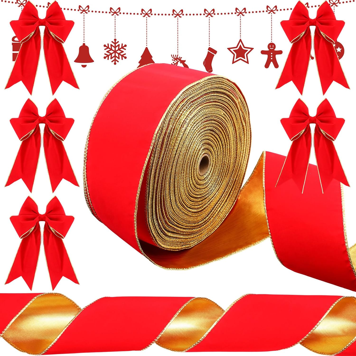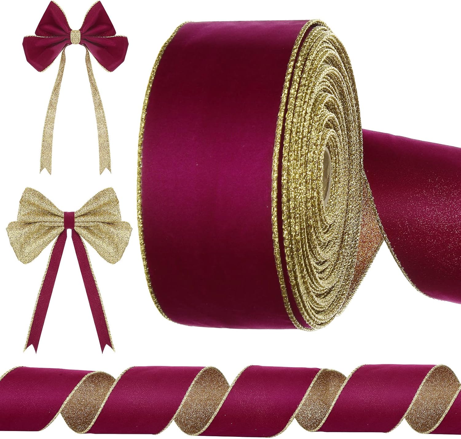Syhood Christmas Wired Velvet Ribbon with Gold Edge Waterproof Velvet Decoration Ribbon Wrapping for Xmas Wreath Bows Floral Craft Ornaments(2.5 Inch X 300 Yard,Scarlet)