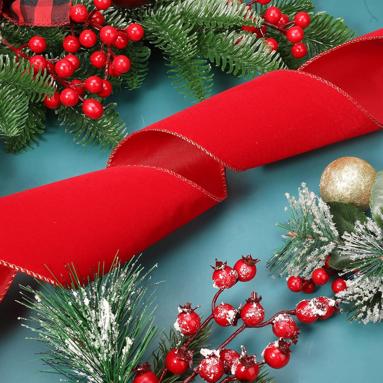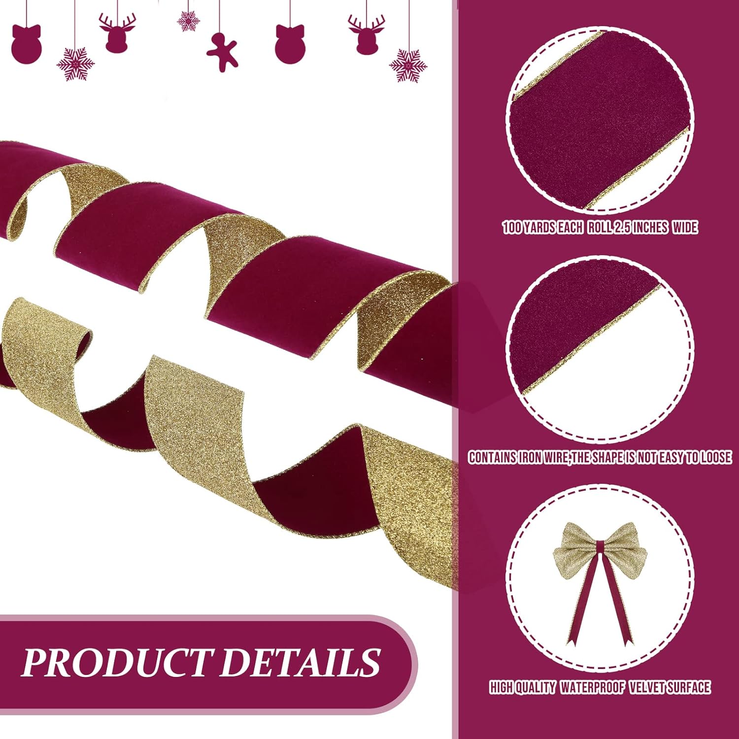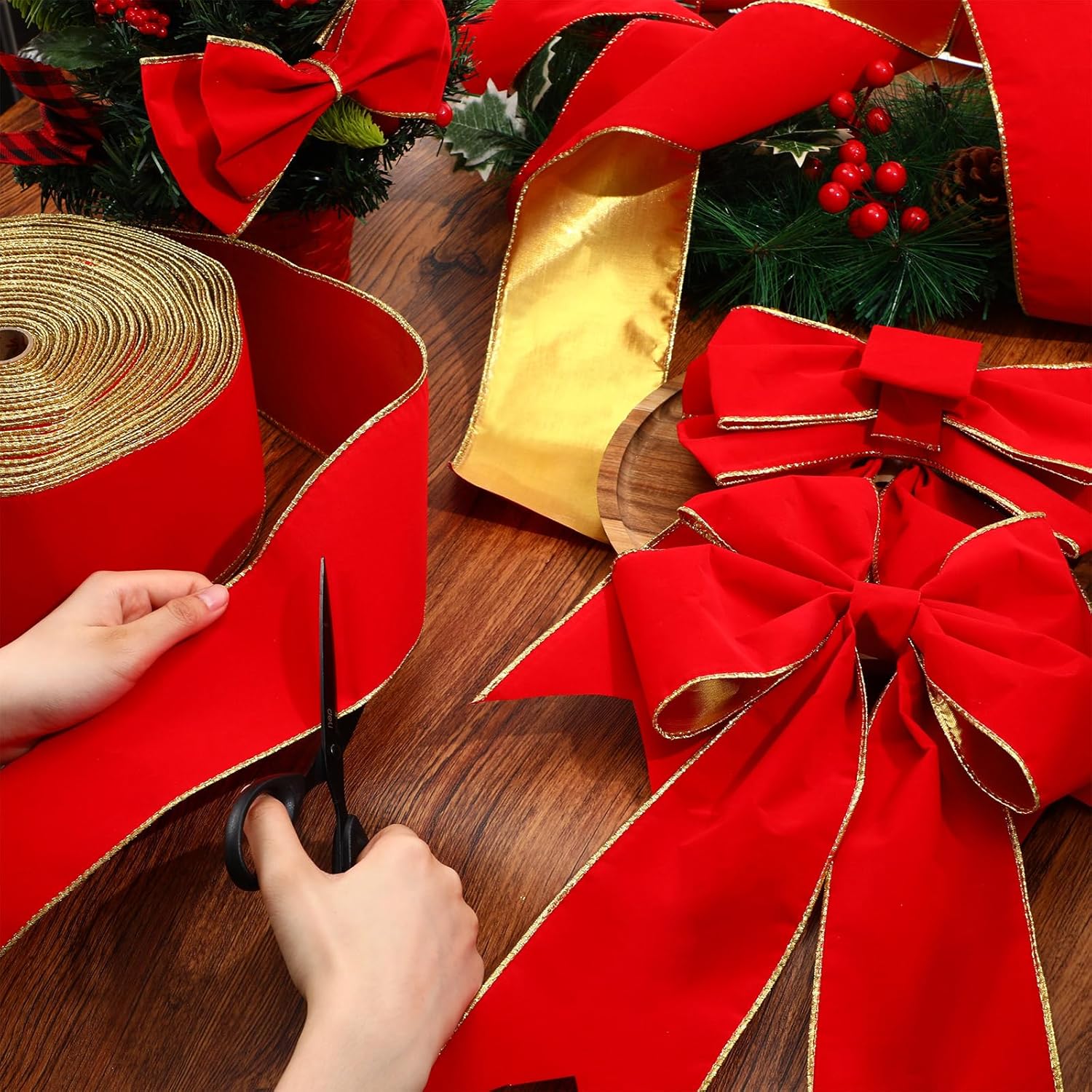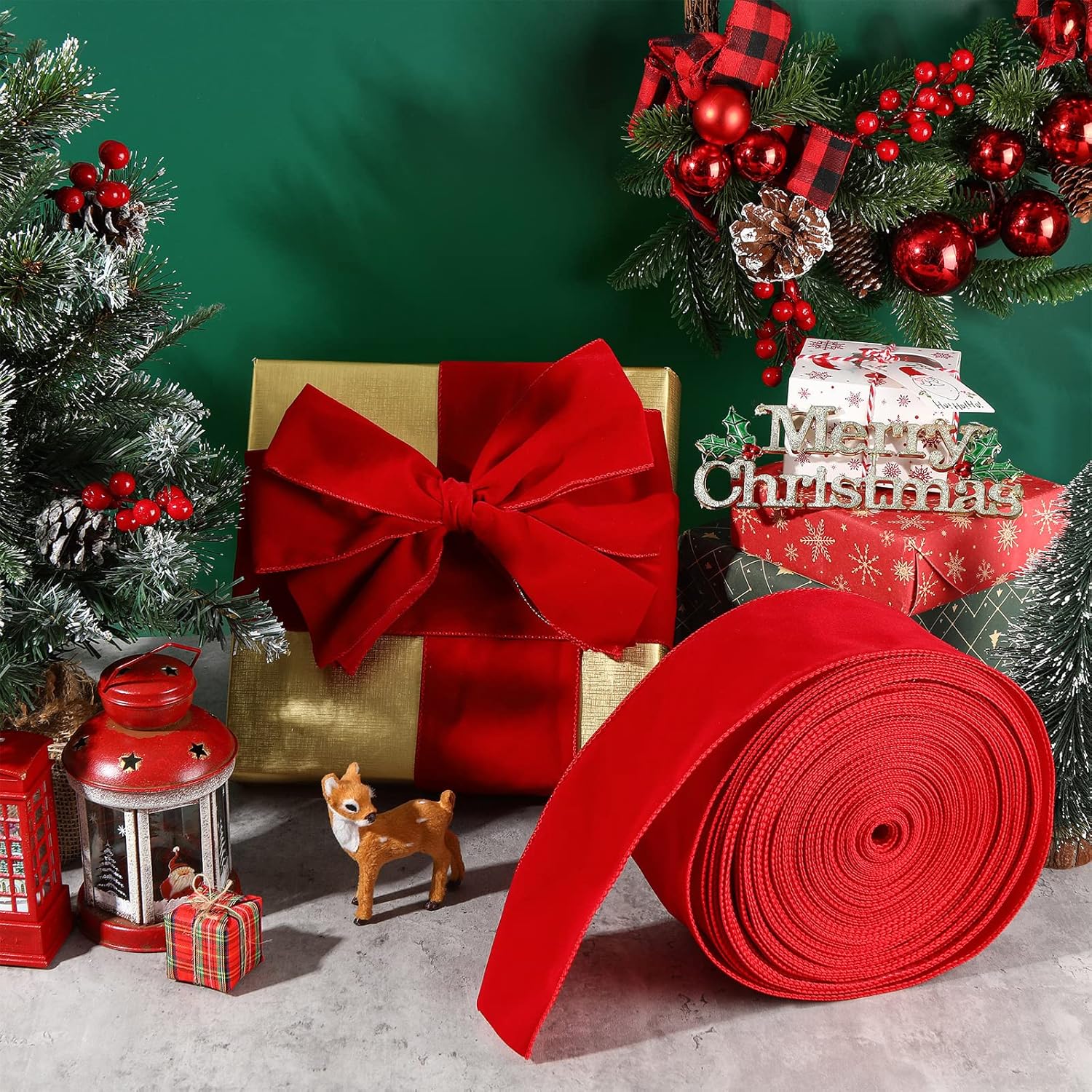 Syhood Christmas Wired Velvet Ribbon with Gold Edge Waterproof Velvet Decoration Ribbon Wrapping for Xmas Wreath Bows Floral Craft Ornaments(2.5 Inch X 300 Yard,Scarlet)