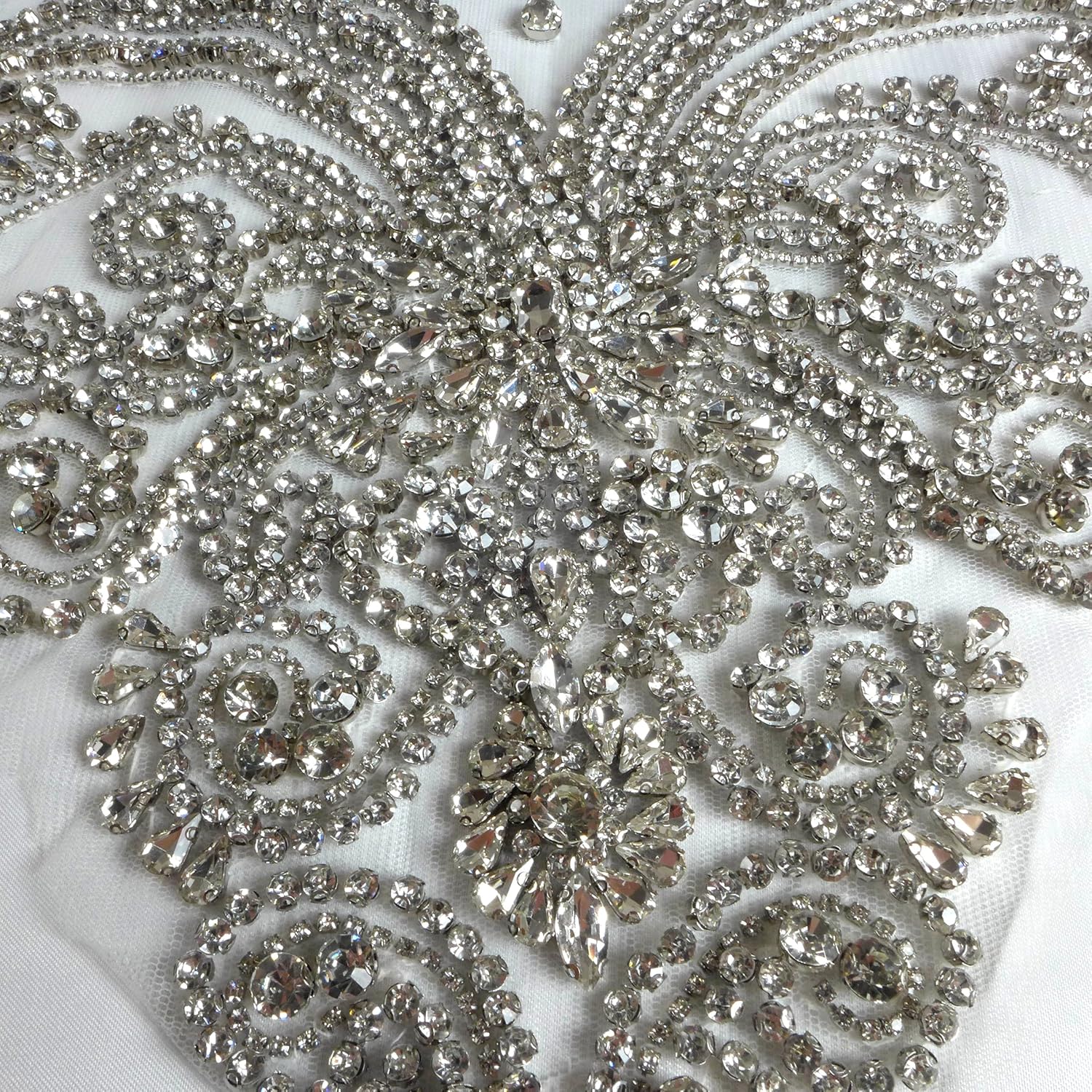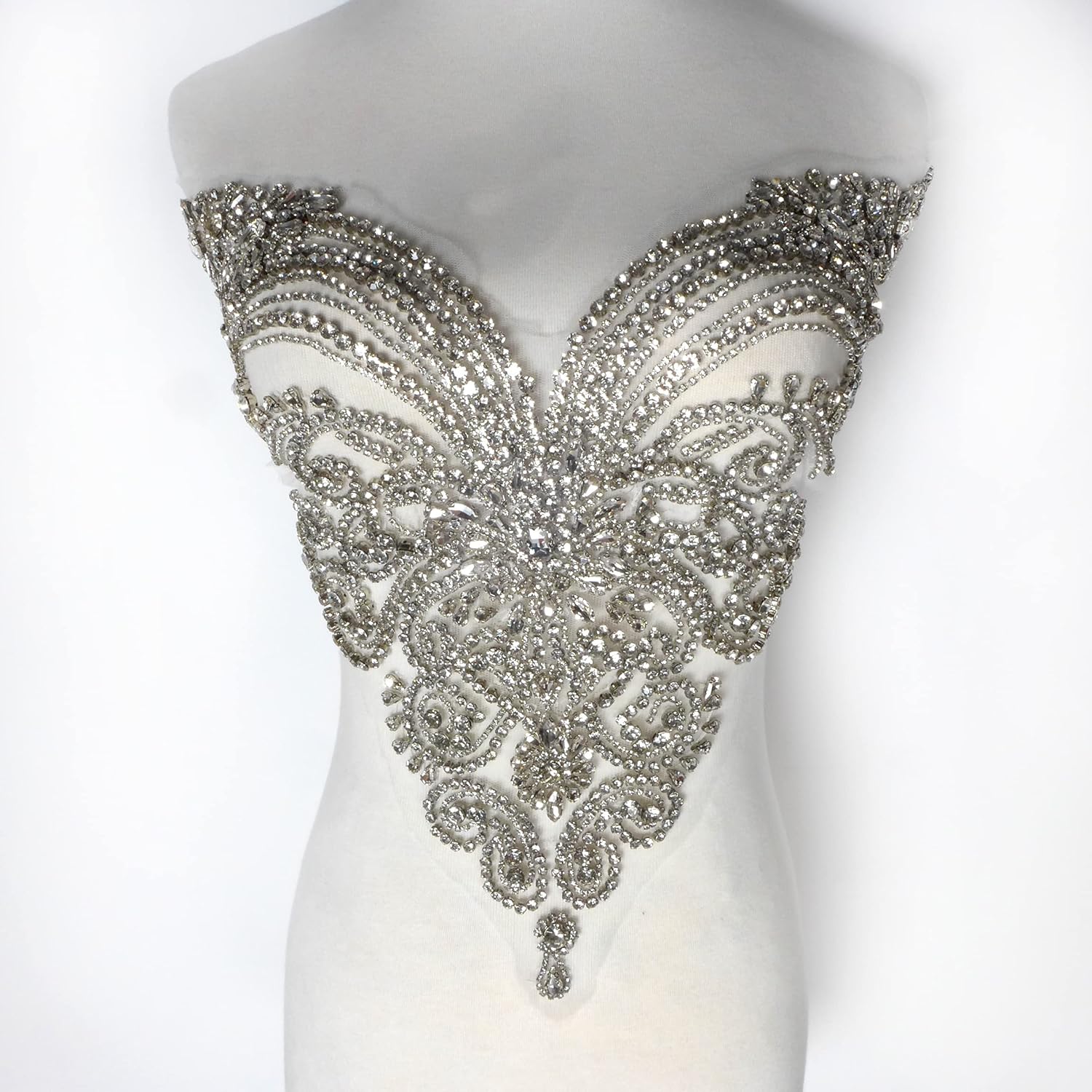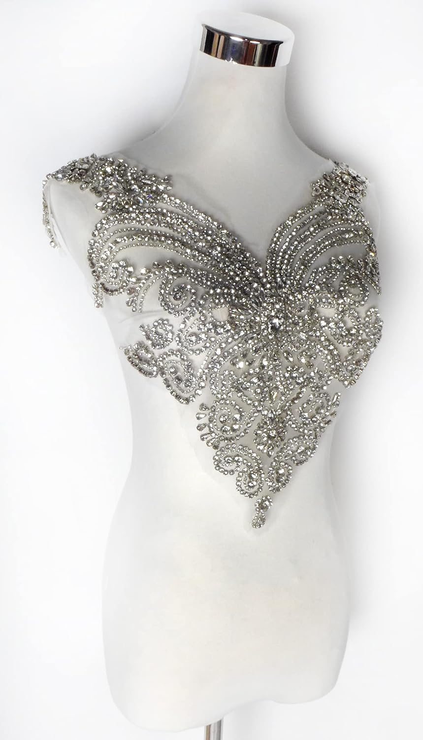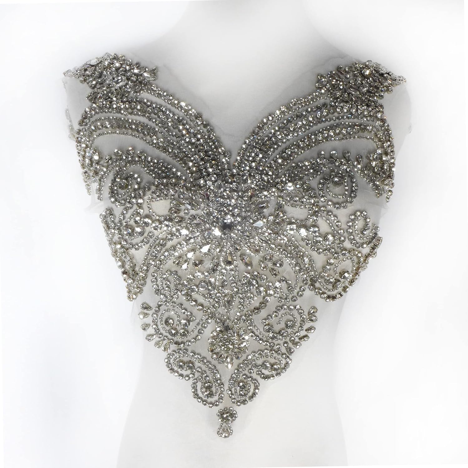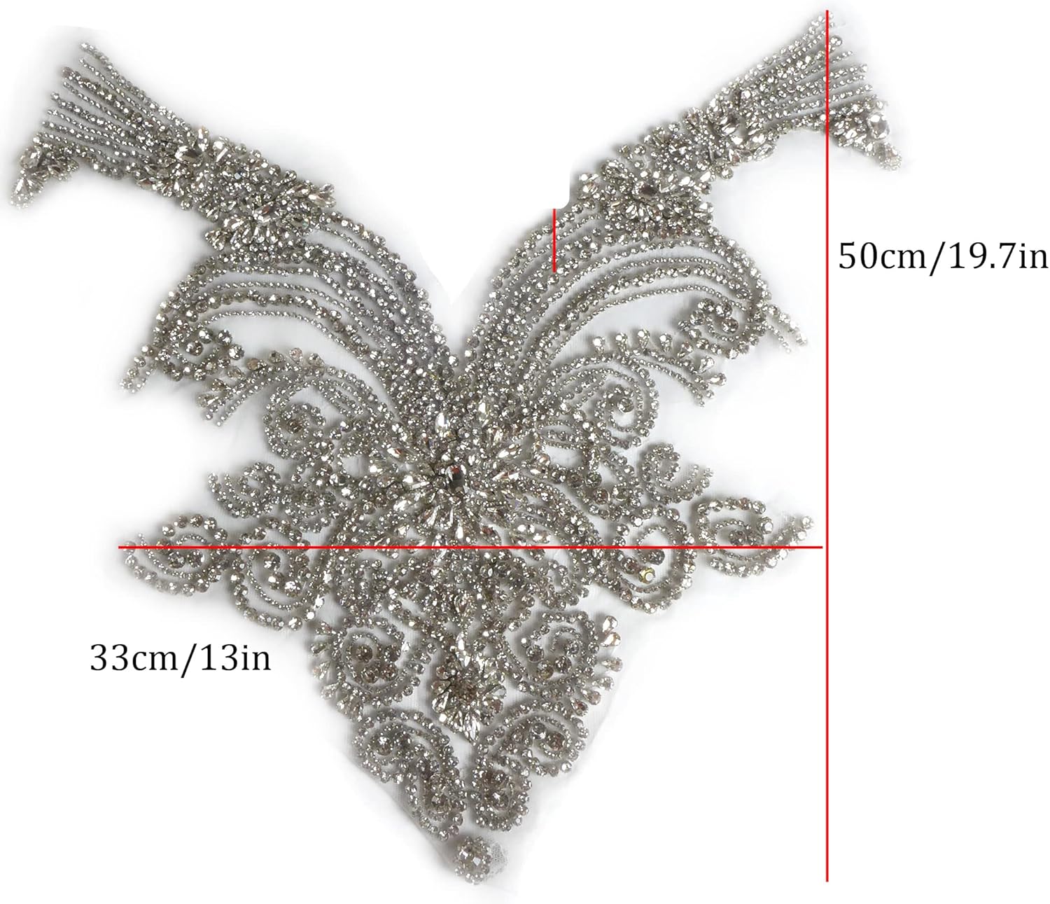 New Gold Silver Rhinestones Bodice and Neck Applique Handmade Glass Crystal Applique Patch for Dress Cloth by Piece (Silver-B)