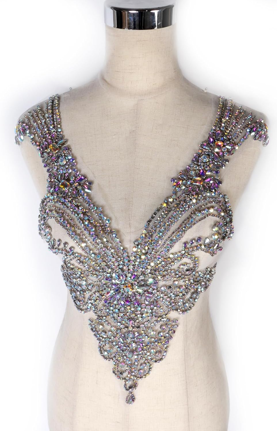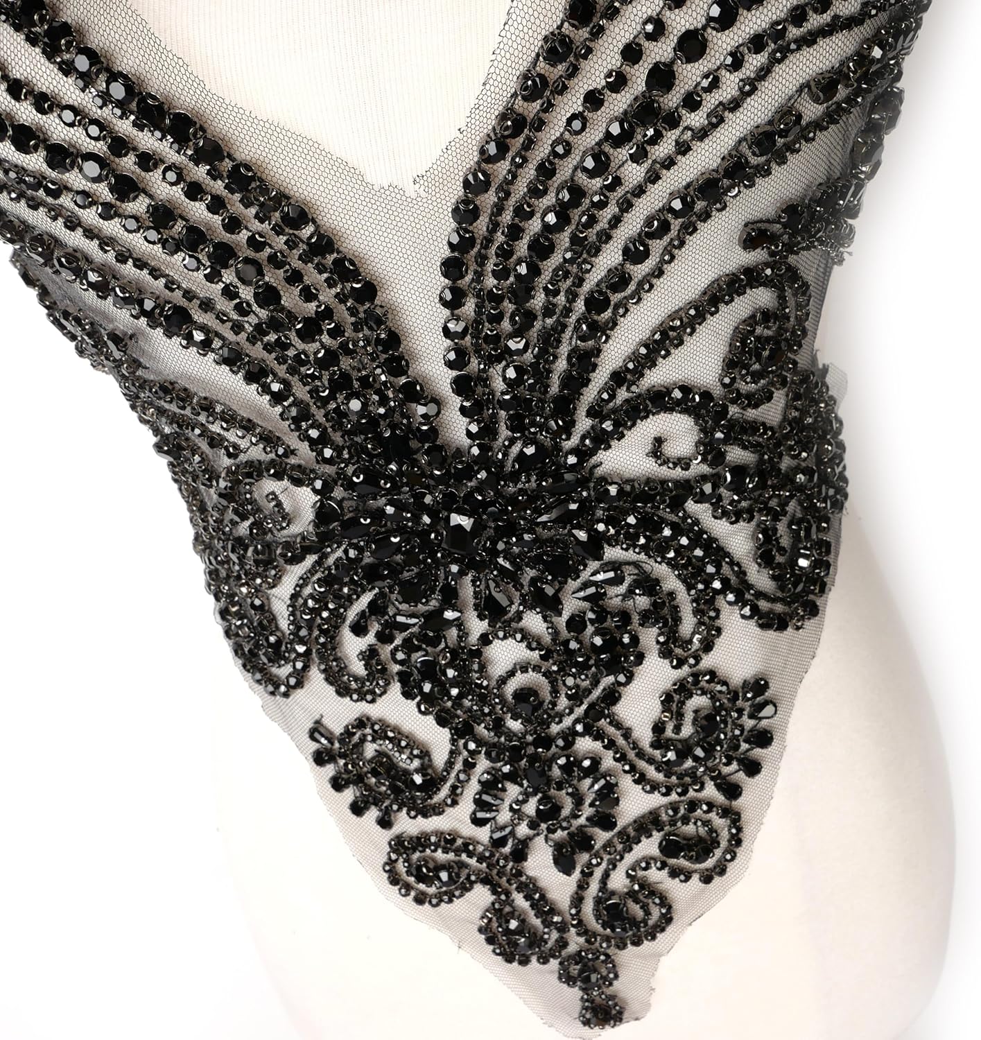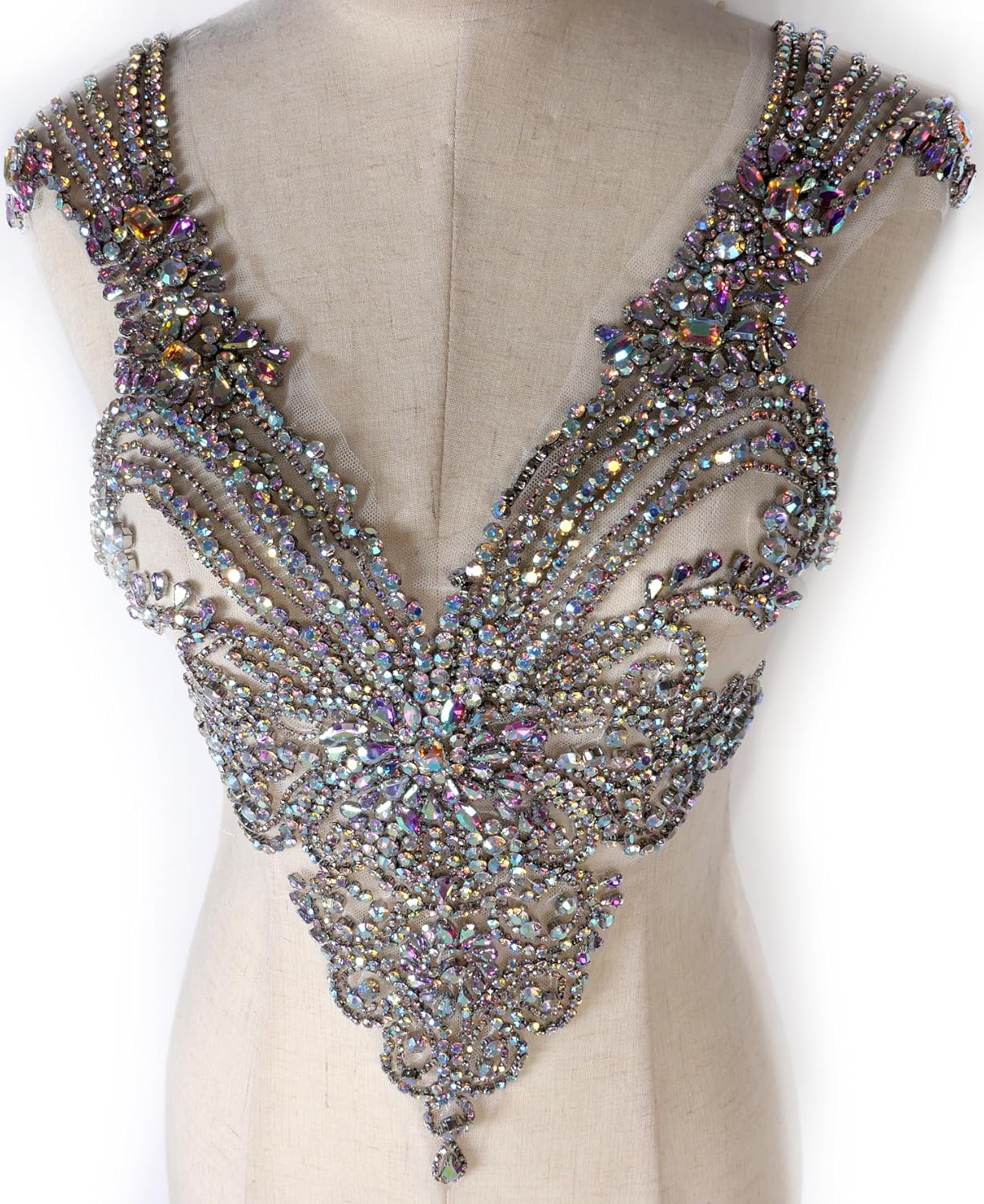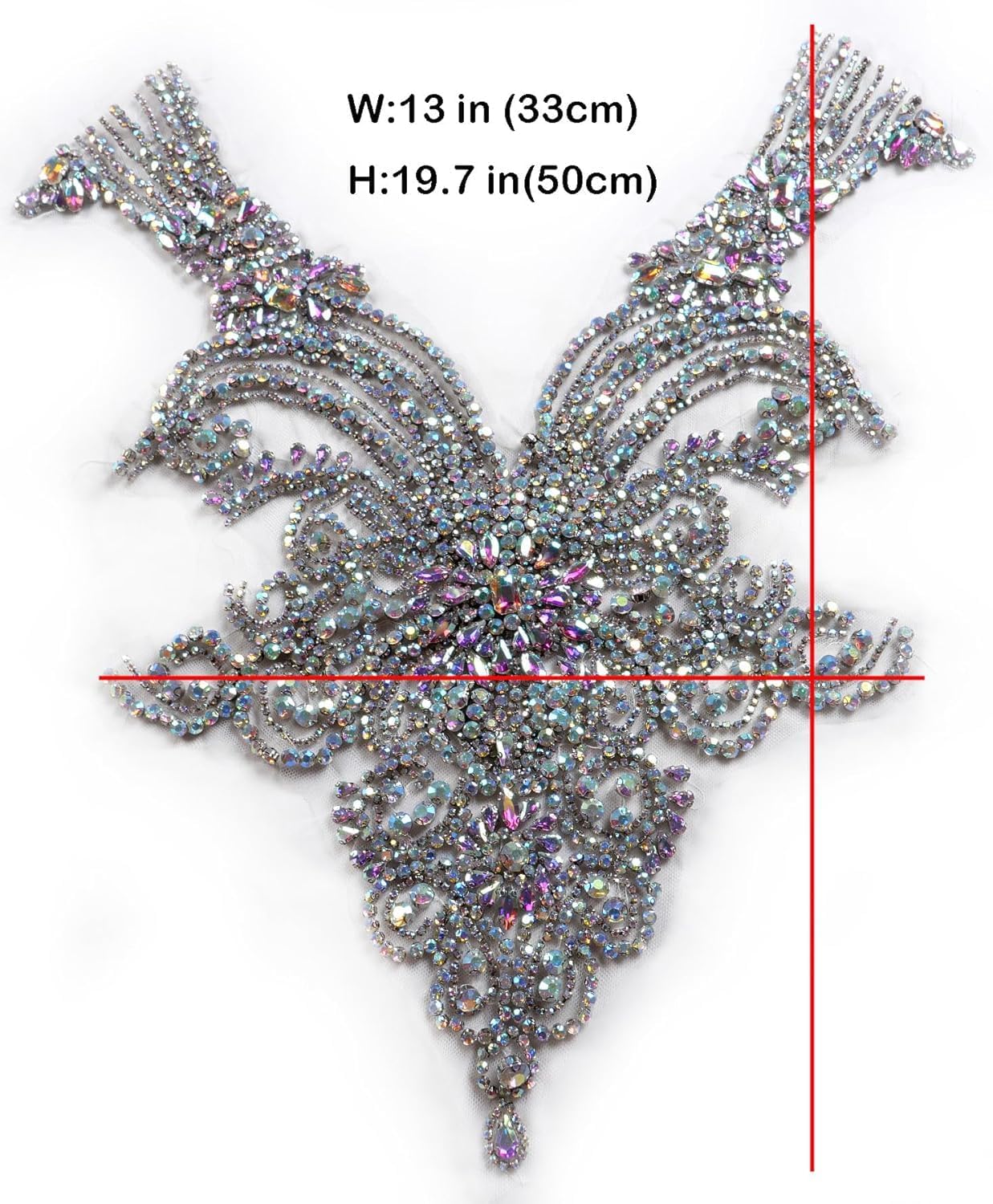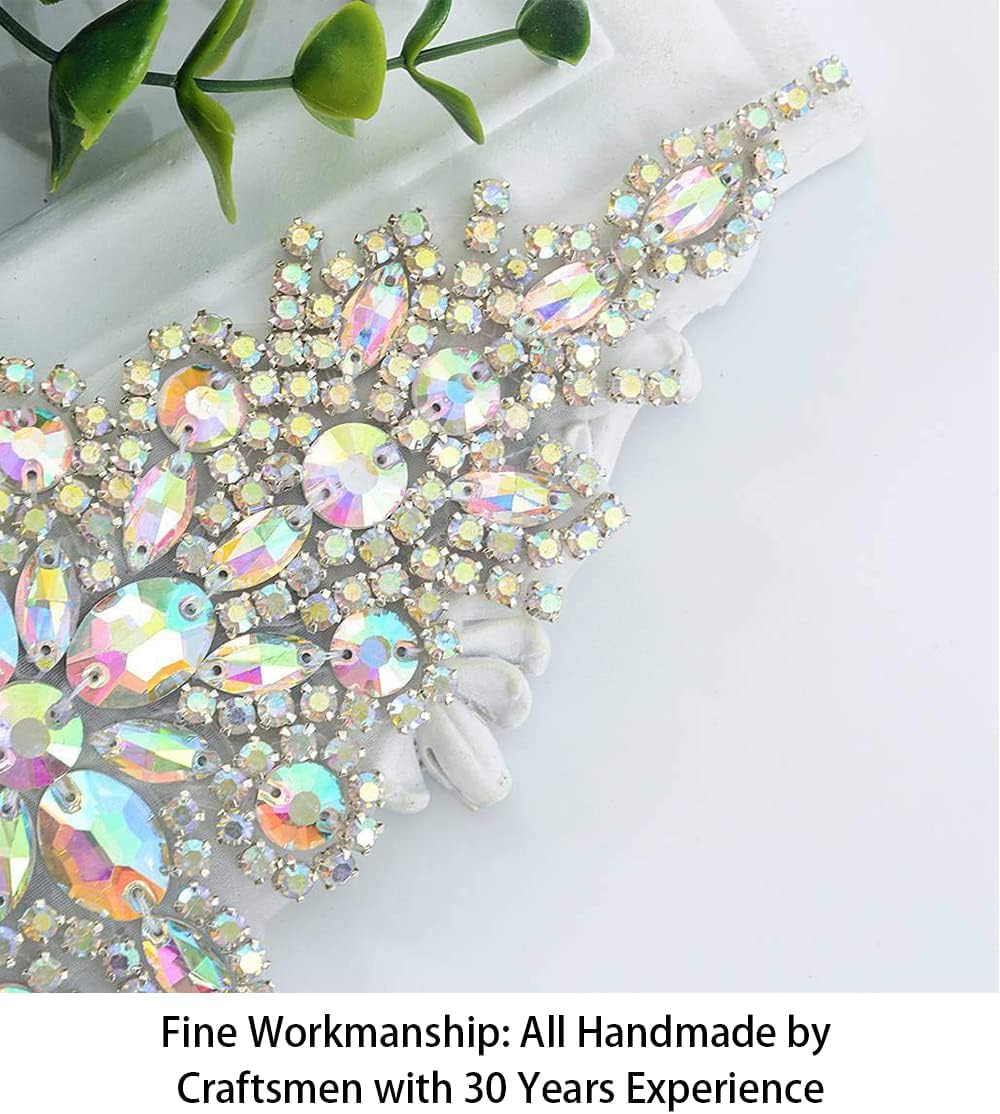 New Gold Silver Rhinestones Bodice and Neck Applique Handmade Glass Crystal Applique Patch for Dress Cloth by Piece (Silver-B)
