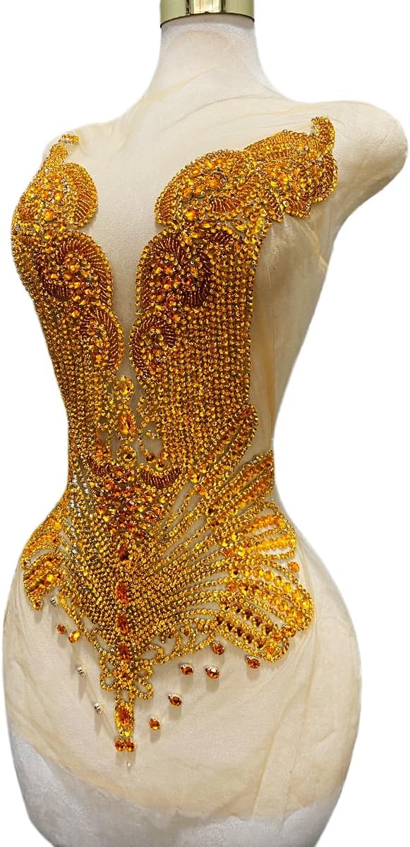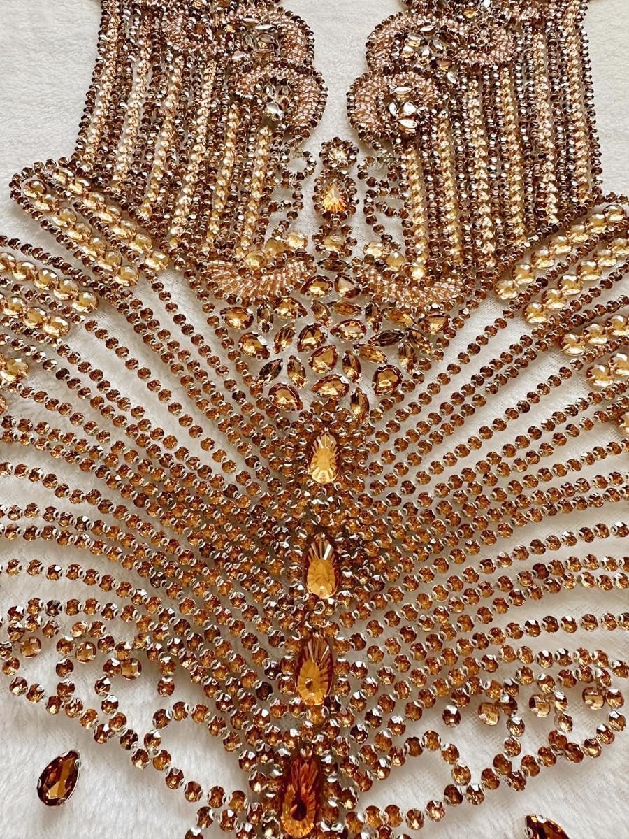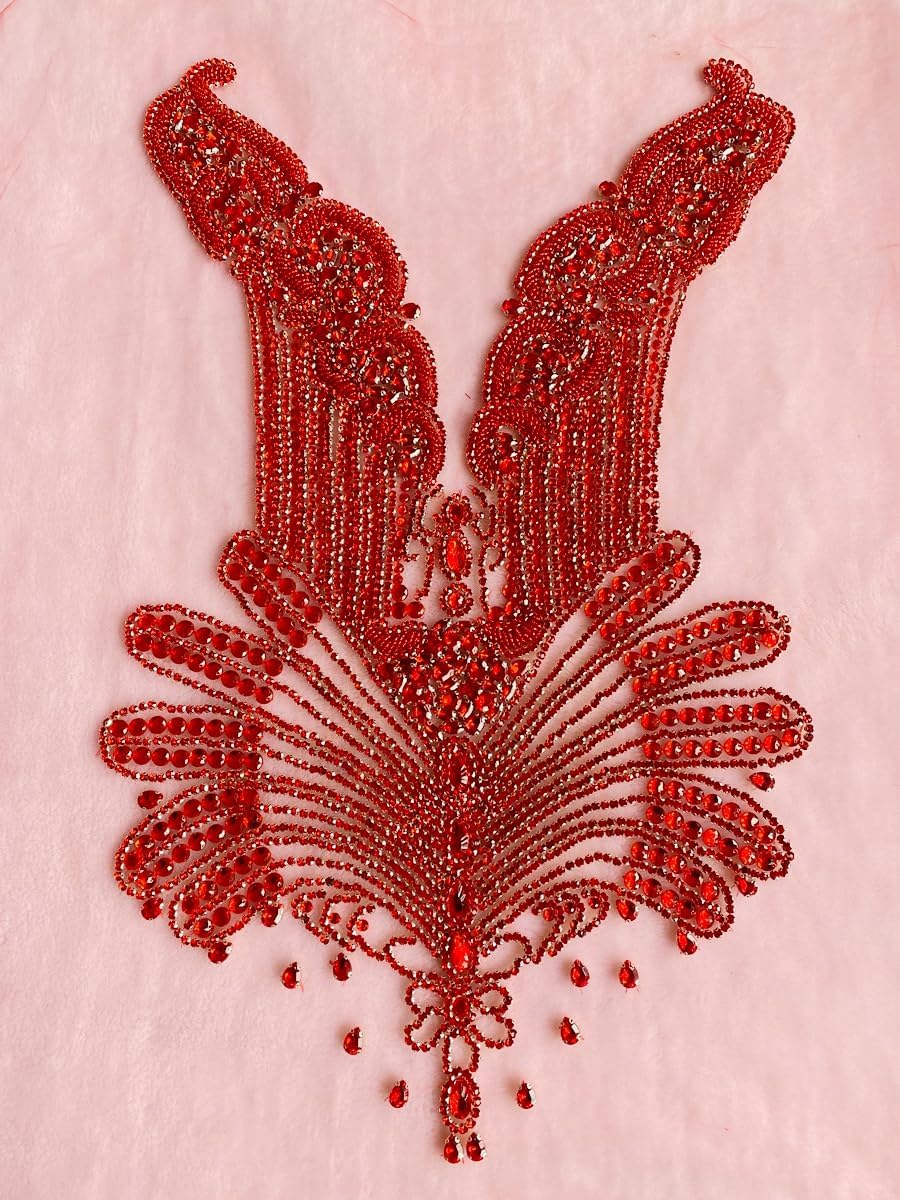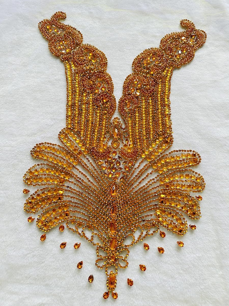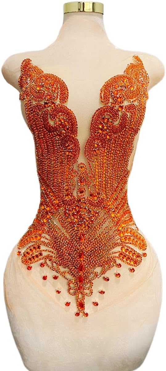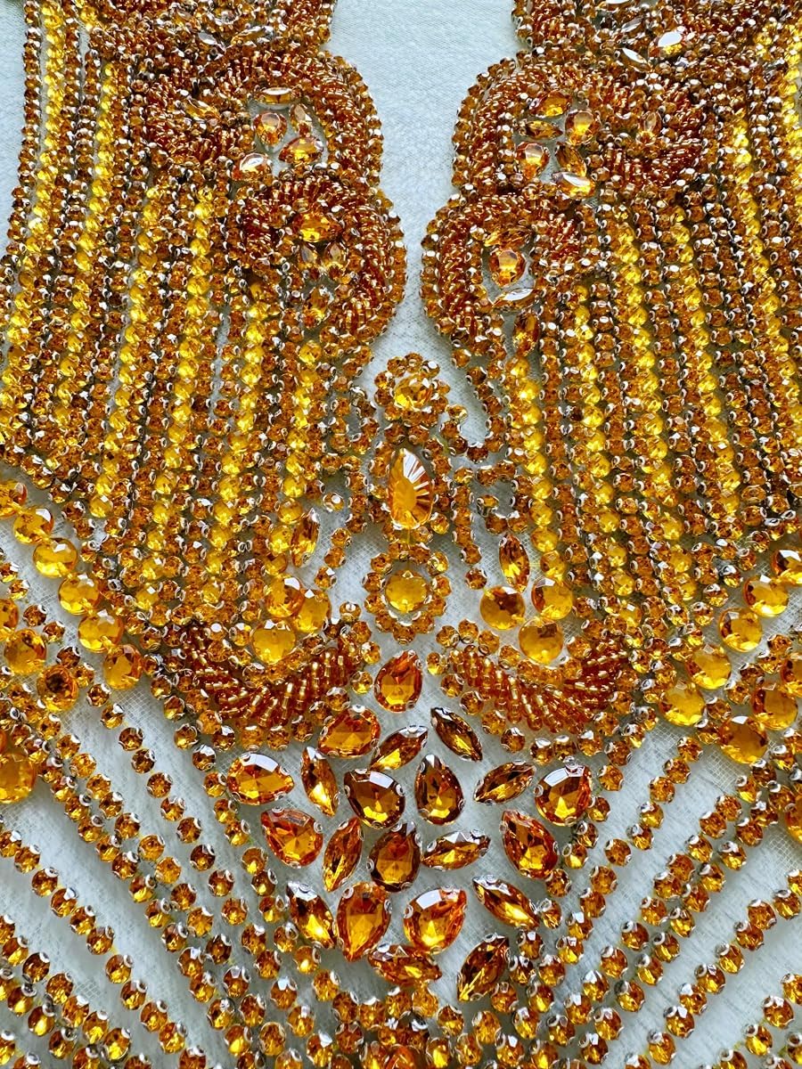 Large Bodice Applique Sequin Rhinestones Fine Appliques Handsewing Crystals and Beads for Dress Clothes Accessories 9.4X23.6inches (Orange)