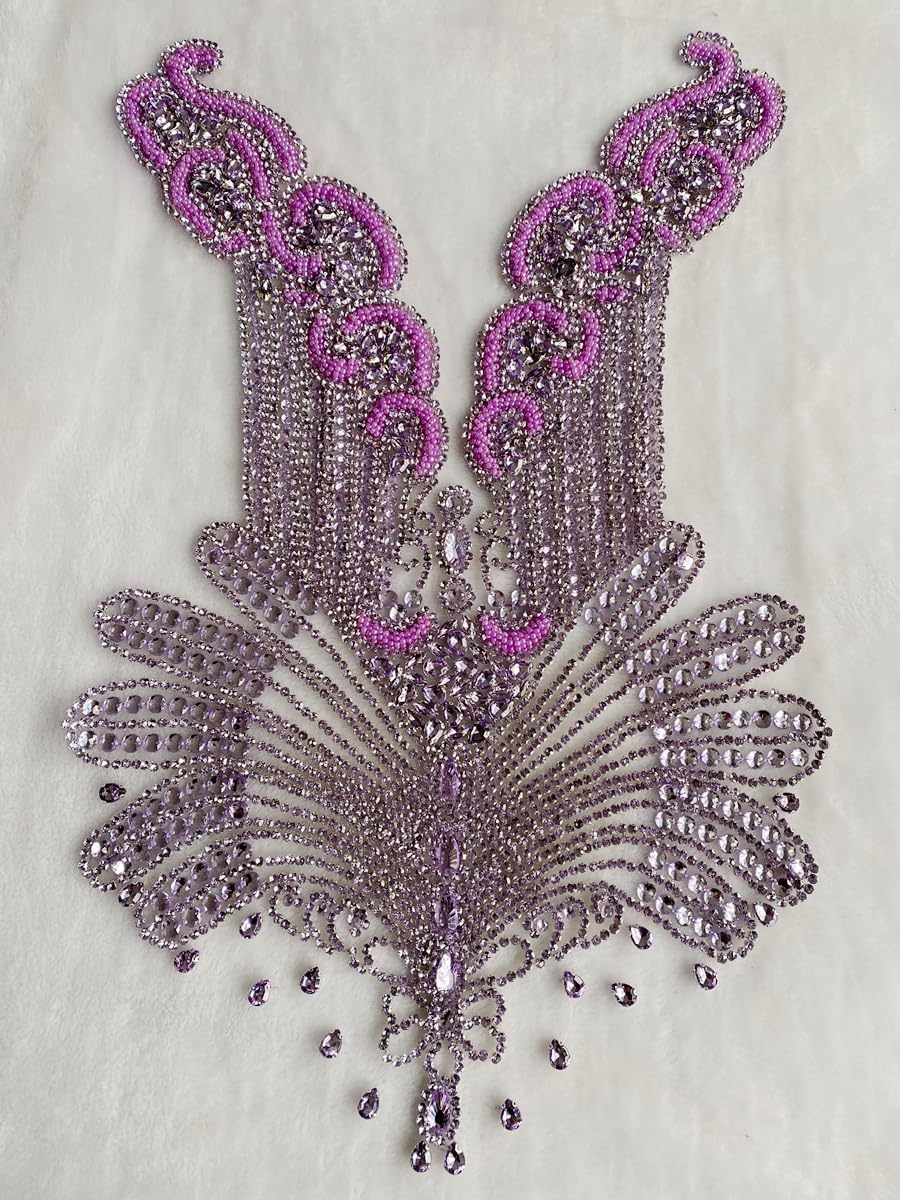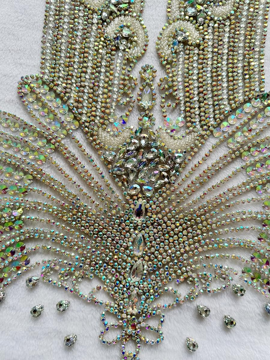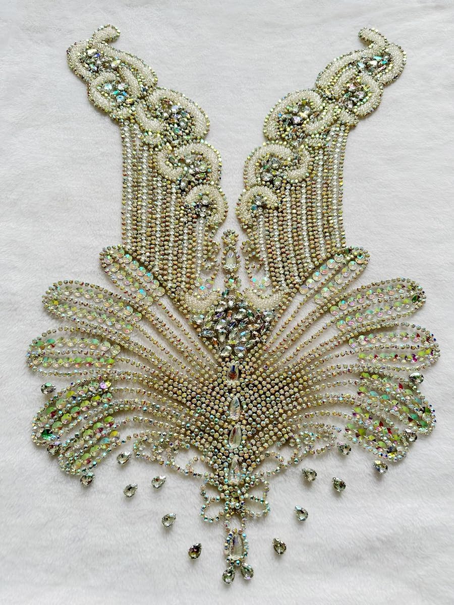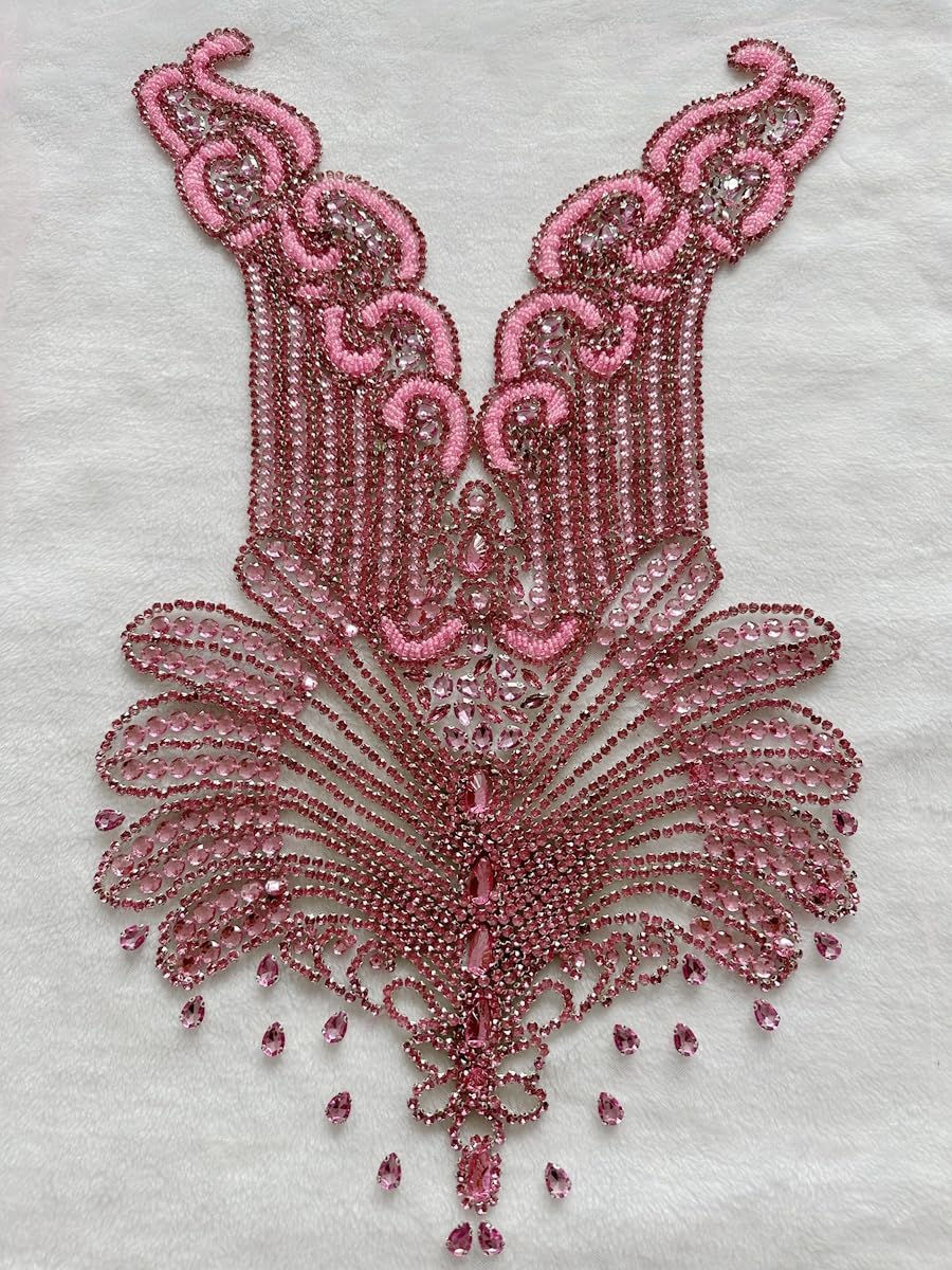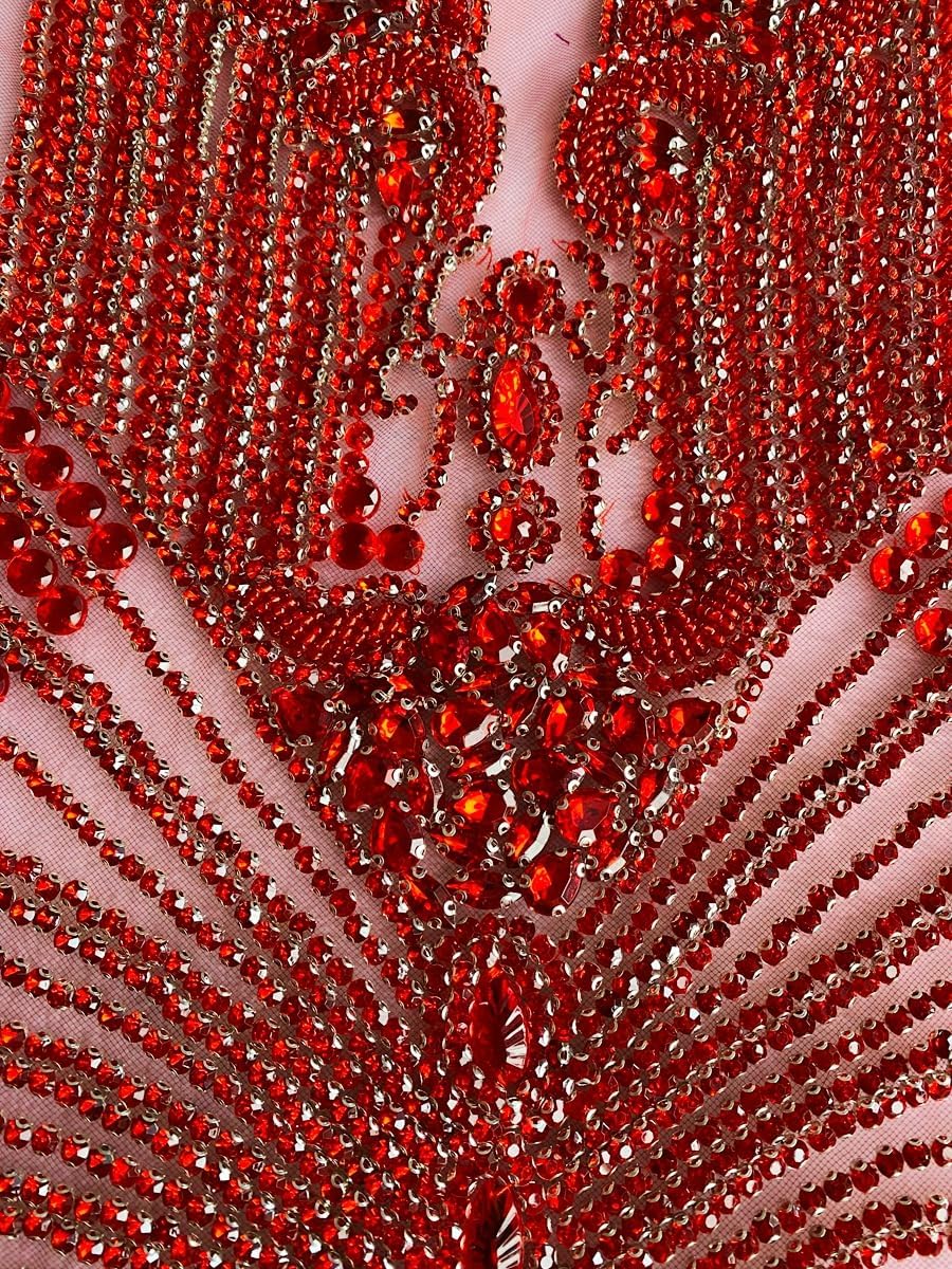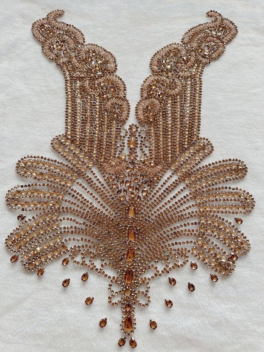 Large Bodice Applique Sequin Rhinestones Fine Appliques Handsewing Crystals and Beads for Dress Clothes Accessories 9.4X23.6inches (Orange)
