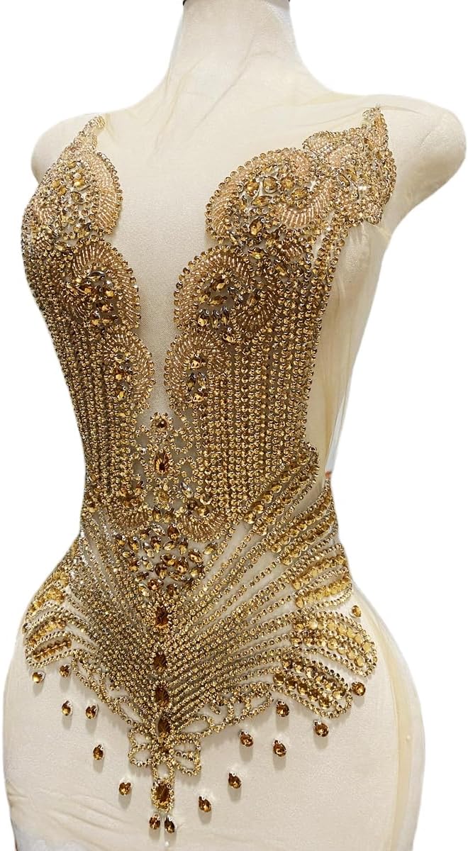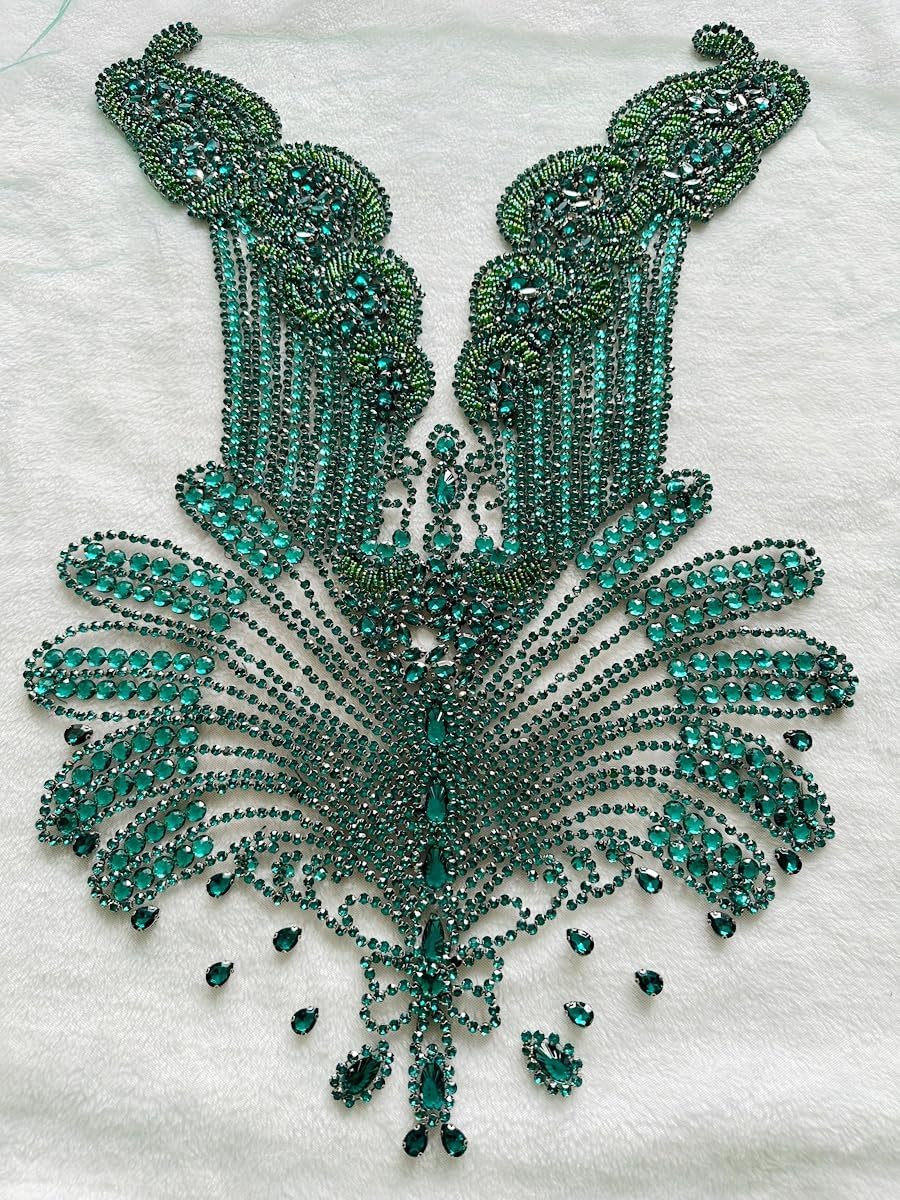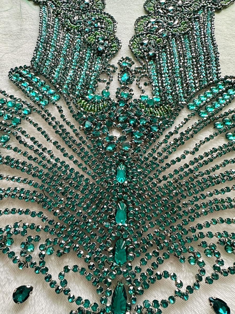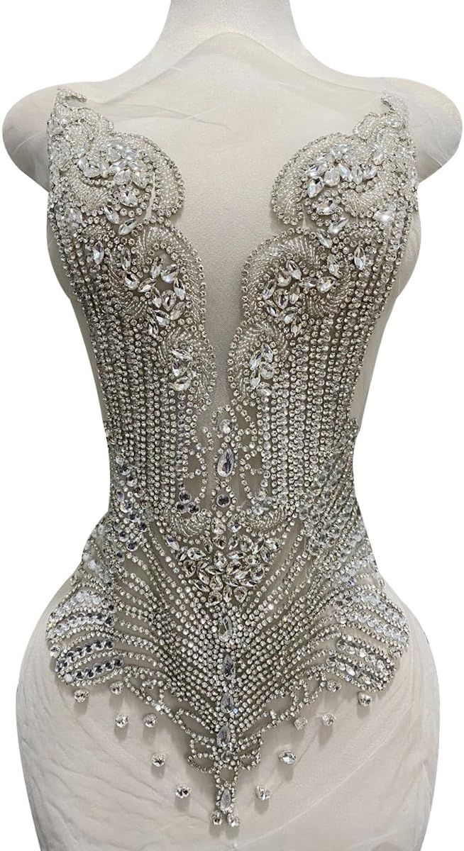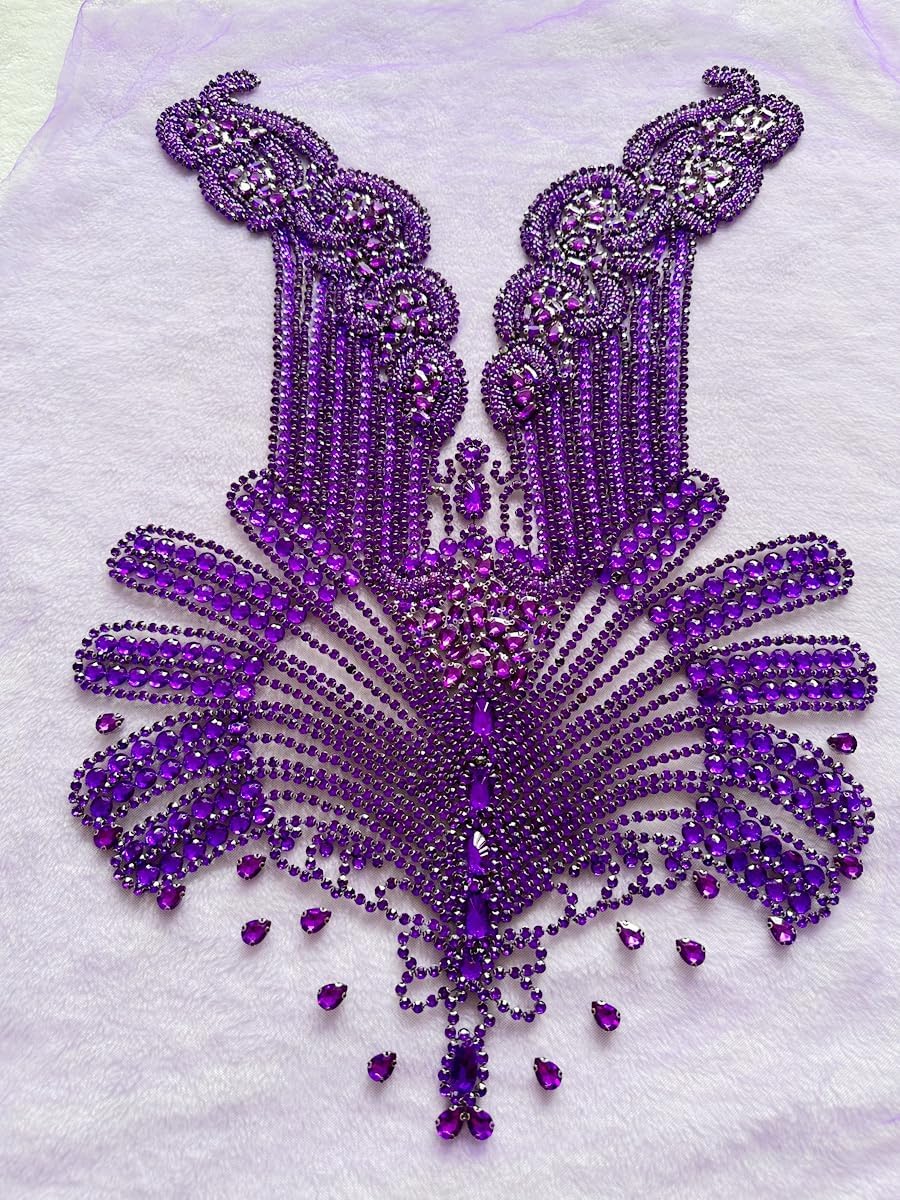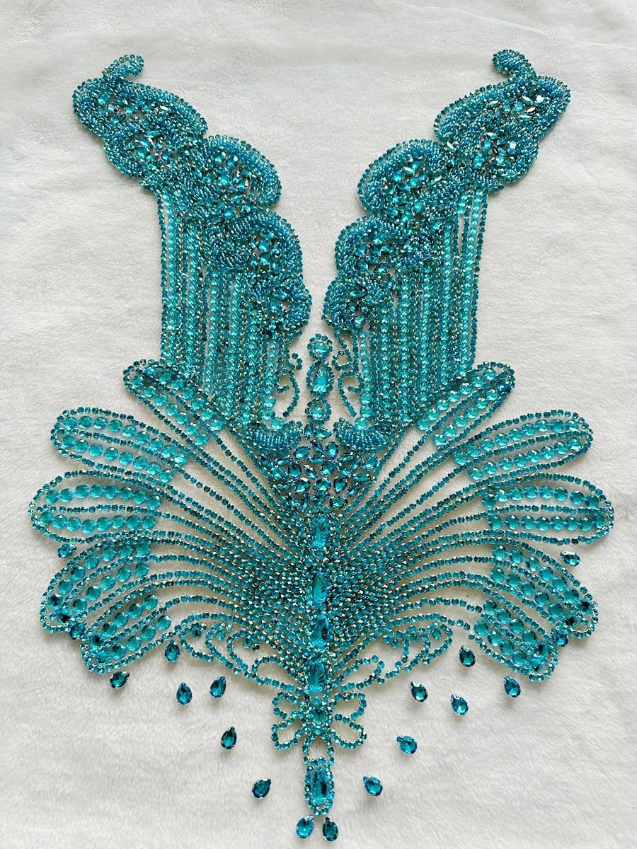 Large Bodice Applique Sequin Rhinestones Fine Appliques Handsewing Crystals and Beads for Dress Clothes Accessories 9.4X23.6inches (Orange)
