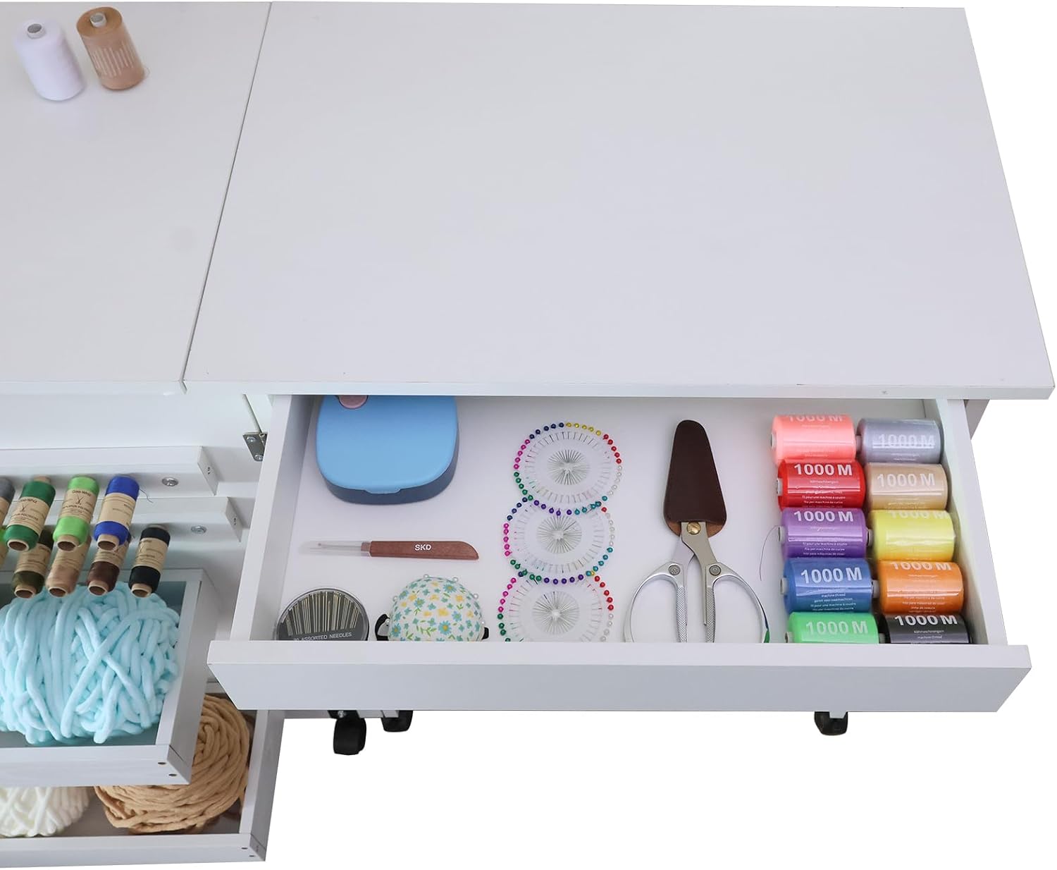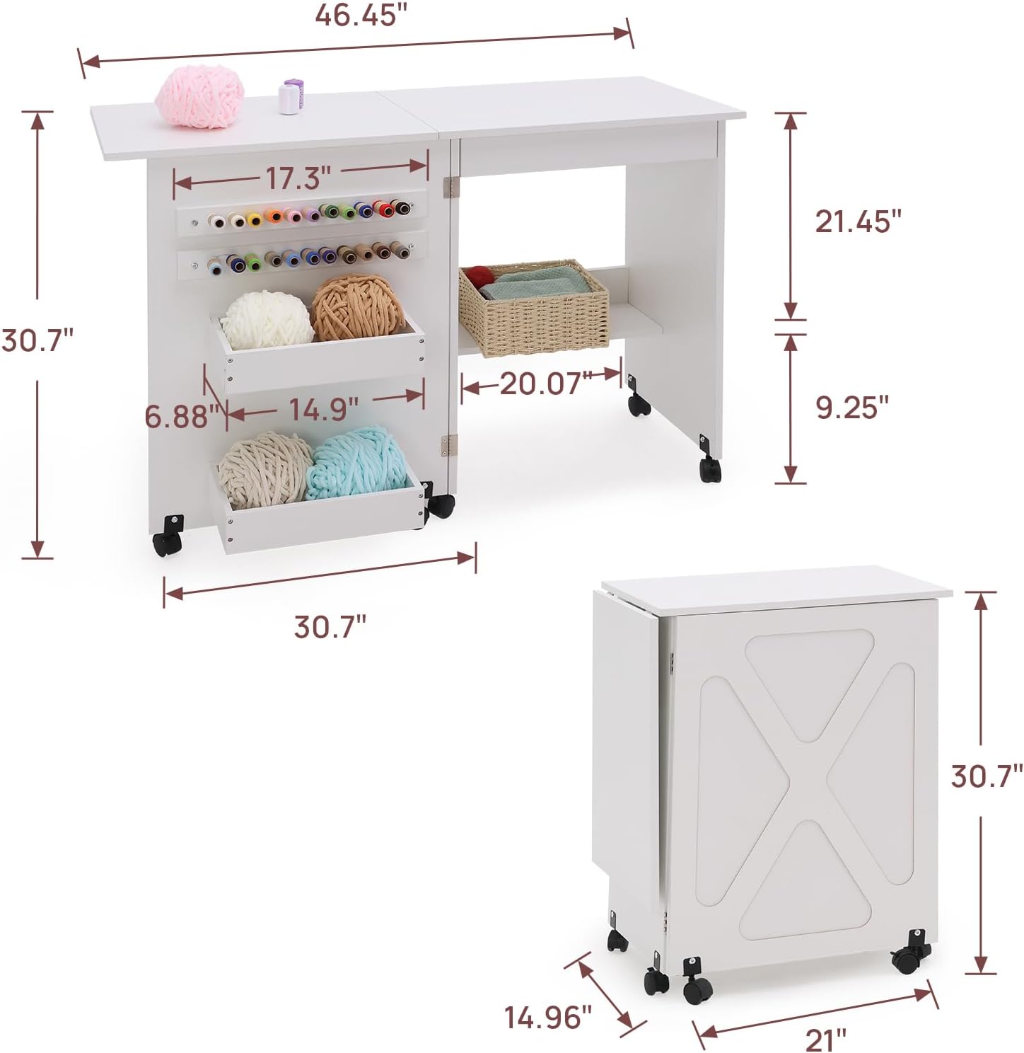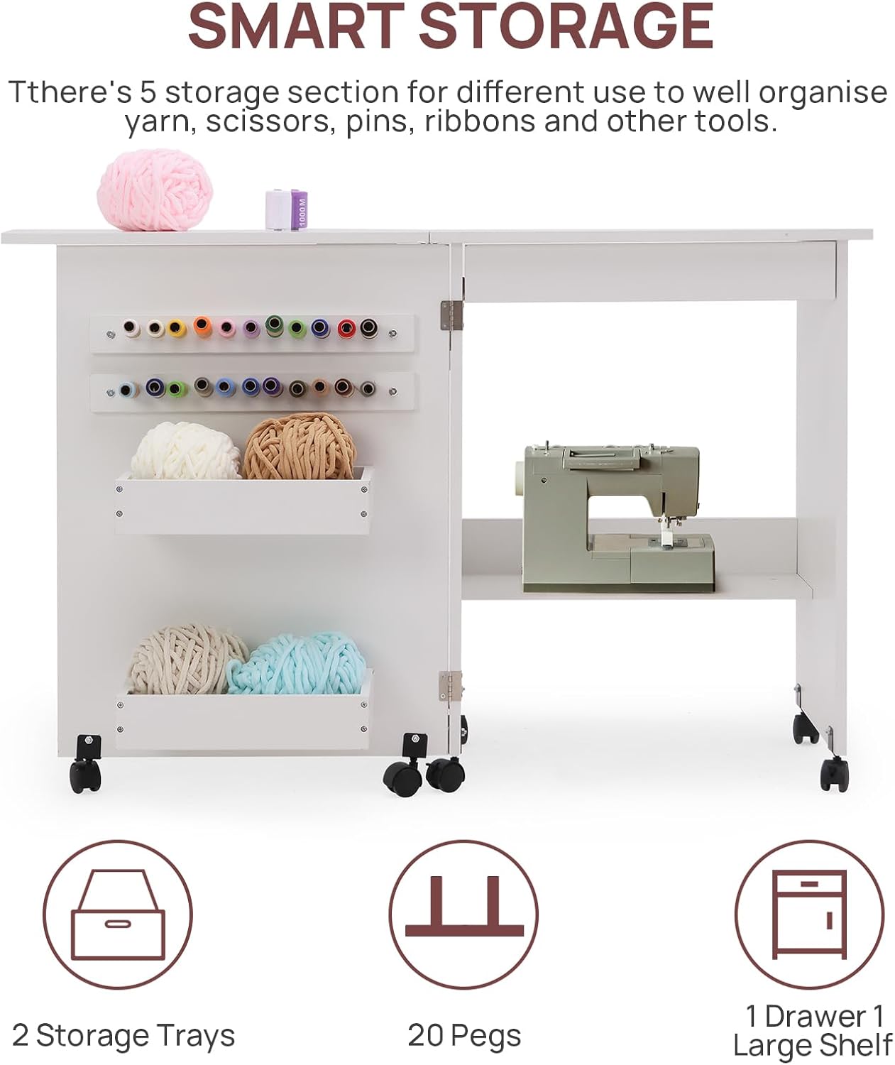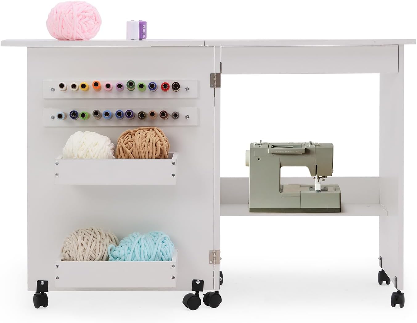 Folding Sewing Table Multipurpose Craft Station & Side Desk with Compact Design, Wheels with Locks,(White)